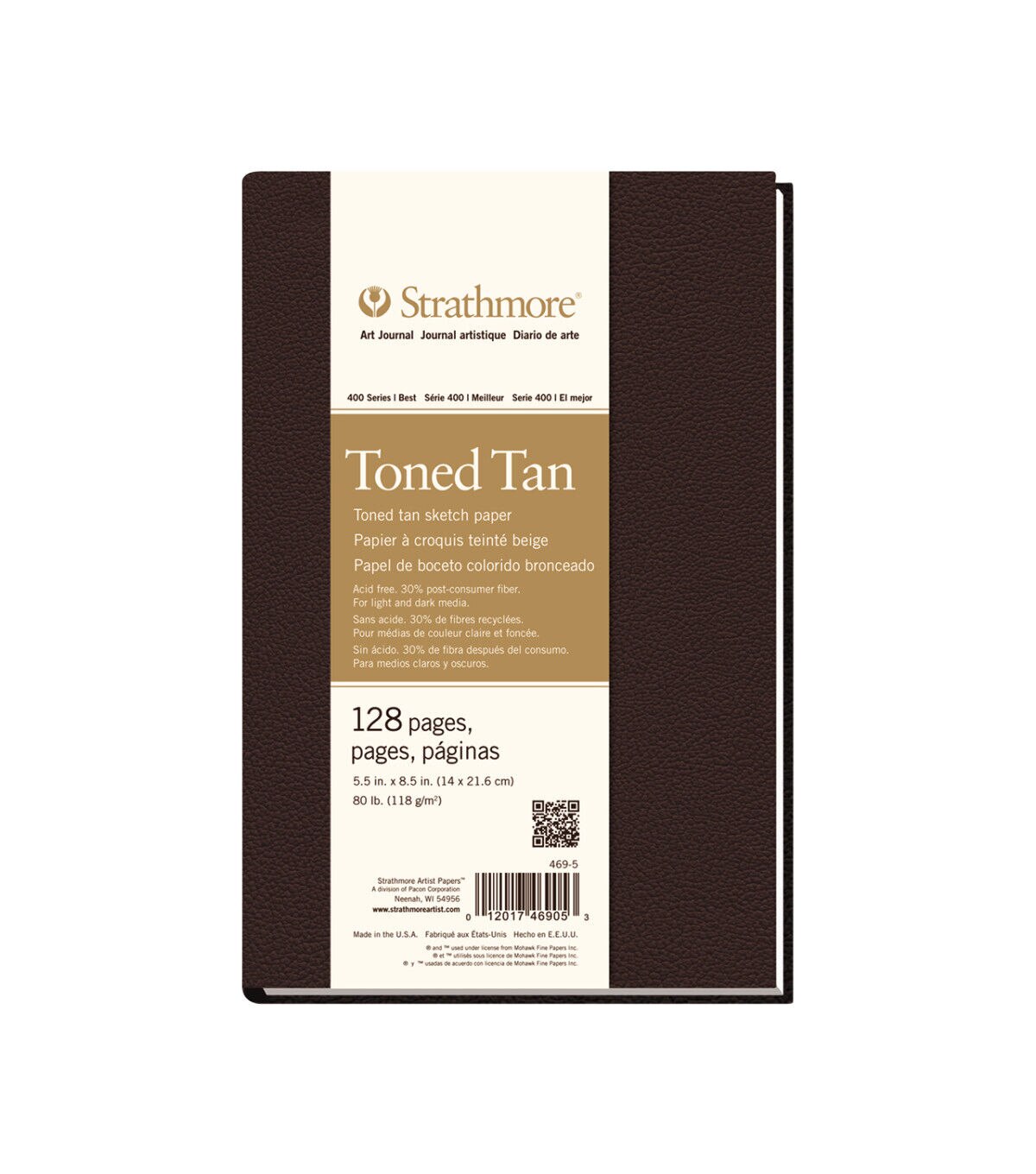 This Hardbound art book contains the same high-quality paper used in Strathmore fine art pads. The lightly-textured matte covers are a dark brown, with durable Smyth-sewn binding that allows pages to lay flat. The 400 Series Toned Sketch Art Book features medium-surface sketch paper that is great for light and dark media, graphite, chalk, charcoal, sketching stick, marker, china marker, colored pencil, pen and white gel pen. The paper contains 30% post-consumer fiber and is 100% recycled.