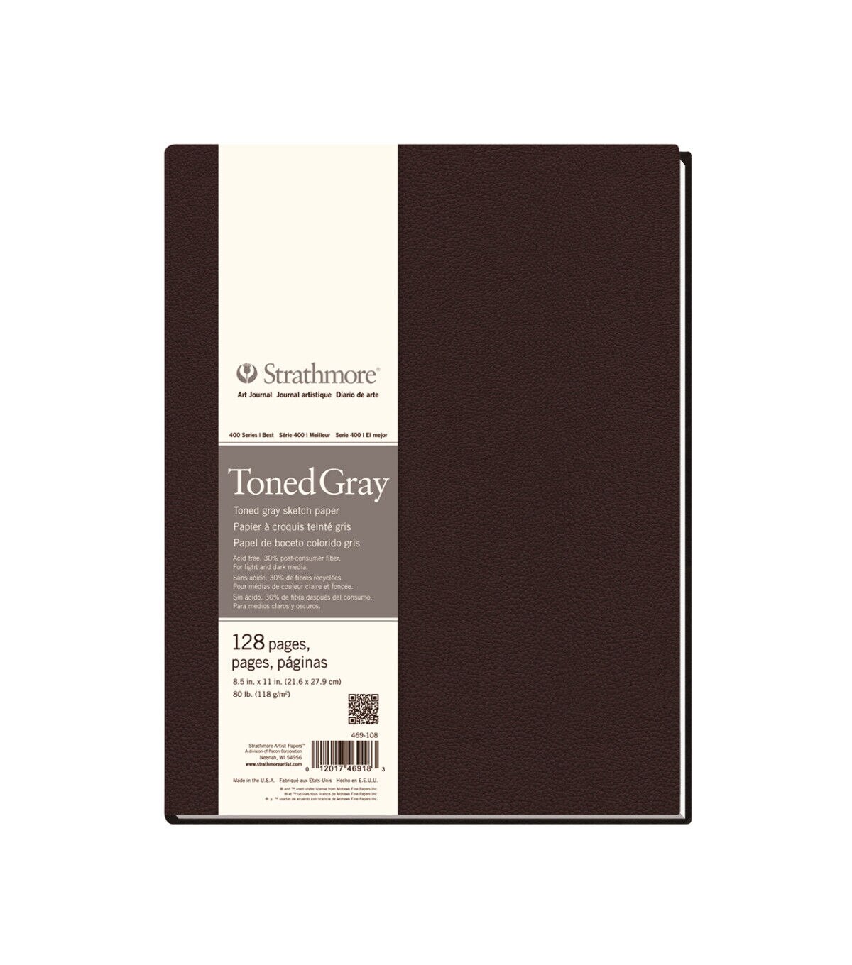 This Hardbound art book contains the same high-quality paper used in Strathmore fine art pads. The lightly-textured matte covers are a dark brown, with durable Smyth-sewn binding that allows pages to lay flat. The 400 Series Toned Sketch Art Book features medium-surface sketch paper that is great for light and dark media, graphite, chalk, charcoal, sketching stick, marker, china marker, colored pencil, pen and white gel pen. The paper contains 30% post-consumer fiber and is 100% recycled.