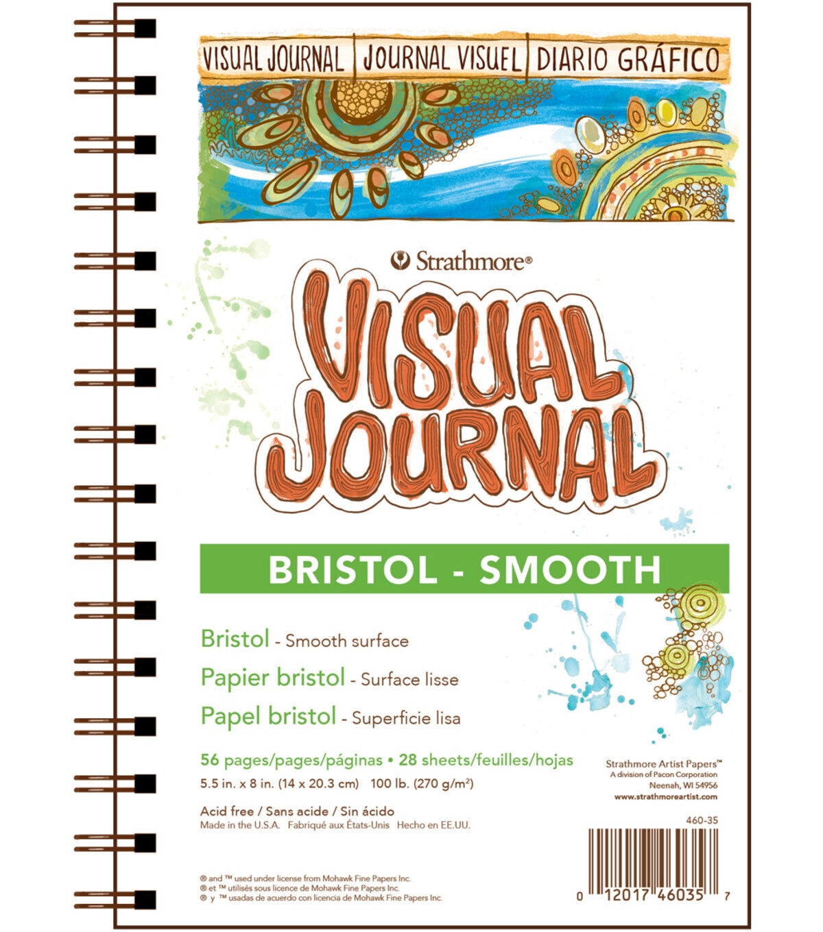Strathmore-Visual Journal: Bristol Smooth. This package contains one 8x5-1/2 inch spiral-bound art pad. It is filled with fifty-six pages of 100-pound Bristol paper with a smooth surface. It is excellent for traditional and specialty pen and ink techniques, marker, and collage. Acid free. Made in USA.