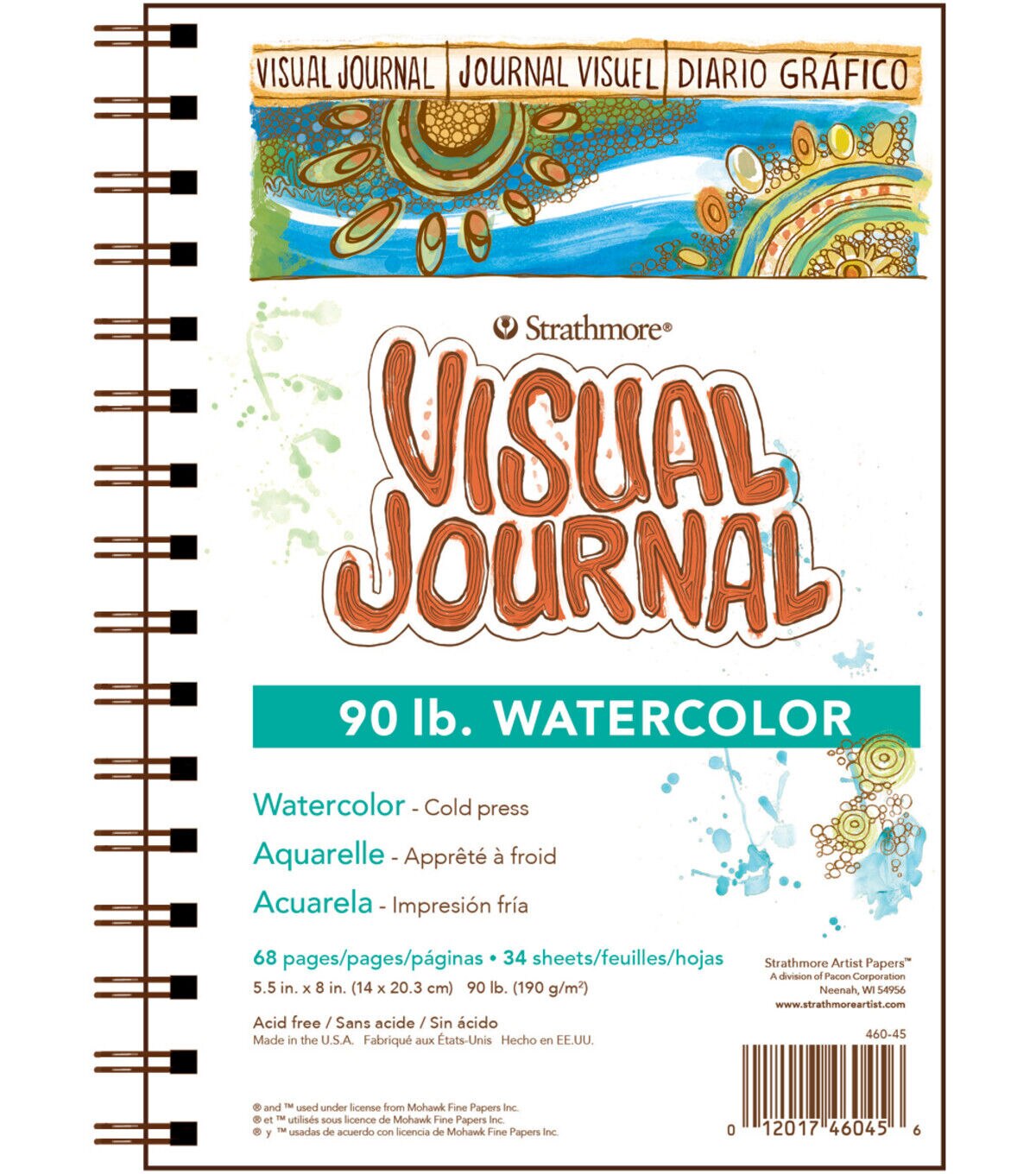 Strathmore-Visual Journal: Watercolor. This package contains one 8x5-1/2 inch spiral-bound art pad. It is filled with sixty-eight pages of 90-pound cold-press paper. It is great for watercolor, acrylic and collage, and can also be used with pen and ink, pencil, and marker. Acid free. Made in USA.