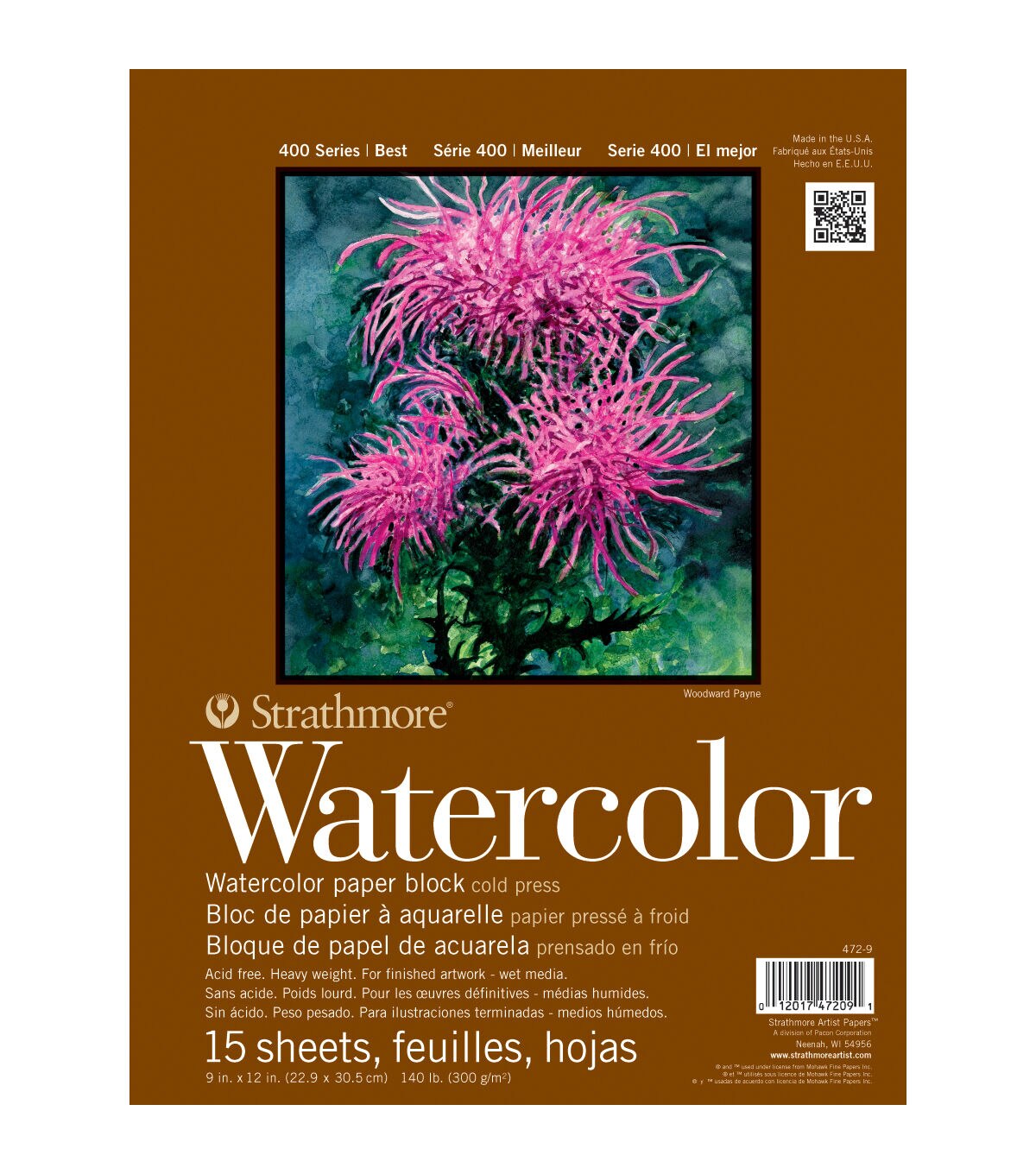 Pro Art-Strathmore Watercolor Block Paper Pad. A heavy-weight paper with a cold press finish ideal for mastering wet media techniques. This package contains one 12x9 inch watercolor pad with fifteen sheets of 140lb acid free cold press papers. Made in USA.
