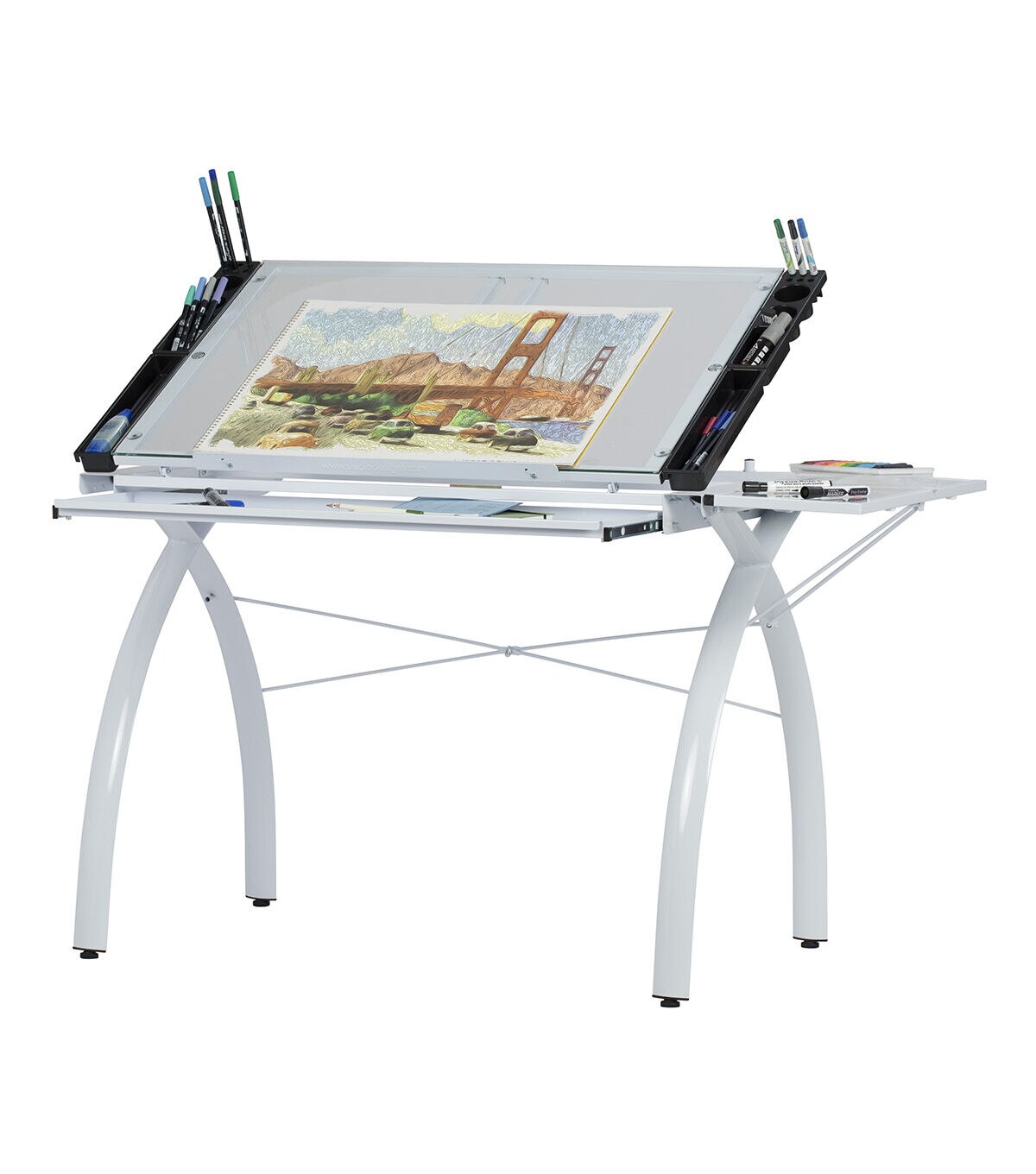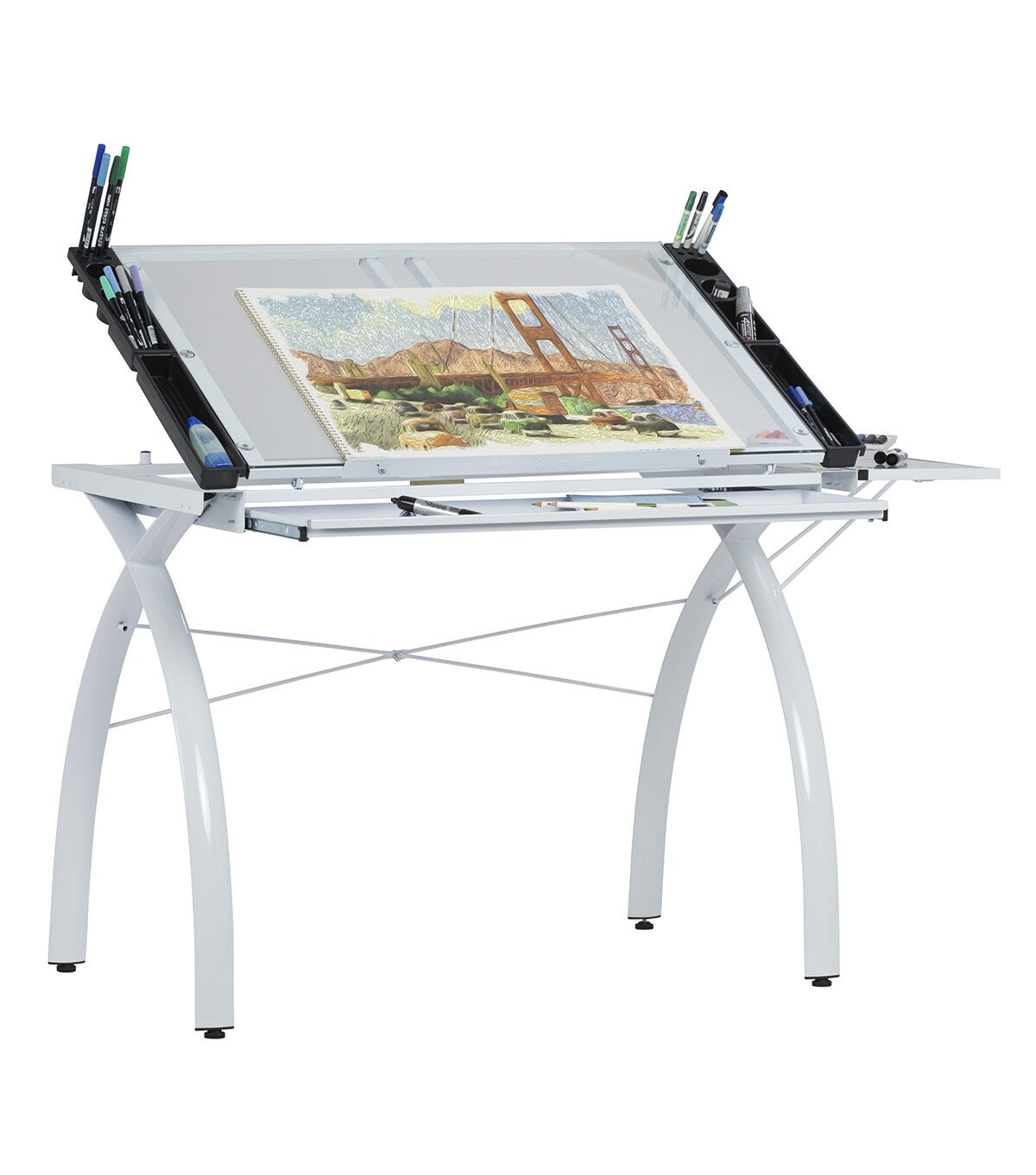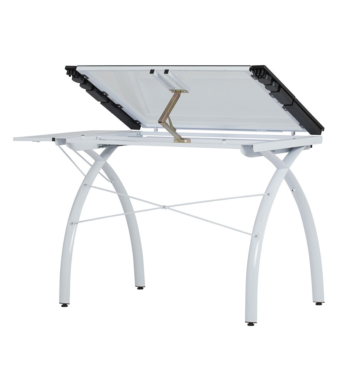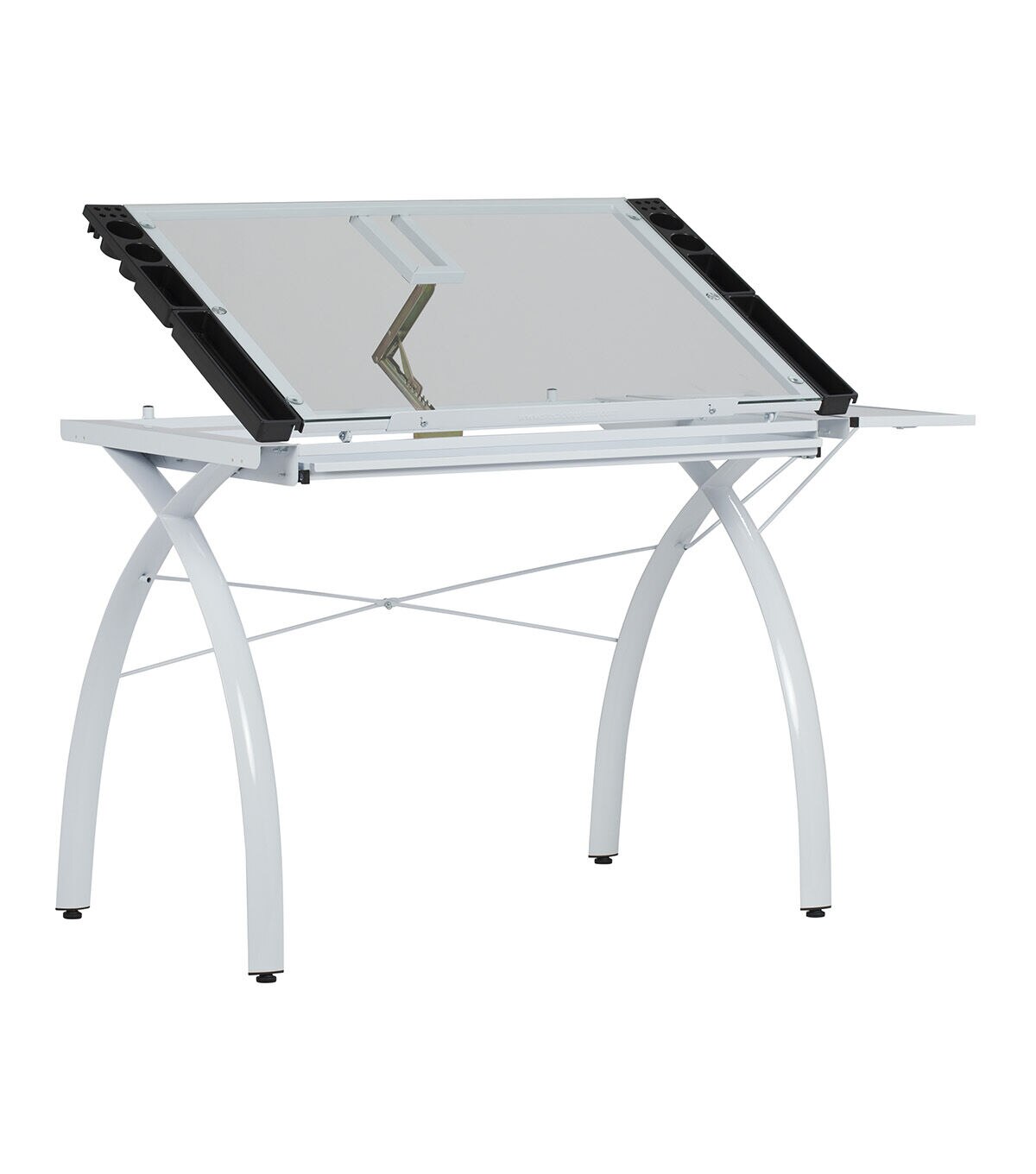 The perfect multi-functional contemporary table: Studio Designs' Futura Craft Station with Folding Shelf is great for drafting, drawing, or crafting on its large tempered safety-glass work surface. Its main work surface consists of a 35.5"W x 23.75"D glass top that can also be used as a light table, and can adjust up to 35 degrees. It also includes a 9.5" x 23.75" flip up side shelf for that additional flat workspace. Other features include a large pencil drawer, and 4 removable side trays for supplies. A 24” pencil ledge slides up and locks into place if you'd rather keep pens, pencils, or brushes on the table top. Constructed of heavy gauge, powder-coated steel for durability and 4 floor levelers for stability. Available styles: Silver/Blue Glass, Black/Clear Glass, White/ Clear Glass. Main work surface: 35.5''W x 23.75''D. Pencil drawer dimensions: 34.5''W x 9.25"D. Overall dimensions: 50.25"W x 23.75"D x 31.5"H