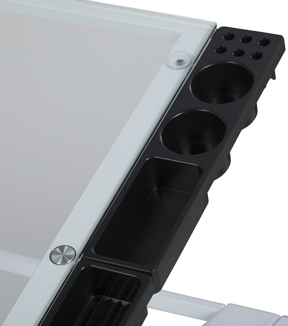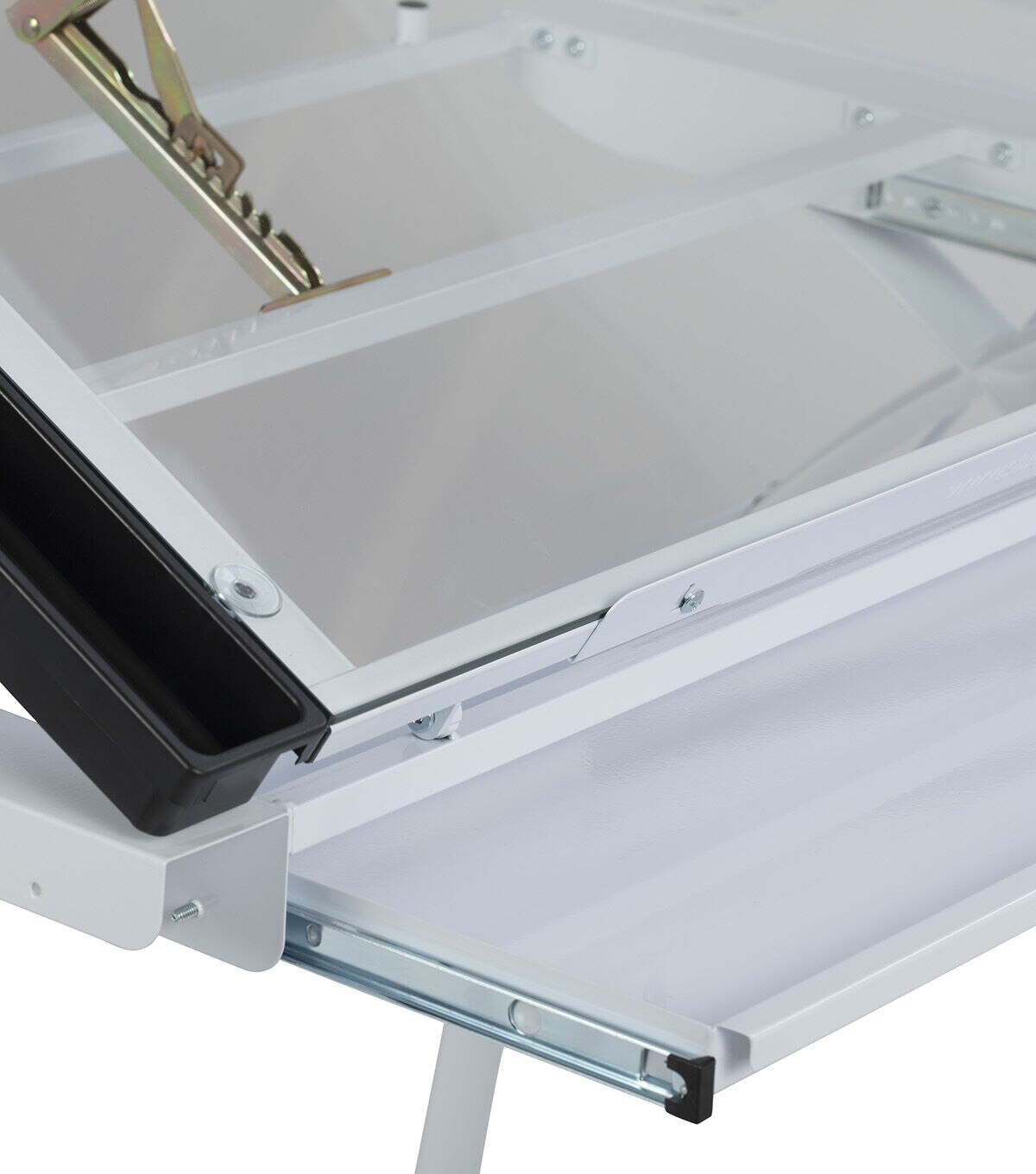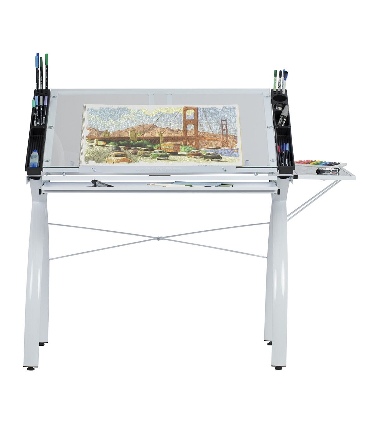 The perfect multi-functional contemporary table: Studio Designs' Futura Craft Station with Folding Shelf is great for drafting, drawing, or crafting on its large tempered safety-glass work surface. Its main work surface consists of a 35.5"W x 23.75"D glass top that can also be used as a light table, and can adjust up to 35 degrees. It also includes a 9.5" x 23.75" flip up side shelf for that additional flat workspace. Other features include a large pencil drawer, and 4 removable side trays for supplies. A 24” pencil ledge slides up and locks into place if you'd rather keep pens, pencils, or brushes on the table top. Constructed of heavy gauge, powder-coated steel for durability and 4 floor levelers for stability. Available styles: Silver/Blue Glass, Black/Clear Glass, White/ Clear Glass. Main work surface: 35.5''W x 23.75''D. Pencil drawer dimensions: 34.5''W x 9.25"D. Overall dimensions: 50.25"W x 23.75"D x 31.5"H