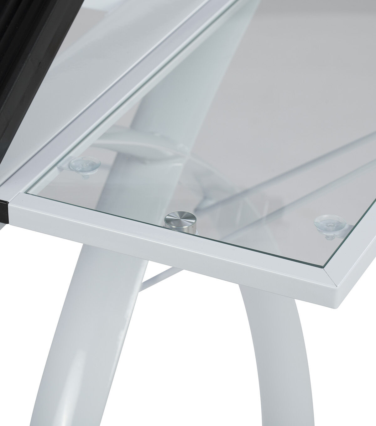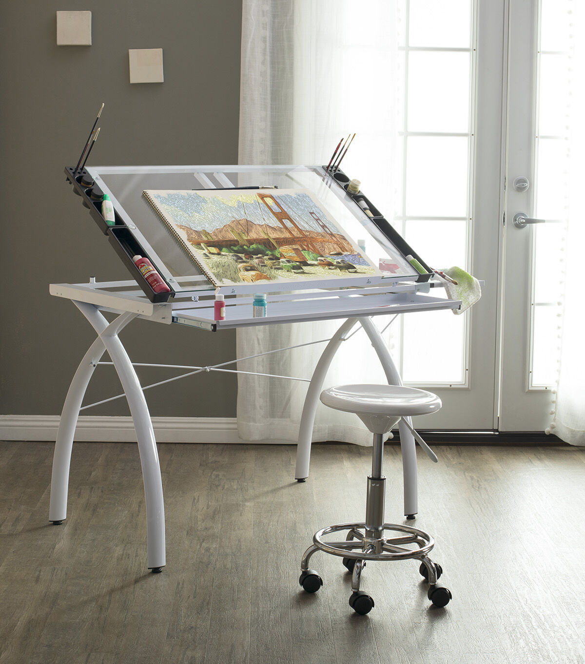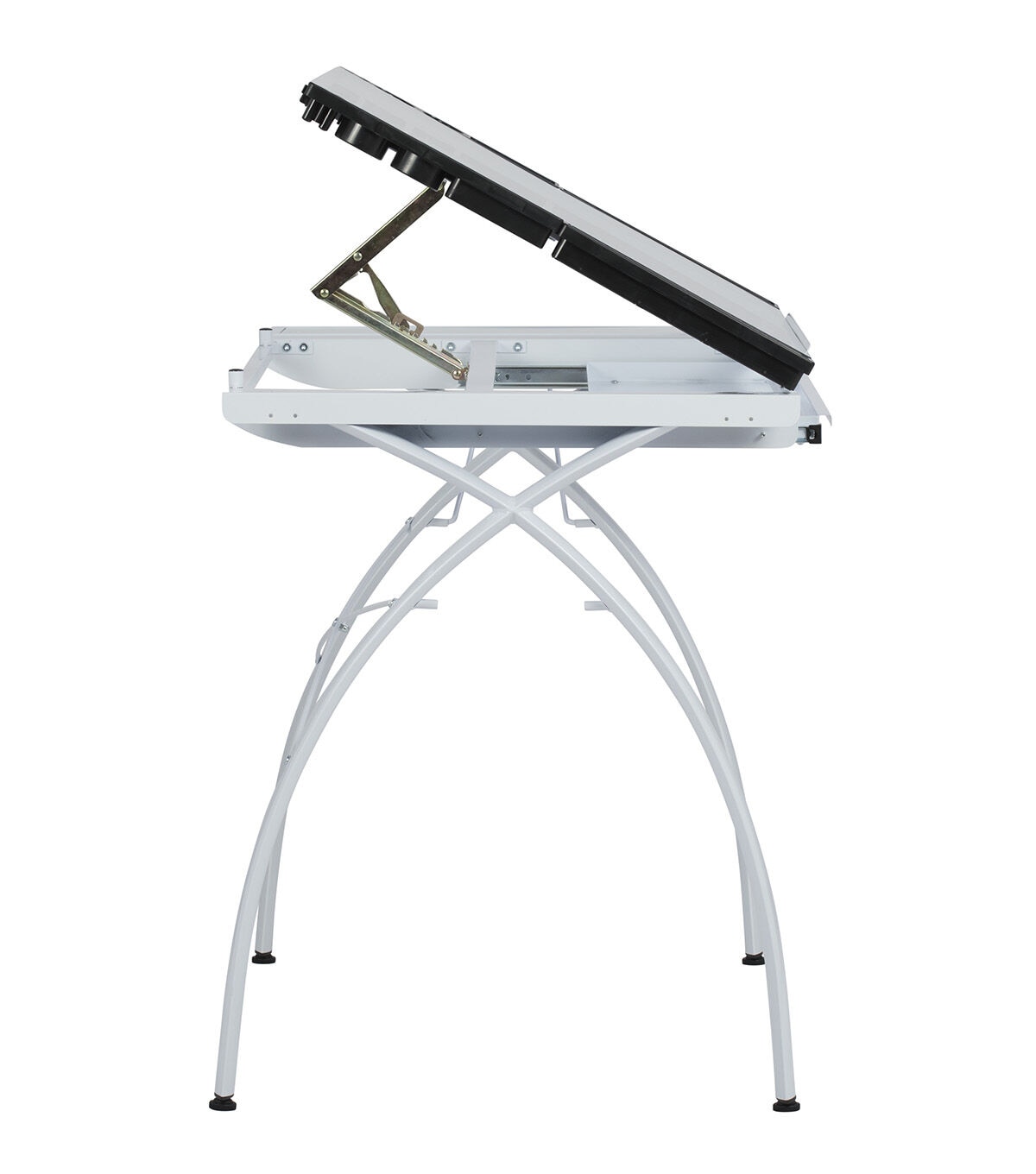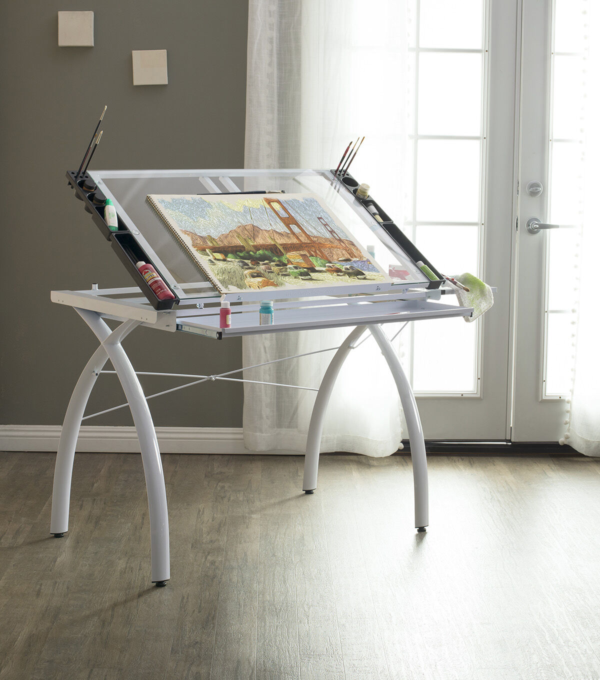 The perfect multi-functional contemporary table: Studio Designs' Futura Craft Station with Folding Shelf is great for drafting, drawing, or crafting on its large tempered safety-glass work surface. Its main work surface consists of a 35.5"W x 23.75"D glass top that can also be used as a light table, and can adjust up to 35 degrees. It also includes a 9.5" x 23.75" flip up side shelf for that additional flat workspace. Other features include a large pencil drawer, and 4 removable side trays for supplies. A 24” pencil ledge slides up and locks into place if you'd rather keep pens, pencils, or brushes on the table top. Constructed of heavy gauge, powder-coated steel for durability and 4 floor levelers for stability. Available styles: Silver/Blue Glass, Black/Clear Glass, White/ Clear Glass. Main work surface: 35.5''W x 23.75''D. Pencil drawer dimensions: 34.5''W x 9.25"D. Overall dimensions: 50.25"W x 23.75"D x 31.5"H