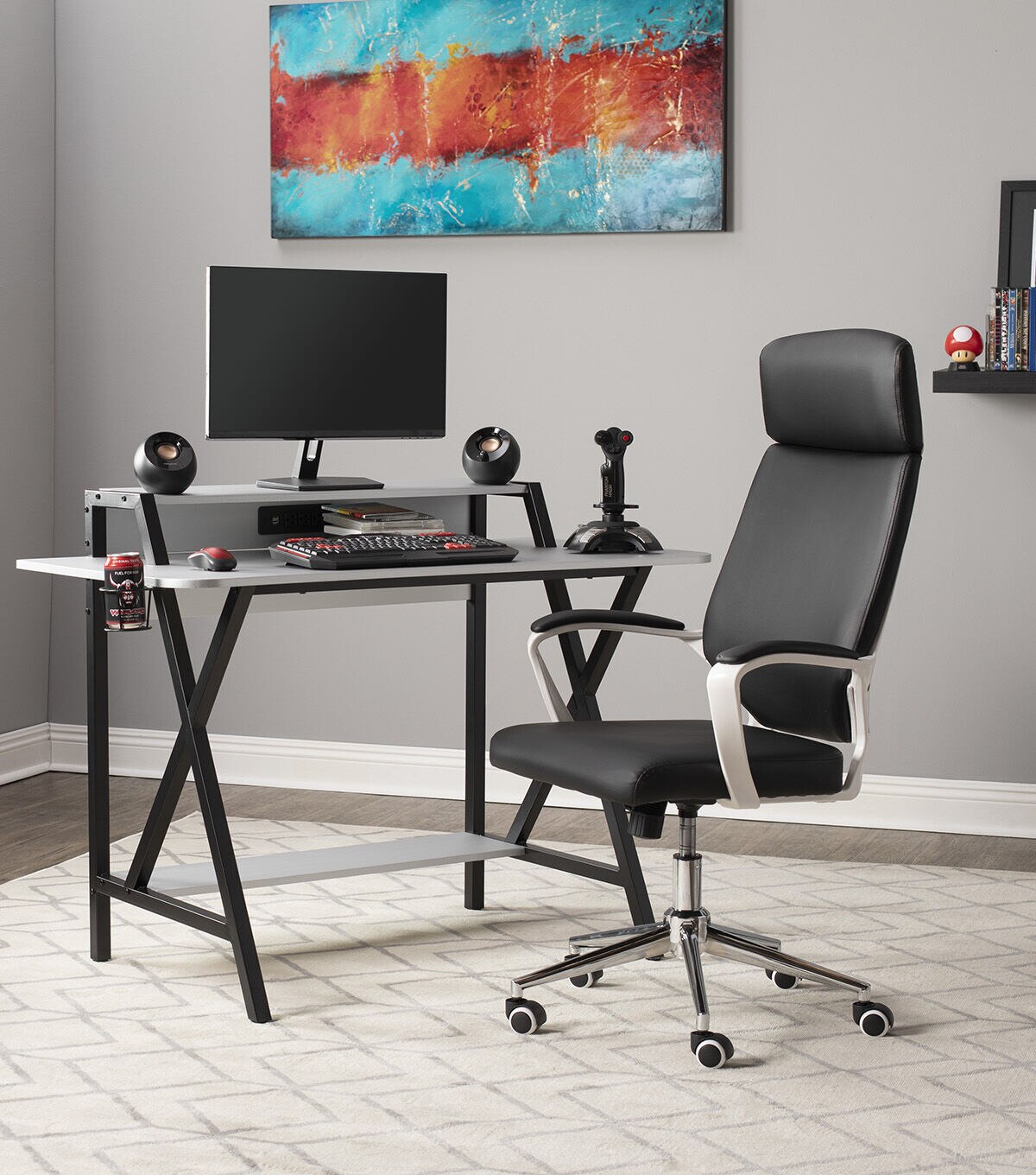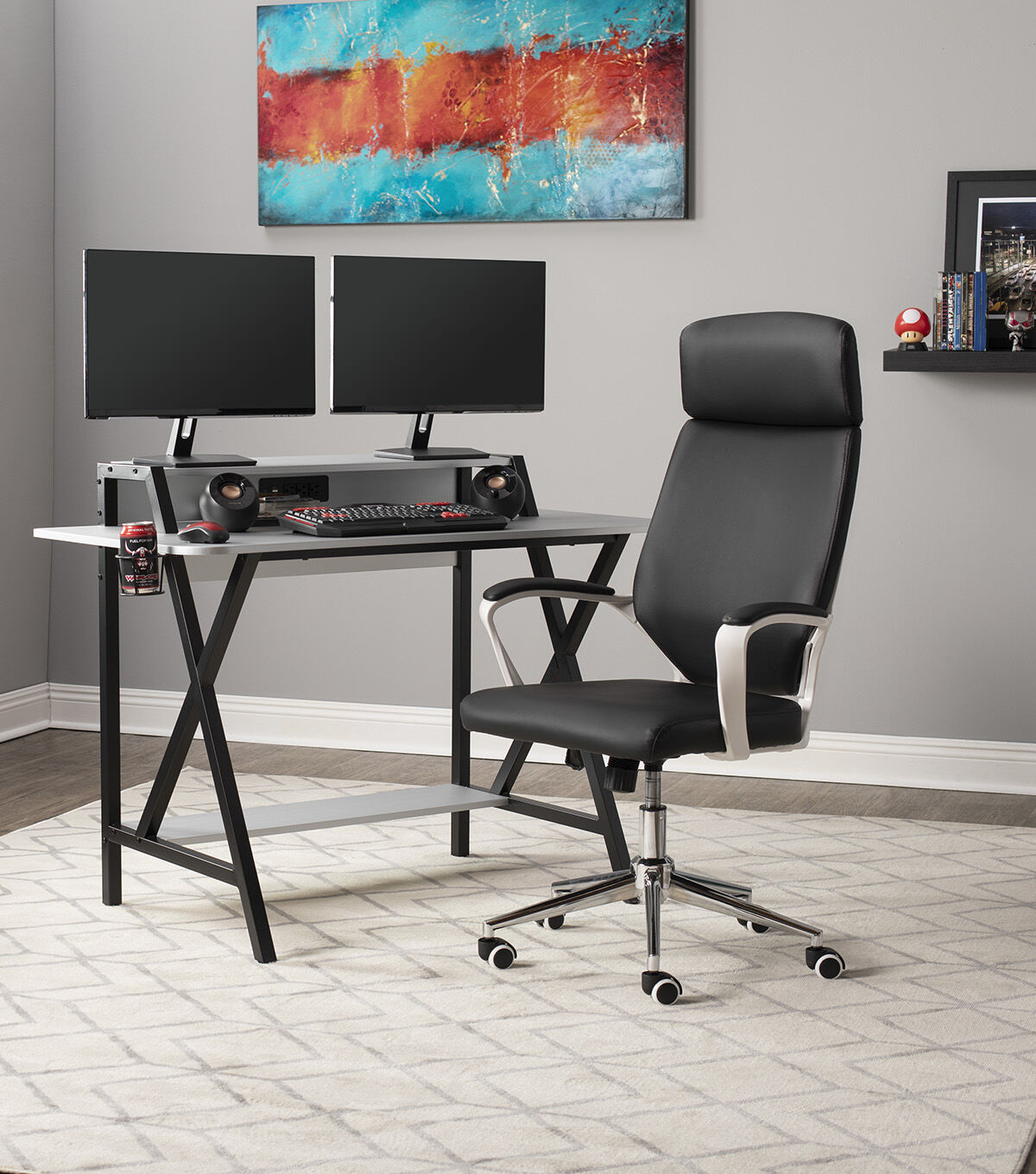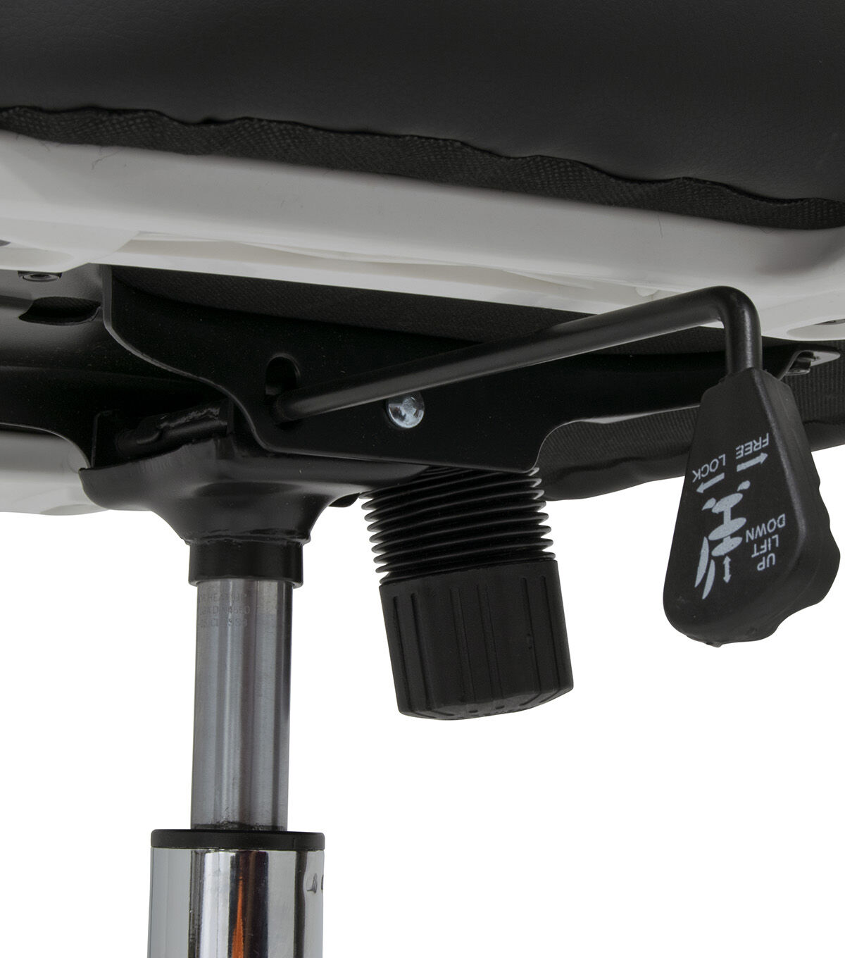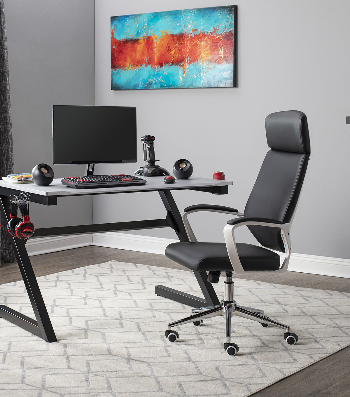 The High Back, Height/Tilt Adjustable, Modern Executive Chair with Padded Arms and Chrome Base by Calico Designs combines a sleek white glossy frame with a modern, durable PU (vegan leather) covered seat, arms and back. The 360-degree swivel seat (19.5" W x 19.5" D) adjusts in height from 18” to 21”. Use the height-adjustable lever to also adjust the tilt of the back angle. The tension control knob adjusts the ease or resistance of the tilt angle. The stylish, 5-star chrome base has casters that allow you to move the chair easily.