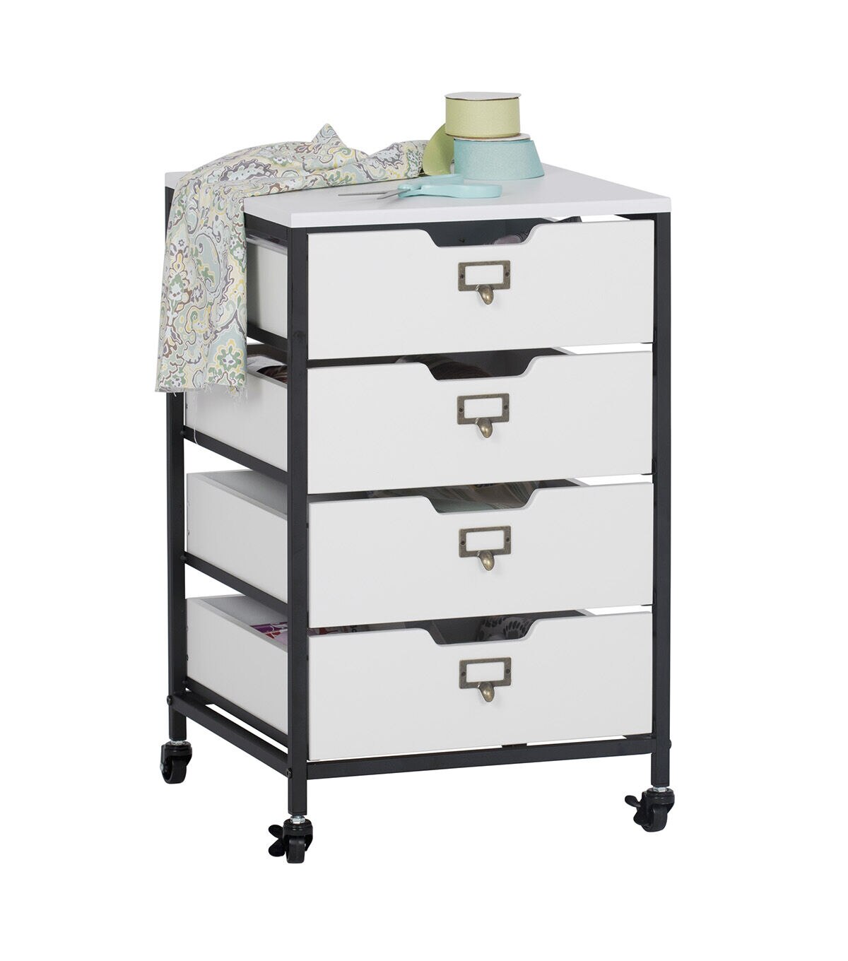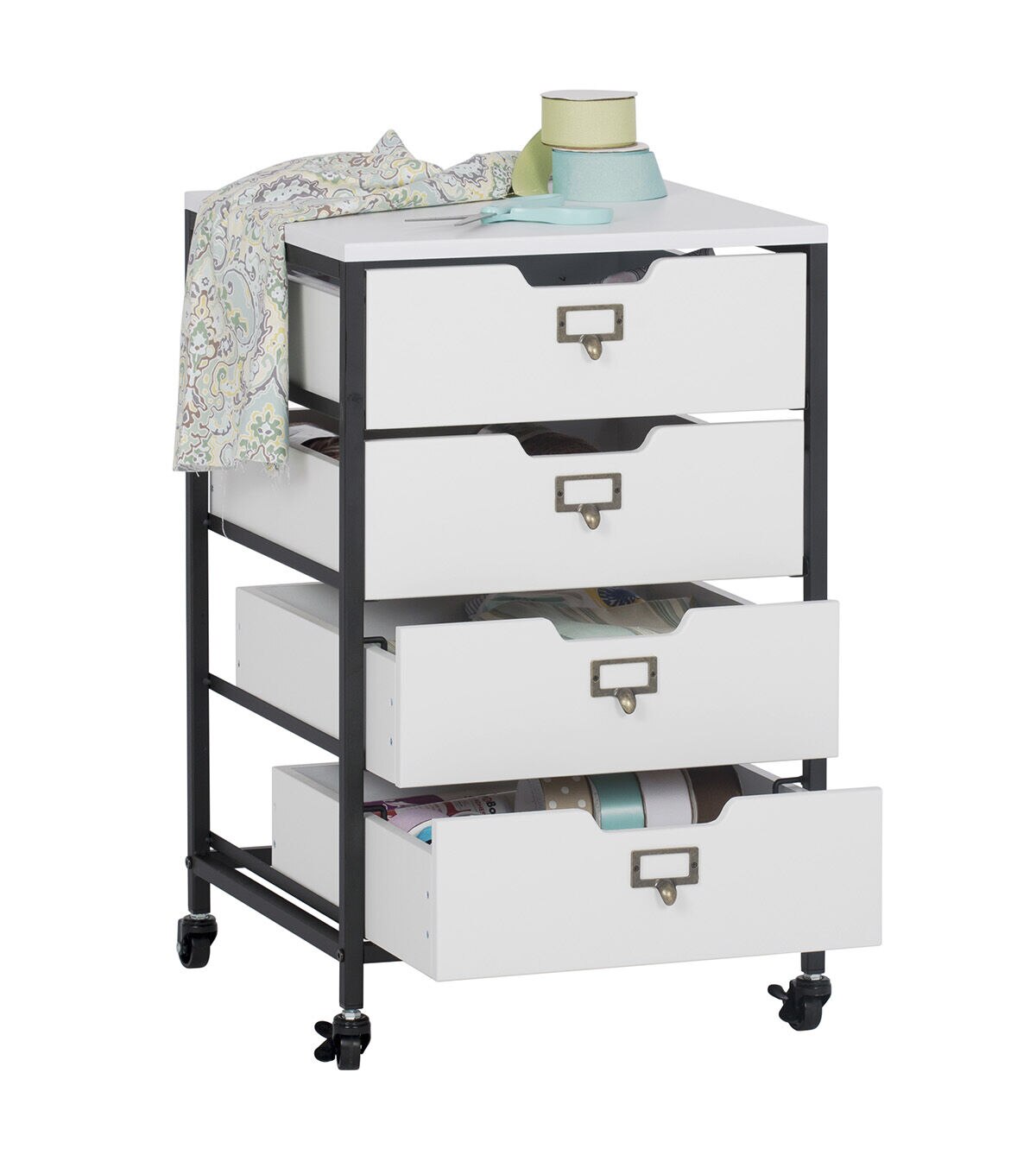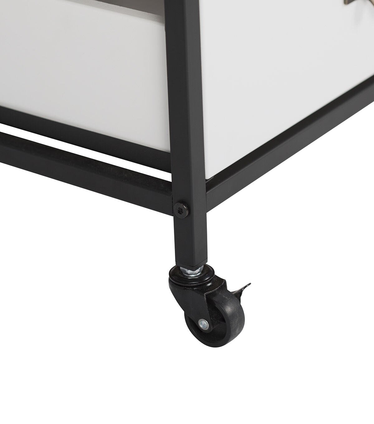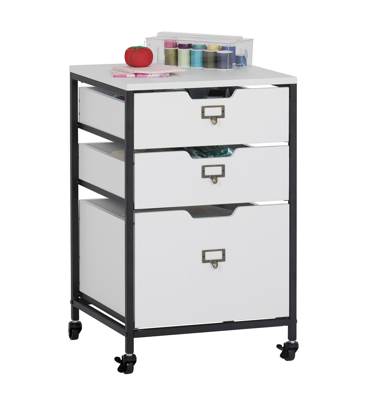 Our Sew Ready line of mobile storage carts offer an organized space for the many tools and accessories that can clutter a craft room. These versatile carts can be used in almost any room in the house: bathrooms, kitchen, playroom, home office or laundry room. The casters make it easy to move them across the room or from room to room. The front casters can be locked to keep it in place during projects. All drawers have a combination metal pull with label holder so you can list the contents inside. These carts are available in three configurations: 3-drawer (Item # 10223), 4-drawer (Item # 10224) or 3 open bins (Item # 10225).