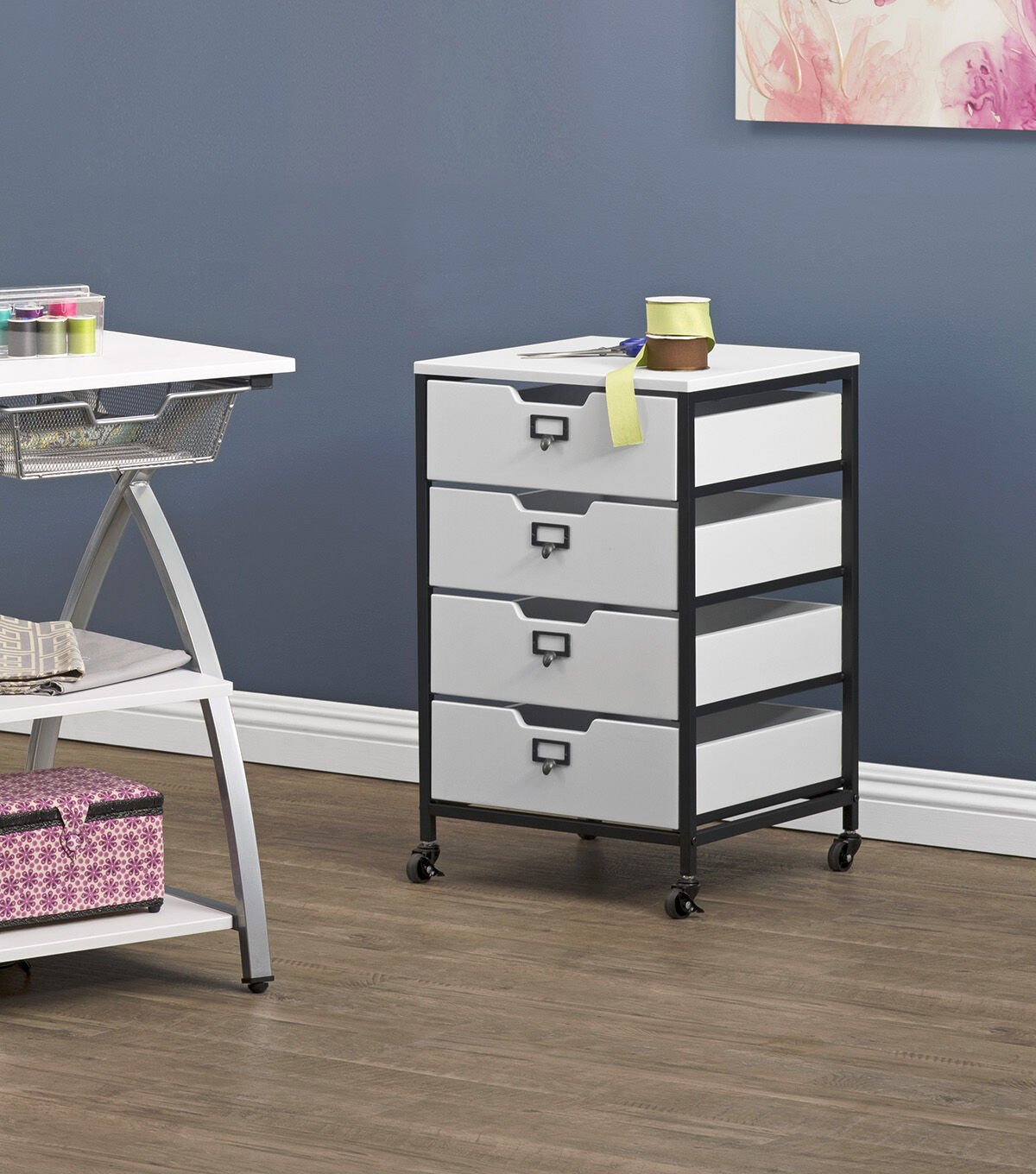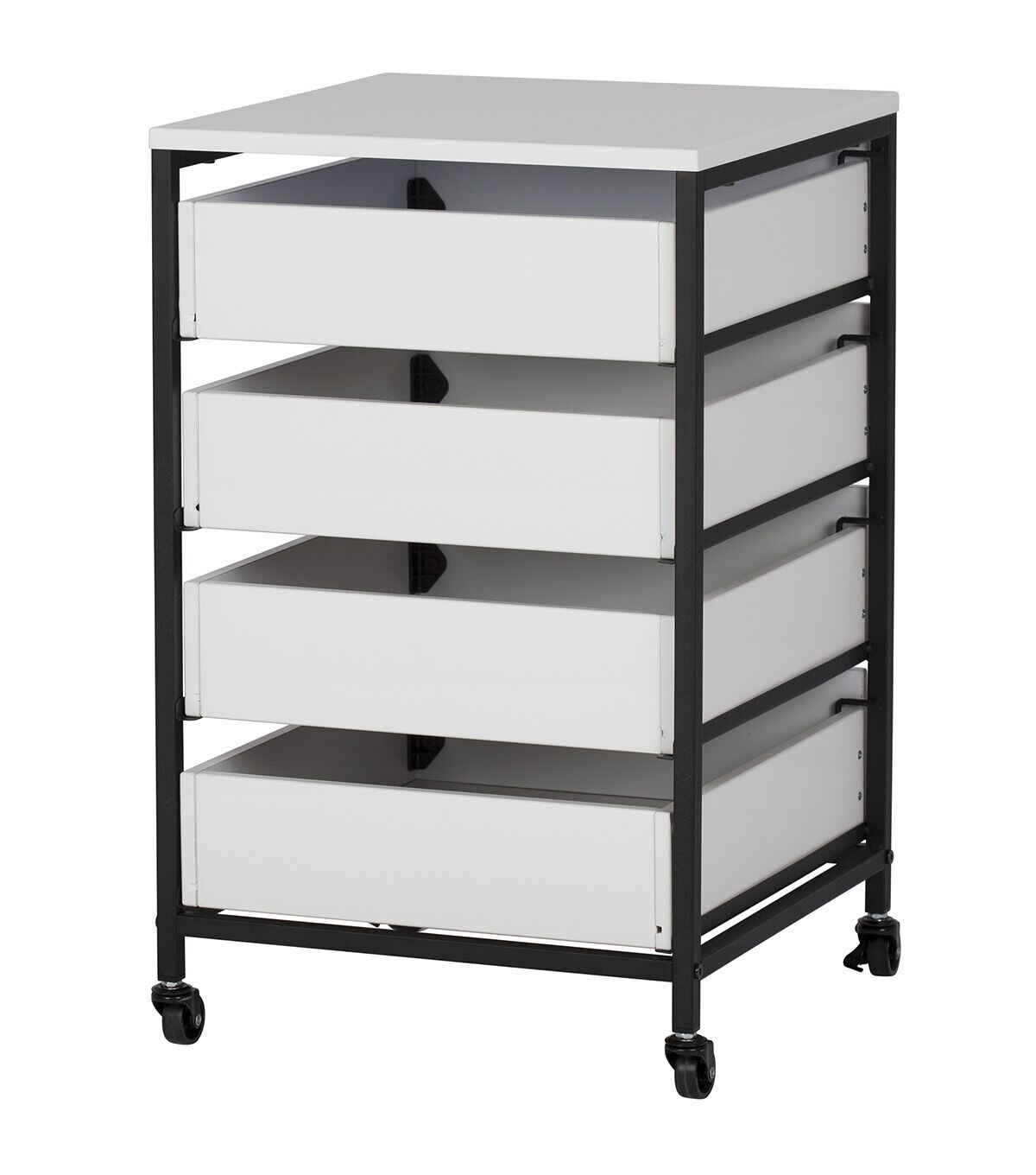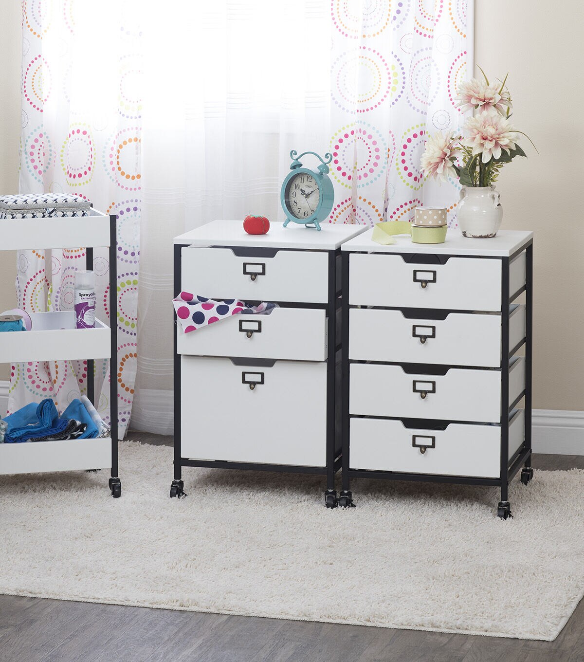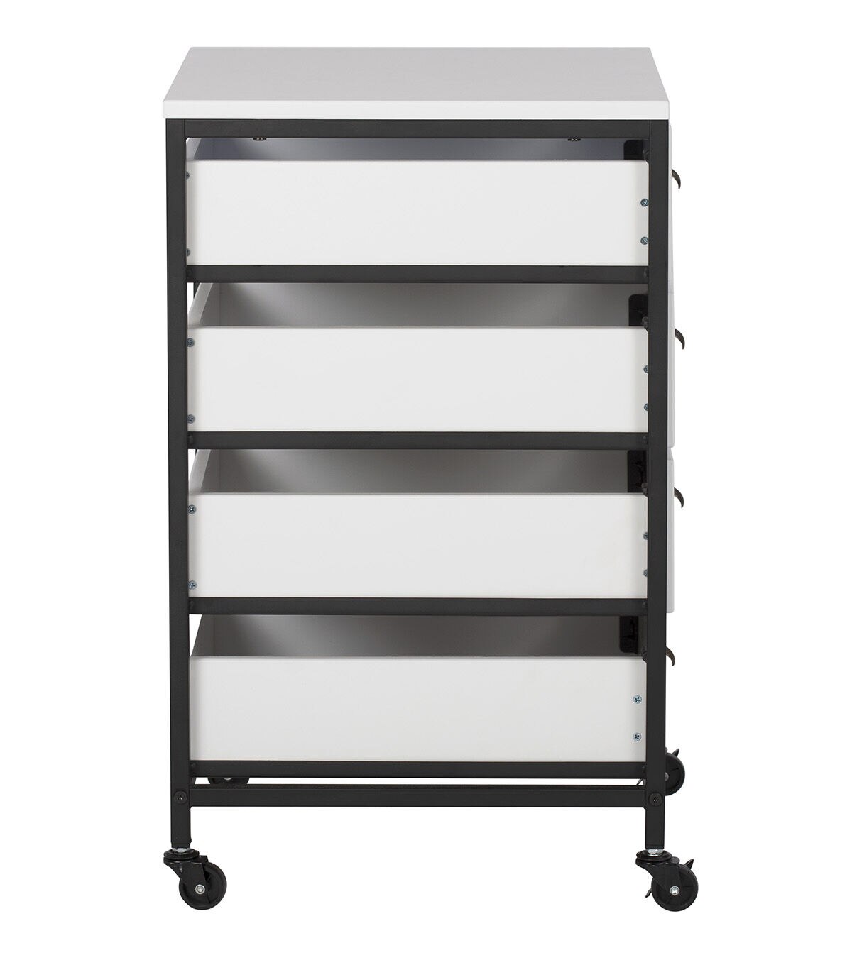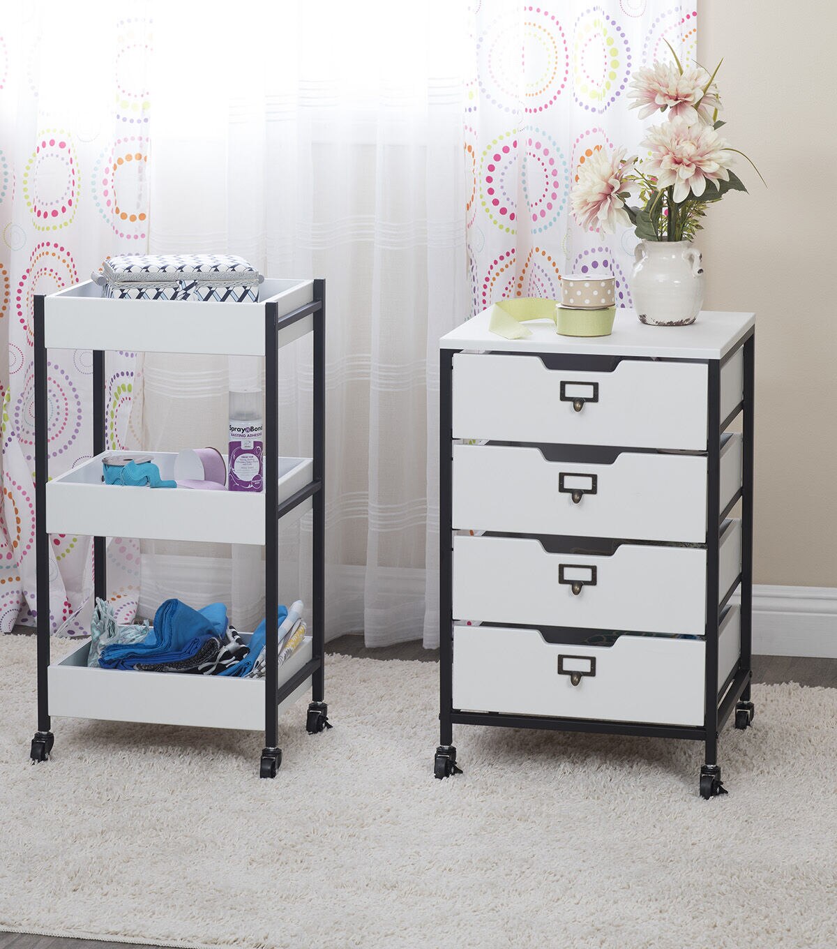 Our Sew Ready line of mobile storage carts offer an organized space for the many tools and accessories that can clutter a craft room. These versatile carts can be used in almost any room in the house: bathrooms, kitchen, playroom, home office or laundry room. The casters make it easy to move them across the room or from room to room. The front casters can be locked to keep it in place during projects. All drawers have a combination metal pull with label holder so you can list the contents inside. These carts are available in three configurations: 3-drawer (Item # 10223), 4-drawer (Item # 10224) or 3 open bins (Item # 10225).