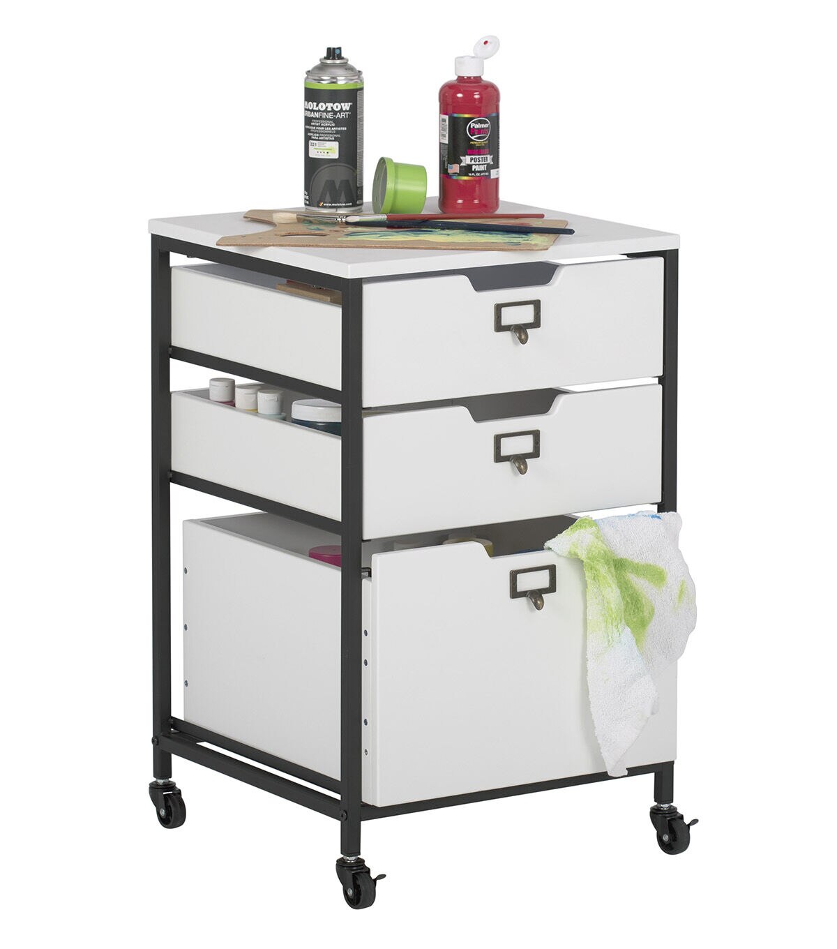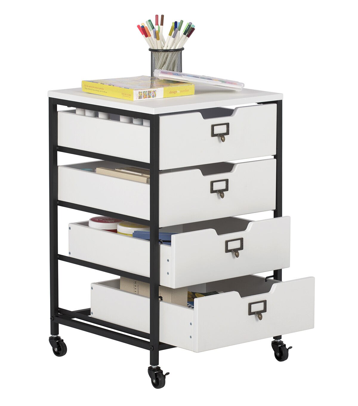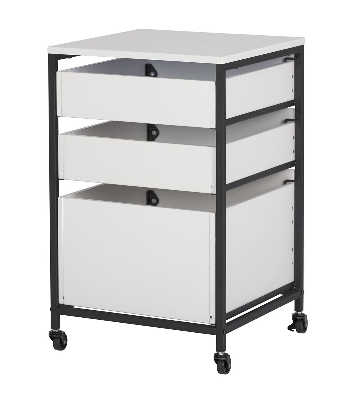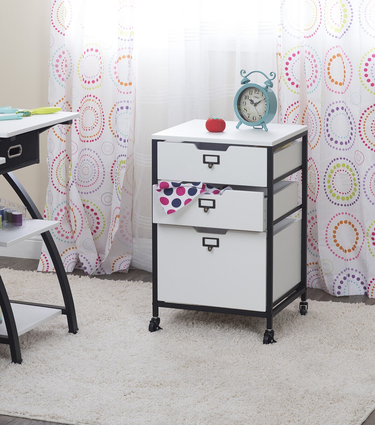 Our Sew Ready line of mobile storage carts offer an organized space for the many tools and accessories that can clutter a craft room. These versatile carts can be used in almost any room in the house: bathrooms, kitchen, playroom, home office or laundry room. The casters make it easy to move them across the room or from room to room. The front casters can be locked to keep it in place during projects. All drawers have a combination metal pull with label holder so you can list the contents inside. These carts are available in three configurations: 3-drawer (Item # 10223), 4-drawer (Item # 10224) or 3 open bins (Item # 10225).