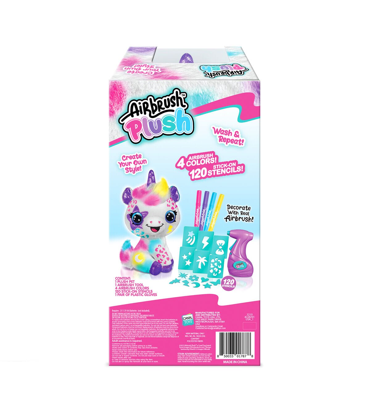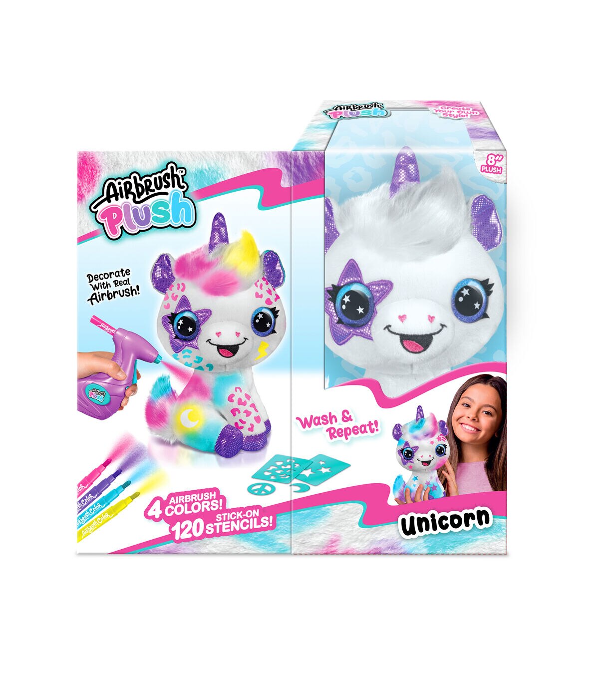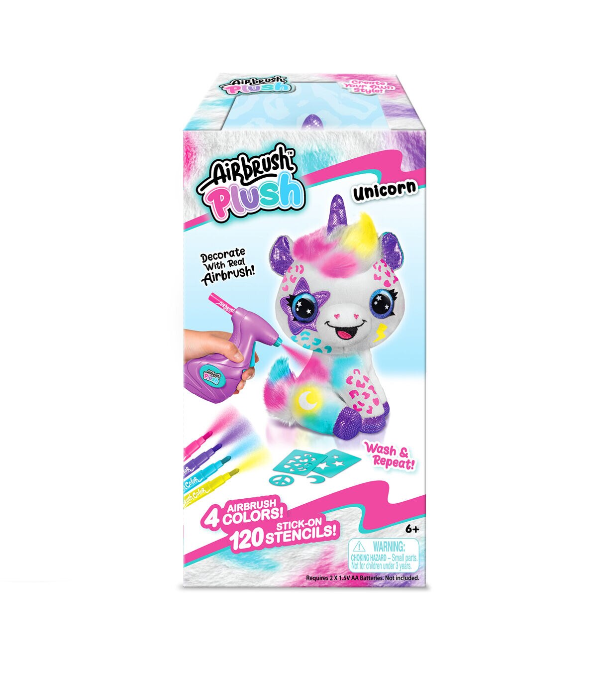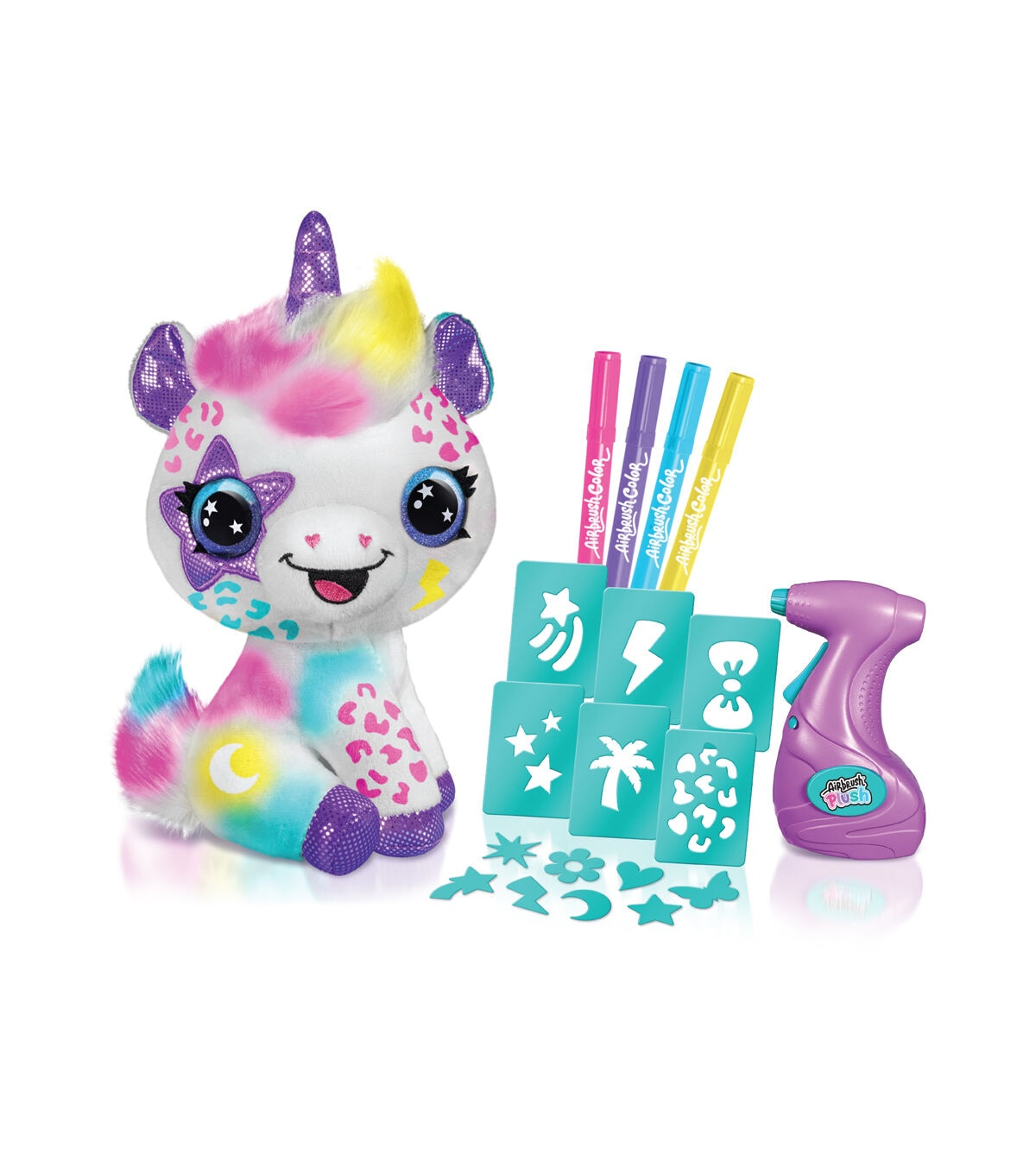 Customize your own adorable and soft plush unicorn! Design and create your own multicolored plush with the battery-powered airbrush gun and stick-on stencils. The real airbrush gun makes it so easy and satisfying to create trendy and cute multicolored plushies! This collectible plush looks brand new even after being washed, so the possibilities are endless. Redesign and update your plush with trendy and fun themes as your mood and style change!