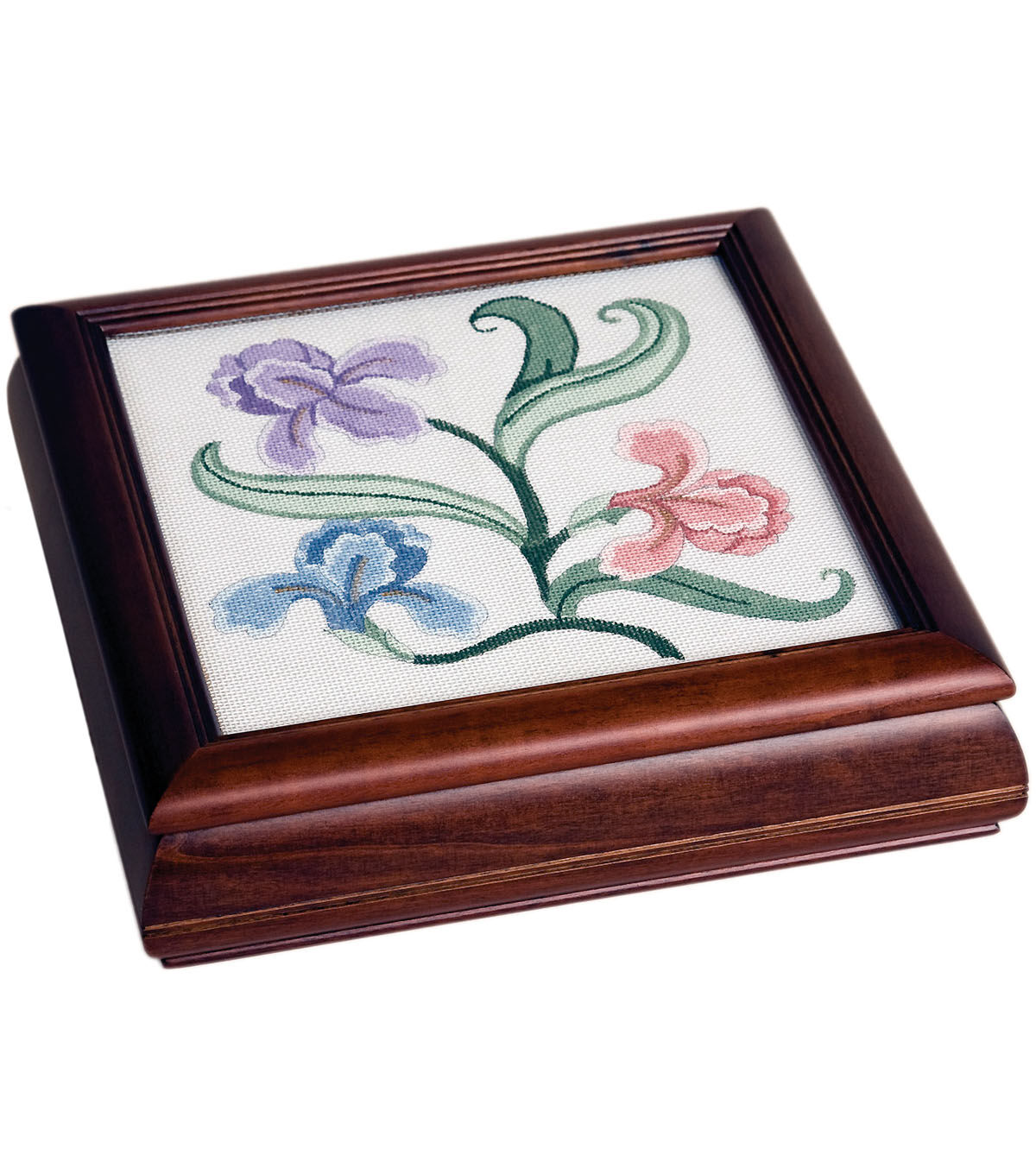 Artfully designed, this Sudberry House Mahogany Carol's Fancywork Box is a great gift for any occasion. Simply take off the back of the gold tone hinged lid, insert and arrange your photos, memorabilia or needlework projects and re-assemble it to transform it into a work of art. This needlework display box has a black felt bottom for added flair.