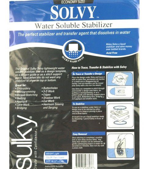 The Sulky Solvy Water Soluble Stabilizer is ideal for embroidery, monogramming, lace work, buttonholes and quilting projects. It is designed with a water-soluble backing which prevents puckering and shifting during stitching. It quickly dissolves under running water or when laundered, and tears away easily.