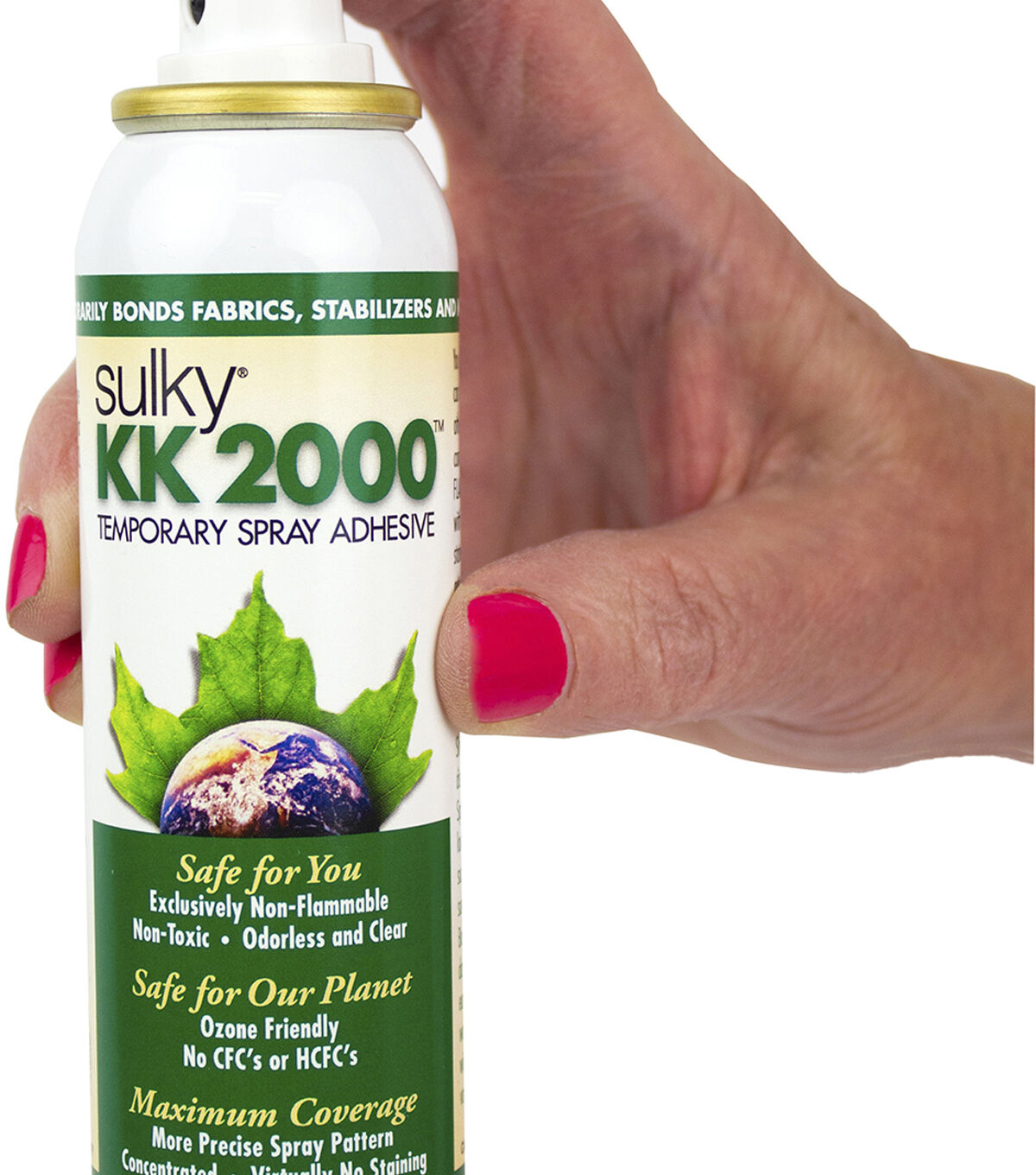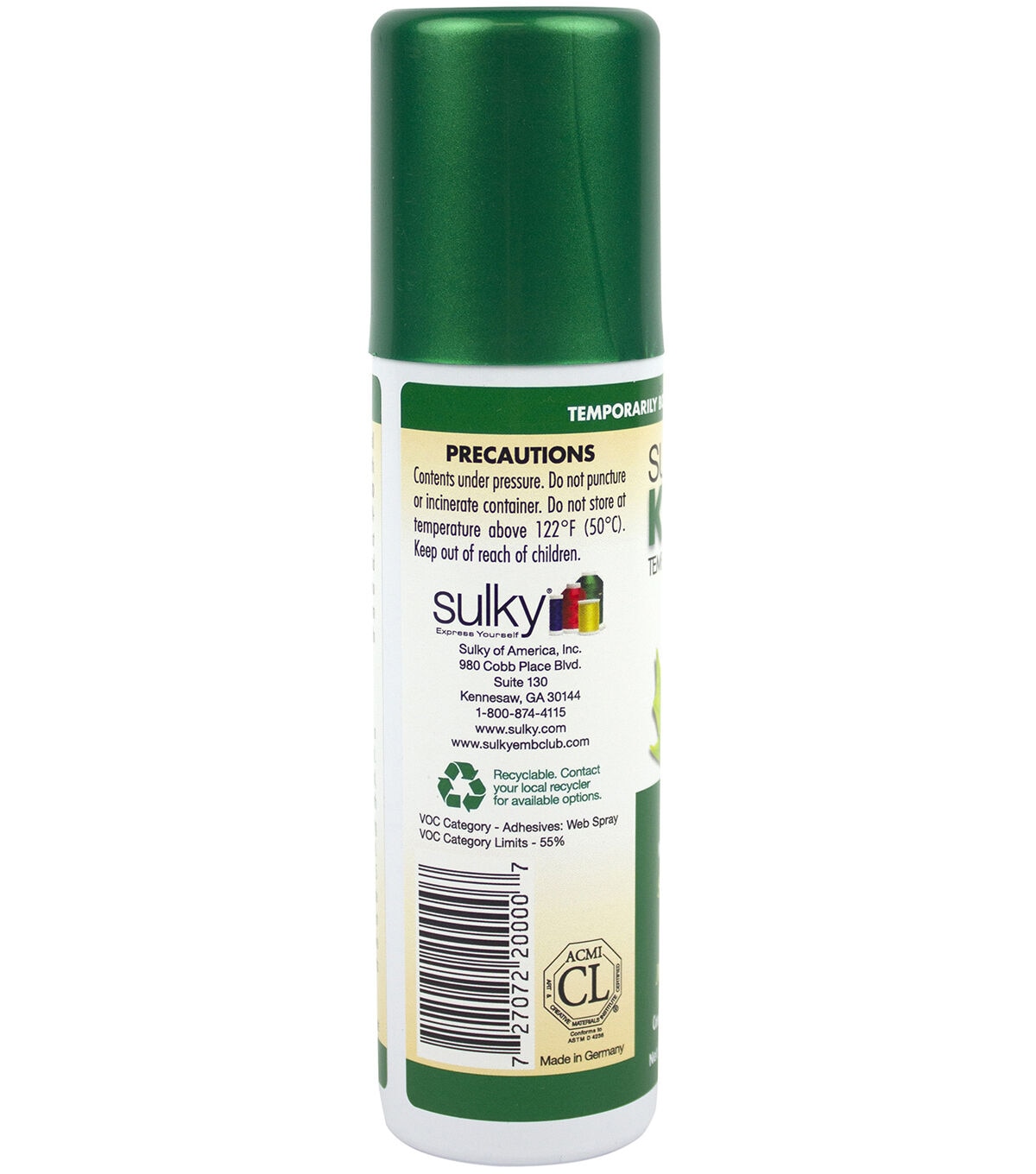 Use the Sulky Temporary Adhesive Spray for quilt basting and securing templates. It disappears in two to five days and does not stain or gum up the needle. You can also use it for trial fitting of hems, darts, pockets, shoulder pads, embellishments, appliqueing and holding stencils in place while painting. This adhesive spray comes in a 3.4-ounce aerosol can.