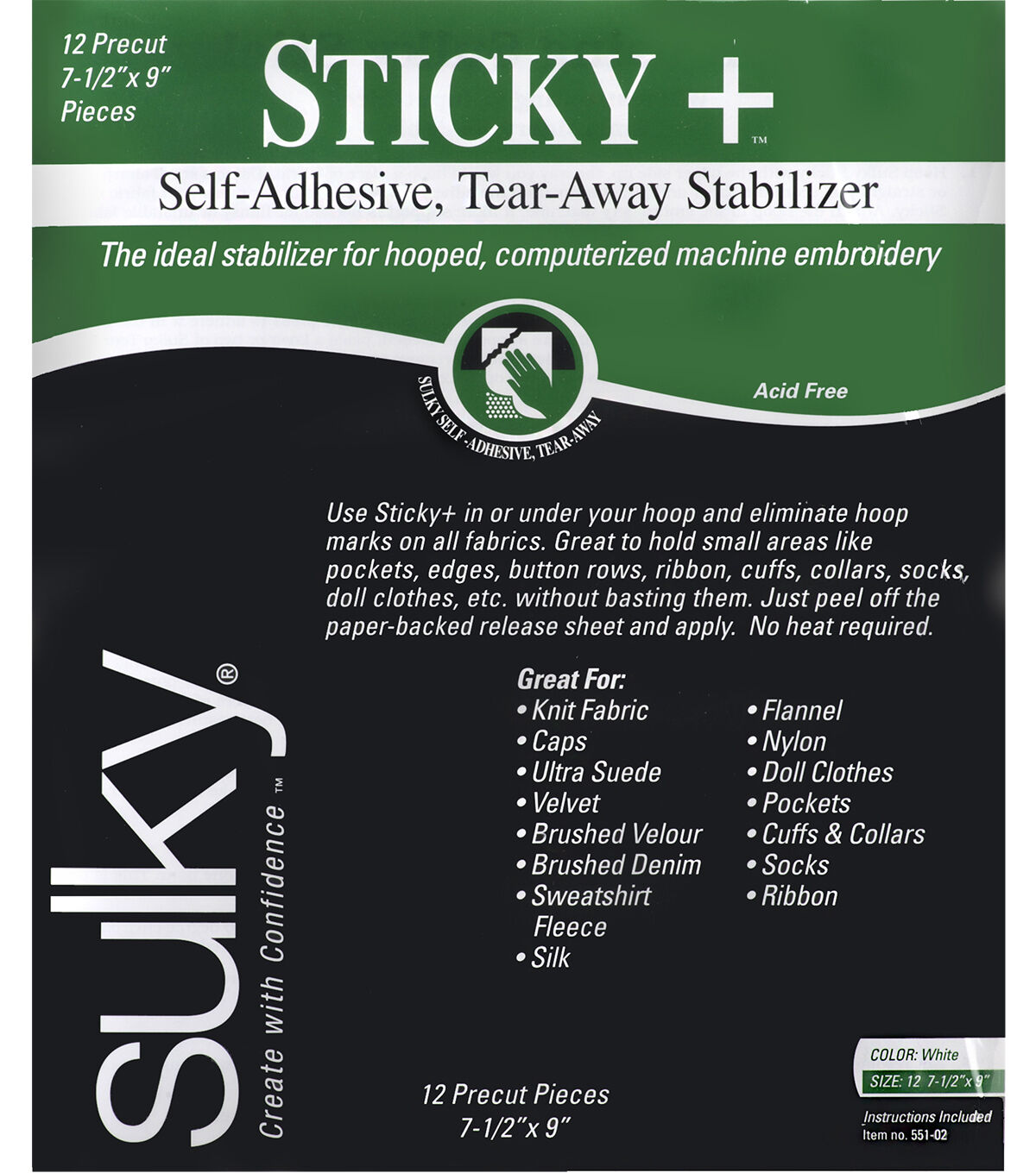Eliminate hoop marks on fabrics like sweatshirt fleece, velvet, silk, brushed denim and more using the Sulky Sticky + Self-adhesive Tear-away Stabilizer Pack - White. This temporary, self-adhesive, tear-away stabilizer is ideal to use on items that cannot be hooped or are too small to fit in a hoop. It is acid- and -lead-free and great to hold small areas like pockets, edges, cuffs, collars and more.