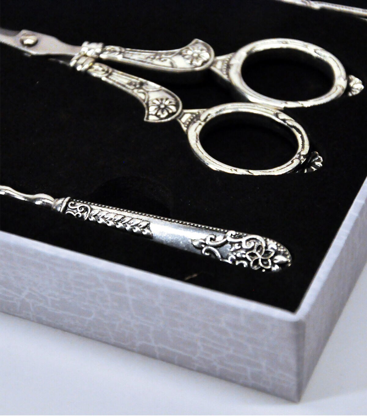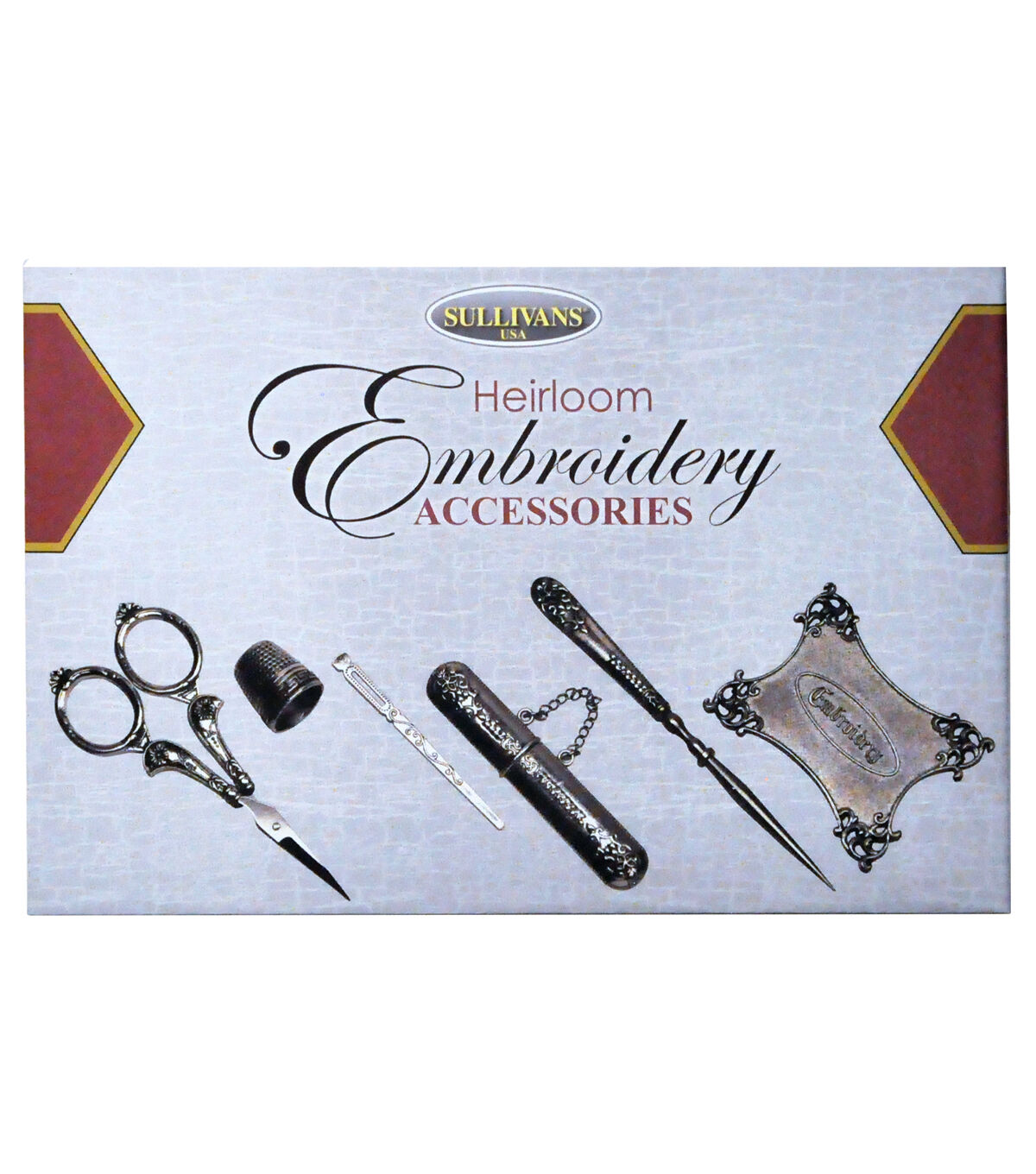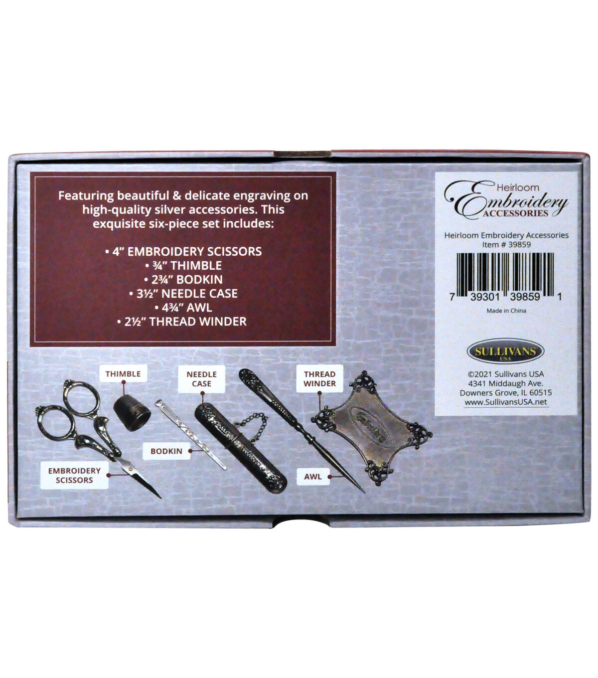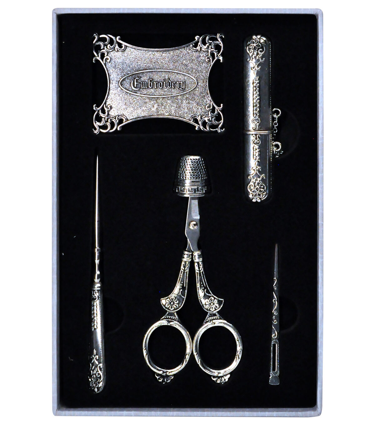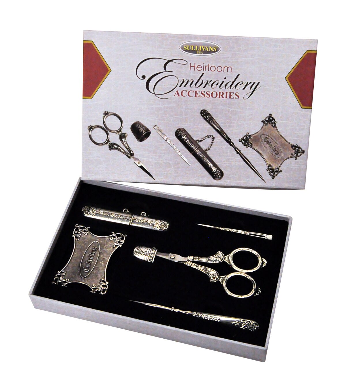 The Heirloom Embroidery Accessories display makes a great gift! This exquisite six-piece set is in a keepsake display. Beautiful and delicate engraving on high-quality silver accessories. It includes the tools most stitchers require! The accessories included are Embroidery Scissors, a thimble, bodkin, needle case, awl, and thread winder. Combine this display with Sullivans threads to make the ultimate gift. The elegant Keepsake display keeps your accessories organized and always at hand.