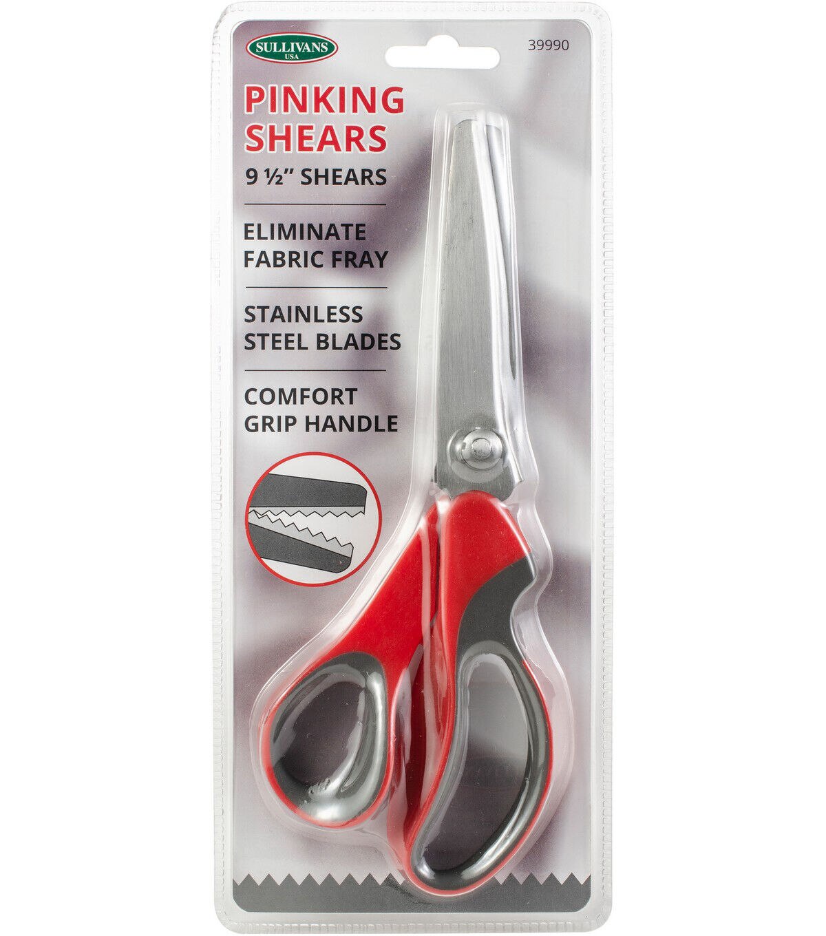 Sullivan's-Pinking Shears. Pinking shears feature notched, sawtooth blades that leave a zig-zag pattern along your fabric edge. This limits the length of frayed threads to help prevent unraveling. These 9.5 inch Pinking Shears have stainless steel blades and an ergonomic handle. They can also be used with ribbon, paper and other materials to add decorative edging. Imported.