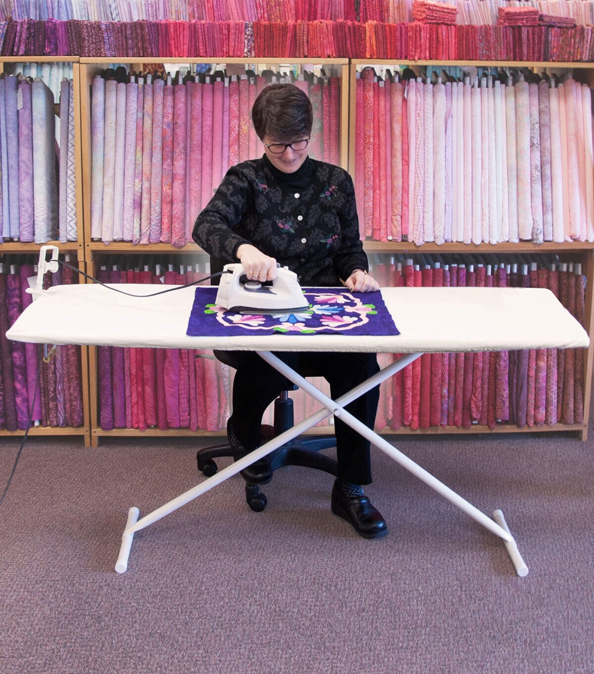 Turn your standard ironing board into a spacious pressing surface with the Sullivans Ironing Better Board. This overlay offers plenty of space for your biggest projects. You can simply place it over your existing ironing board to create a 59 x 22-inch work surface with rounded corners and a 16-inch-wide bottom railing to fit over most ironing boards. It comes completely assembled with a smooth laminated surface and a fitted ironing cover with a protective pad. Use it to press lengths of fabric and quilt tops easily and quickly. As the board can be lowered or raised to your desired height, you can sit or stand while working on projects such as ironing, quilting, crafting, painting, cutting and more.