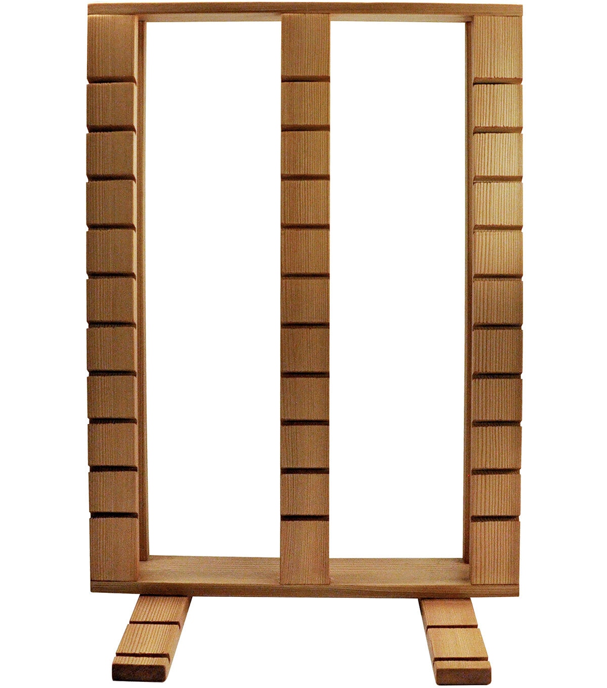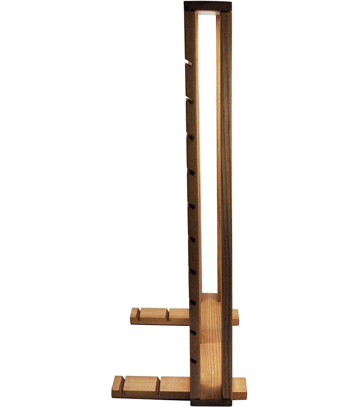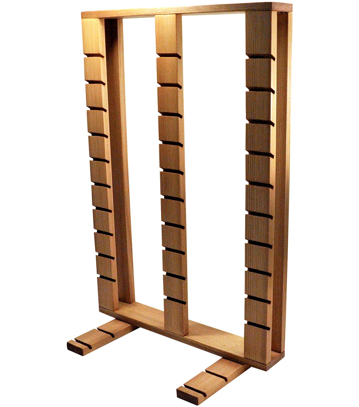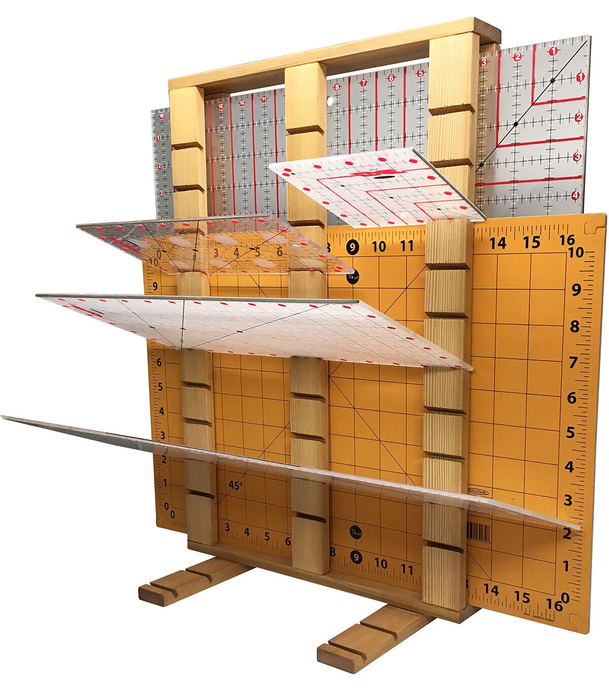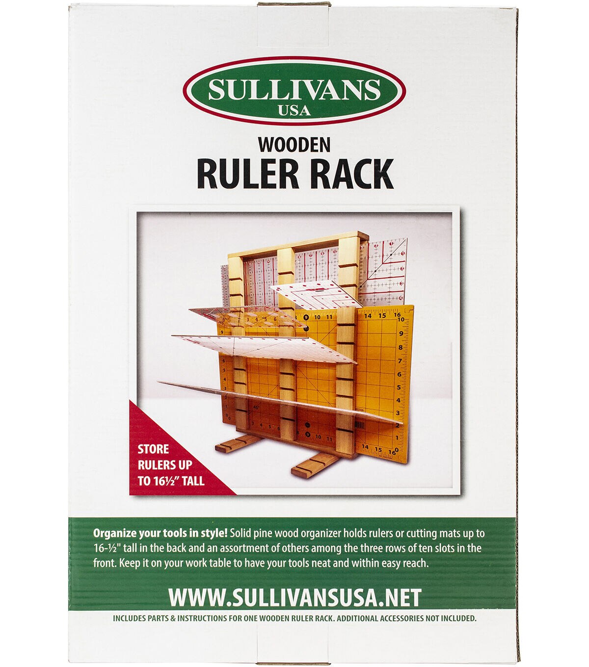 Organize your tools in style using the Sullivans Wooden Ruler Rack with Slots - Brown. This pack contains a solid pine wood organizer that holds rulers or cutting mats up to 16.5 inches tall in the back and an assortment of others among the three rows of 10 slots in the front. You can place it on your worktable to have your tools within reach.