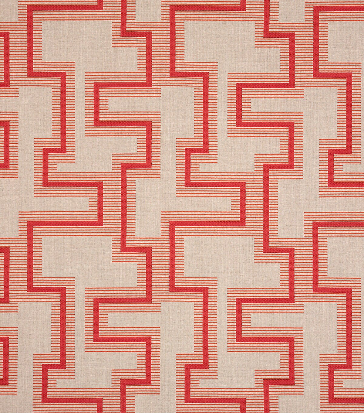 Resonate 14565-0002 Sangria is a Sunbrella furniture fabric for outdoor and indoor applications. A contemporary interpretation of the classic Greek Key pattern in a gorgeous red-pink and cream color.
