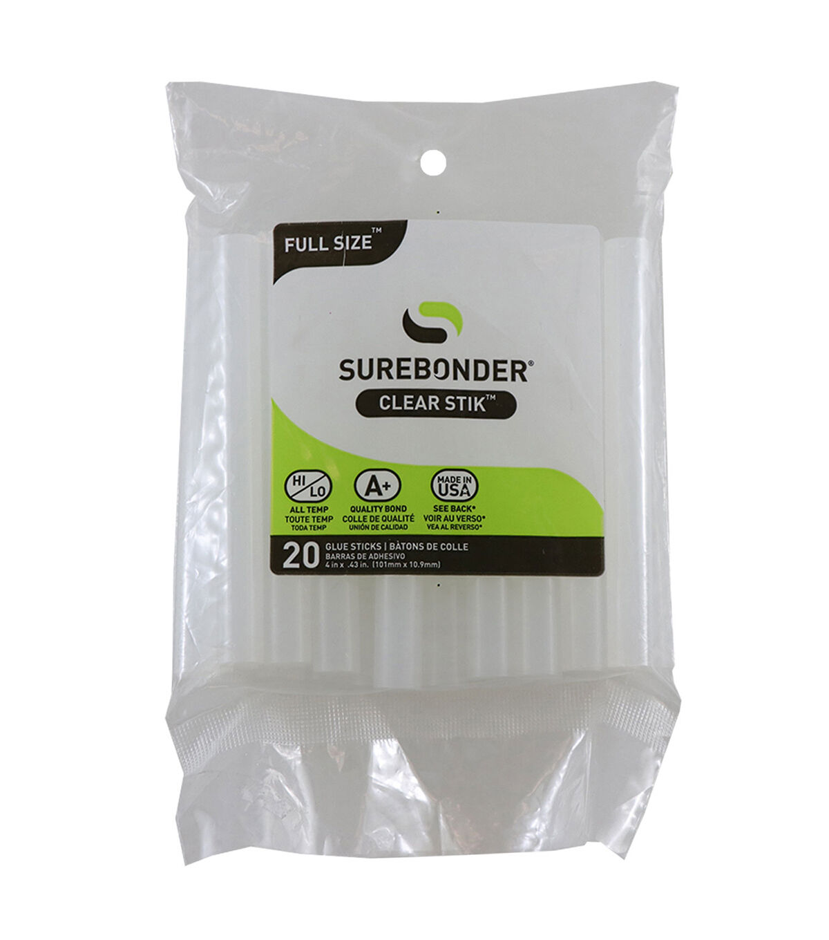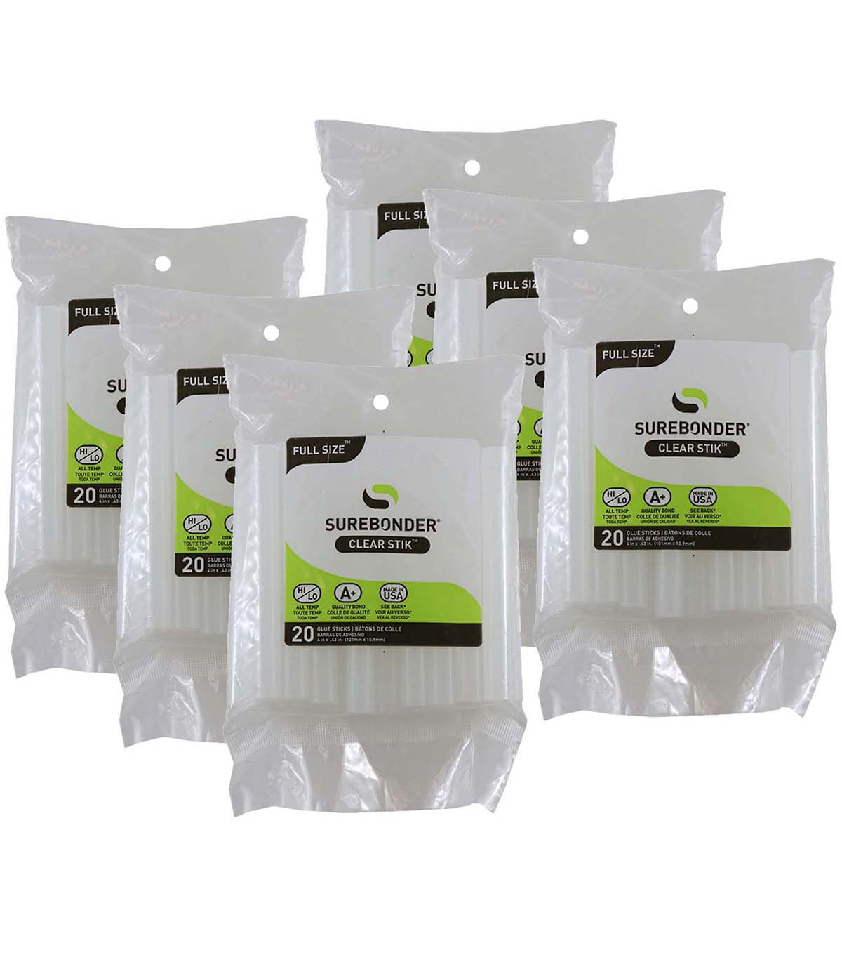 Surebonder DT-20 All Temperature Glue Sticks is an all-temperature hot melt adhesive that works at either low temperature (230 degrees F) or high temperature (380 degrees F) for everyday gluing projects. Use with high or low temperature glue guns. Bonds to metal, wood, paper, fabric, magnets, ceramics, floral arrangements, glass and plastic using a high temperature glue gun. Bonds to delicate materials such as balloons, ribbon, lace and children's crafts using a low temperature glue gun. Clear color with 60-65 second working time. 7/16" diameter x 4" length. 20 sticks per pack. Sold as 6 packs for a total of 120 glue sticks.