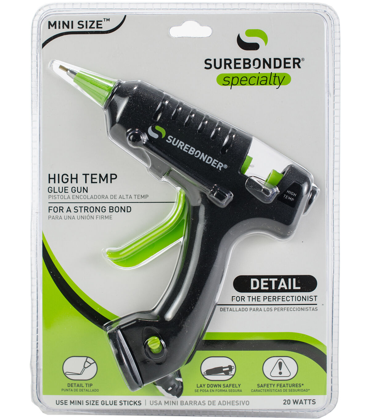 This smaller specialized tool is specially designed to use on repairs and craft projects that call for exactness of application. The high heat capacity ensures your materials remain bonded as intended, while the safety features assure smooth, worry-free usage. The safety fuse within provides peace of mind by turning off the gun in the rare event of a short. Turn to this safe, small, effective tool for repairs and projects that call for particularly precise application. Size is 5 x 1.8 x 7 inches. For best use, pair with Surebonder’s mini glue sticks in 5/16-inch diameter by 4- or 10-inch length or try the mini size glue roll, for 5-feet of glueing capacity.