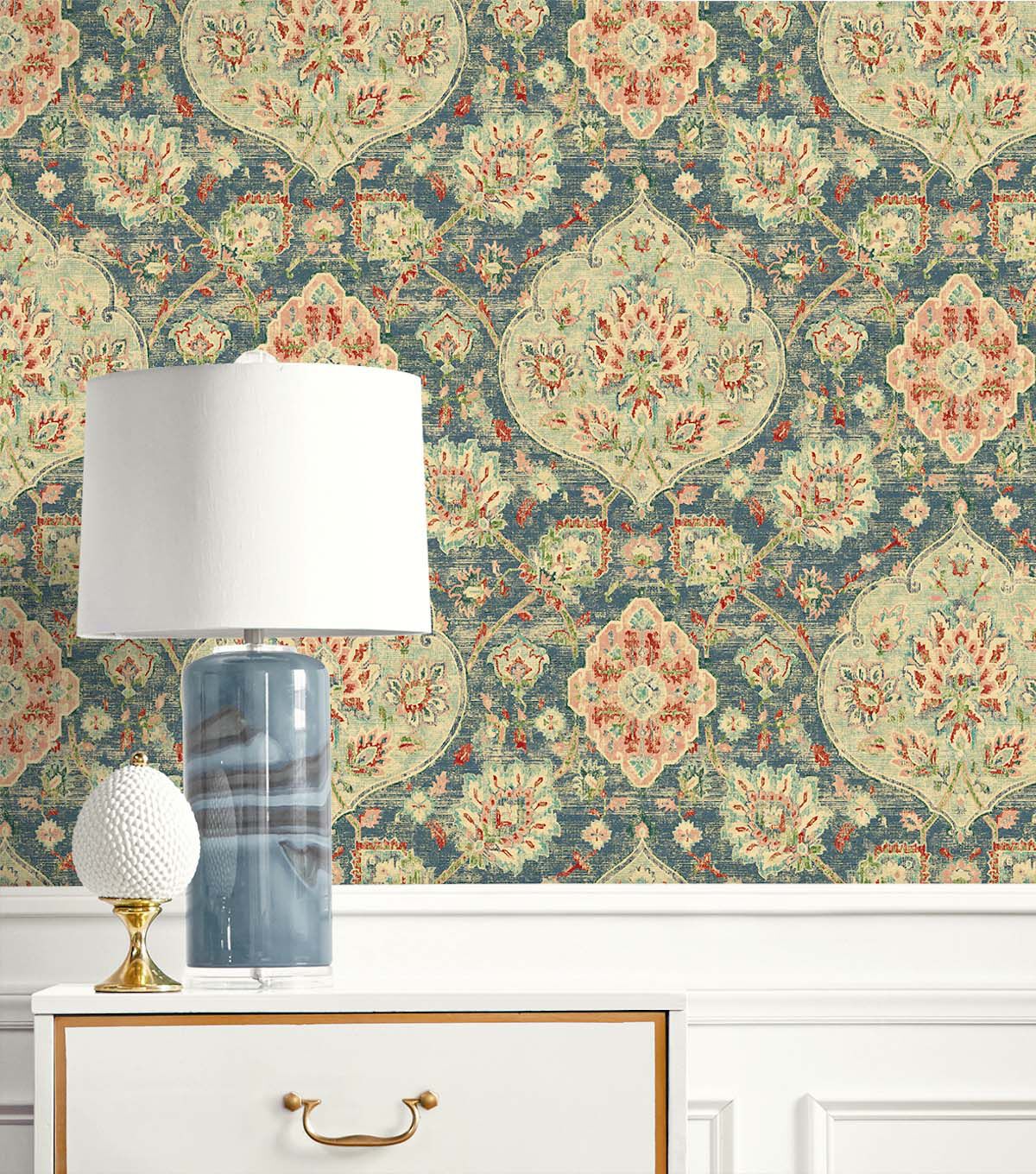 A quintessential vintage carpet design Caspian peel and stick wallpaper is rich in color, naturally opulent will add interest and extravagance to the interior. Printed on high quality vinyl self-adhesive peel and stick wallpaper – no water required. Caspian is repositionable and removable without any sticky residue left behind.