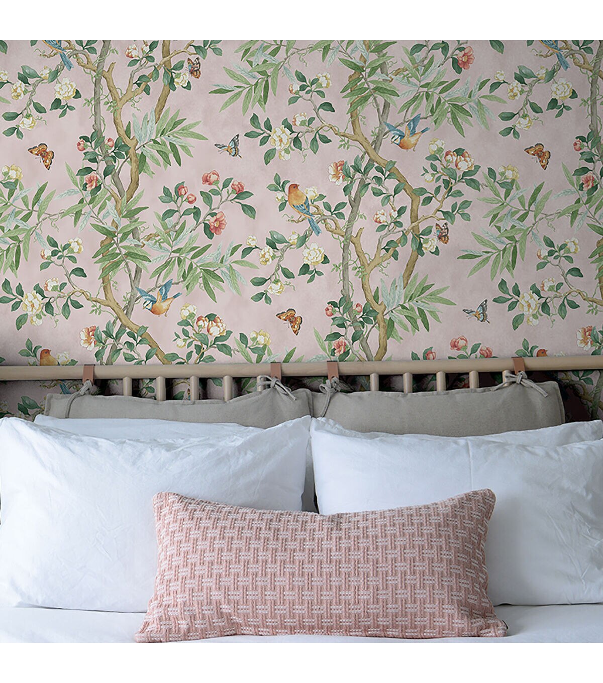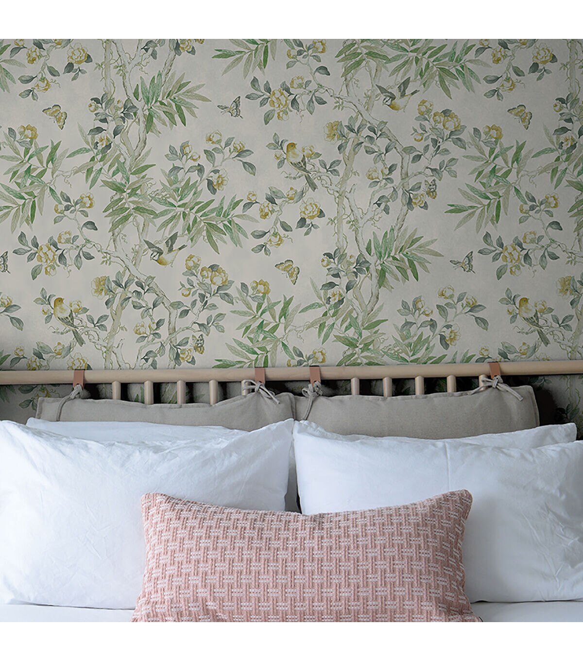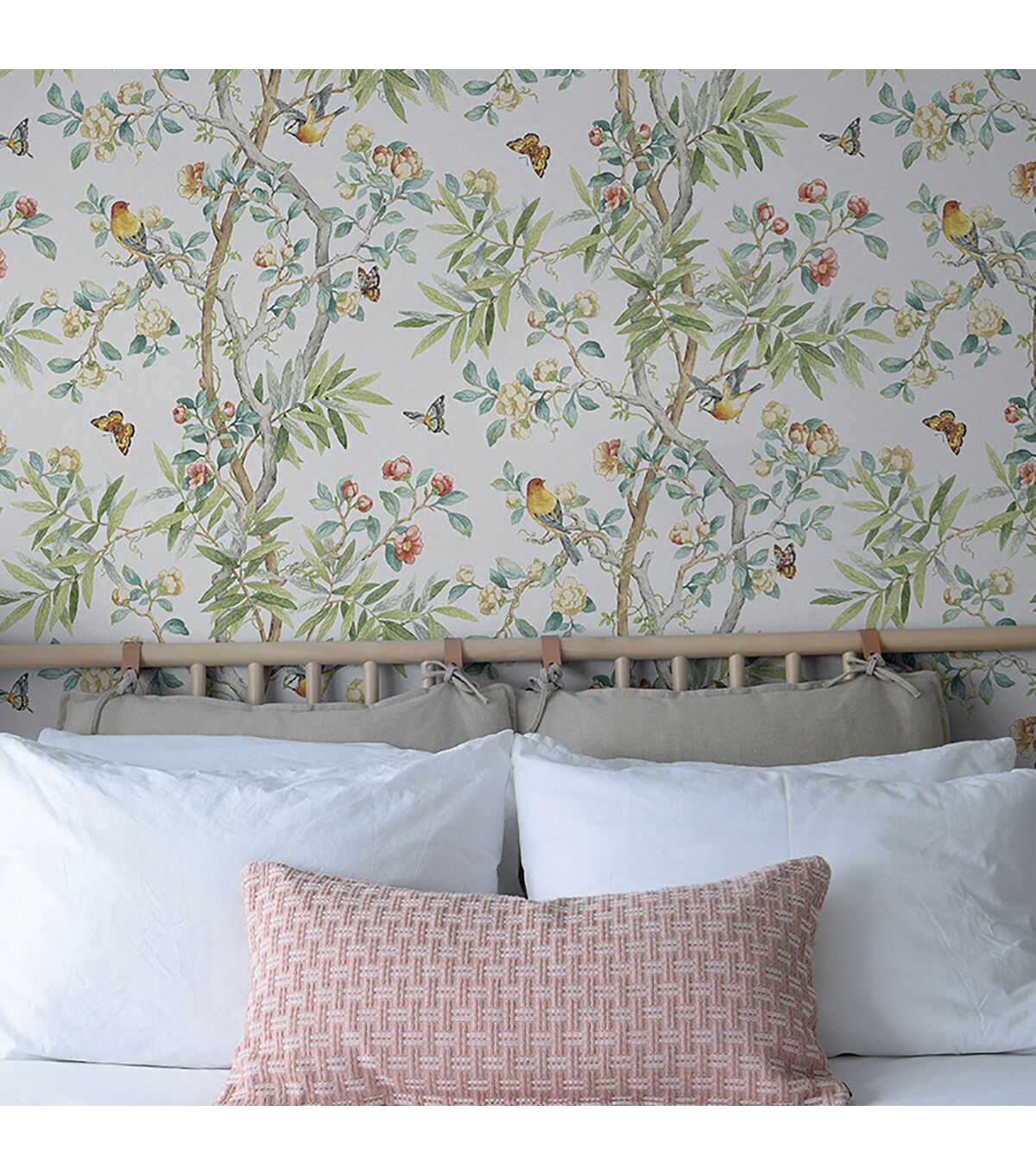 Surface Style KIMONO VINE a delicate and charming watercolor botantical. The woody ringed bamboo branches mingle with fragrant rose vines draw the interest of nearby orioles and flittering butterfiles in this impactful design. Roll size 20.5 -in x 18-ft. Easy to install, repositional and removable without any sticky residue. Do not apply peel and stick wallpaper to textured walls, unfinished drywall/ plaster, existing wallpaper, non-stick paint or cinder block.