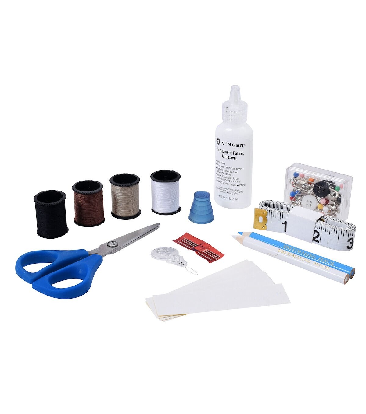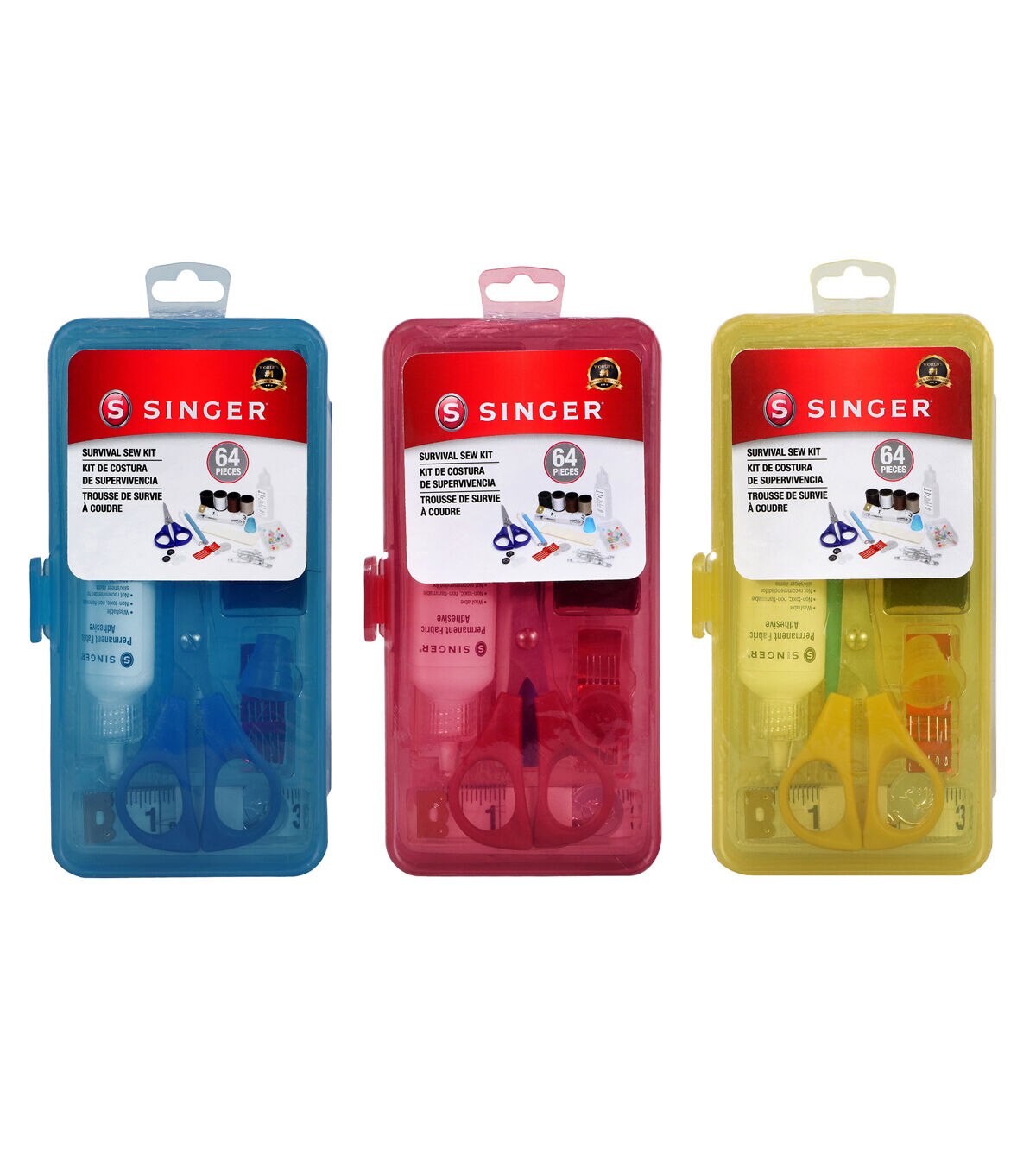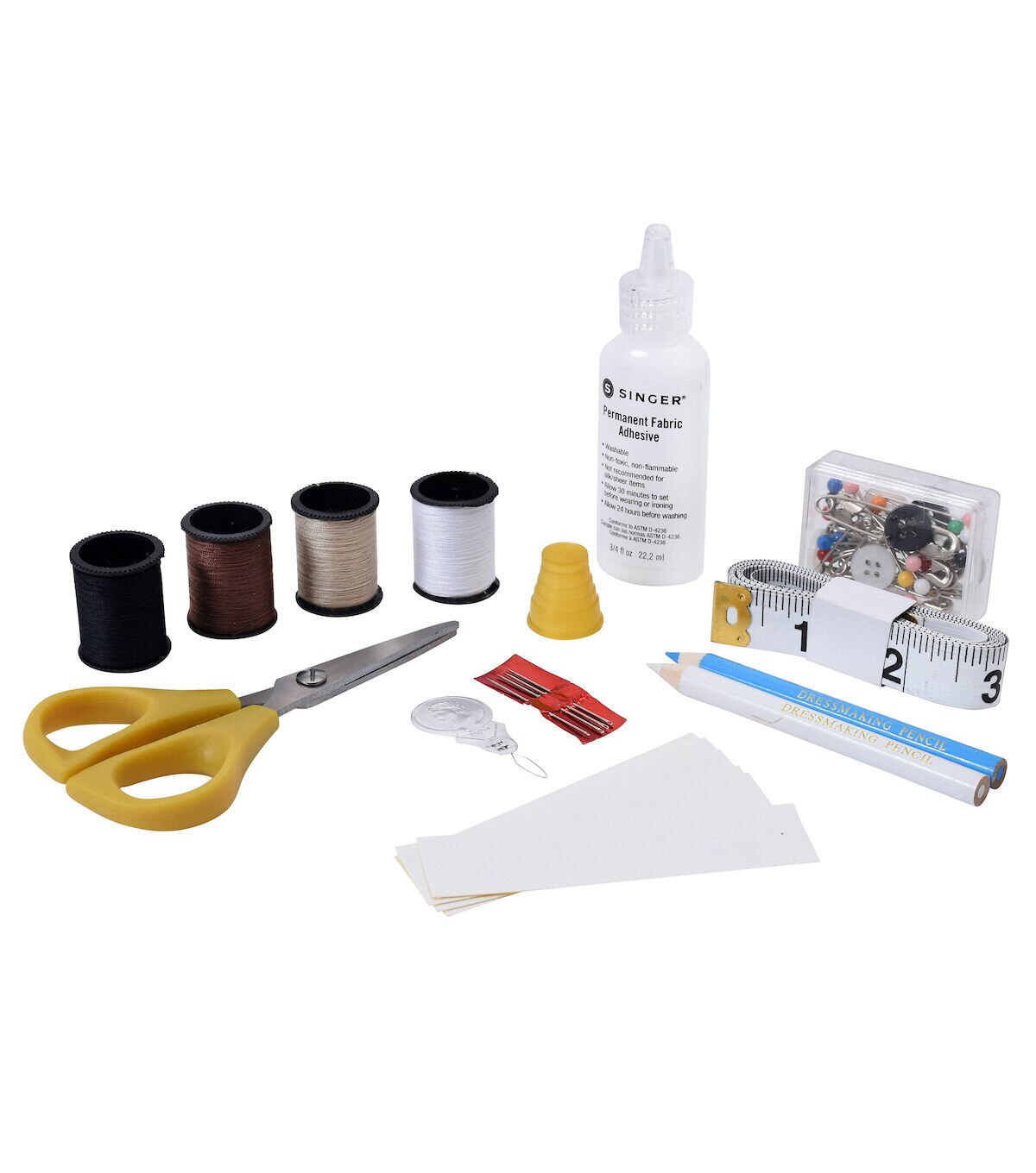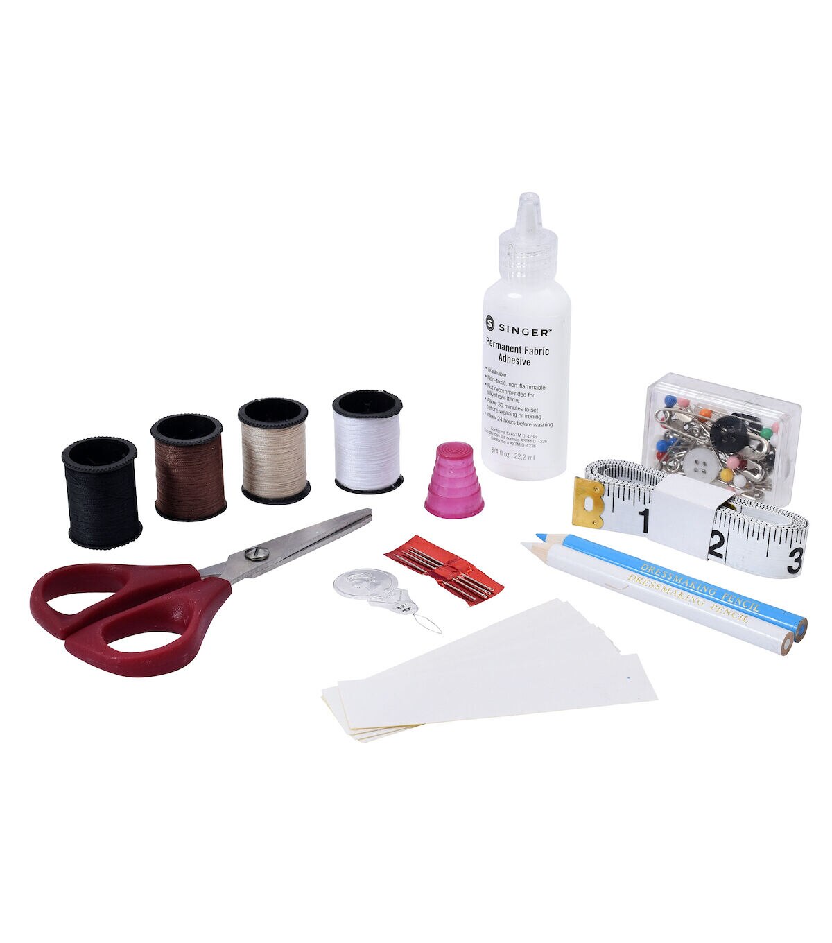The Singer Survival Sew Kit includes all the basic notions necessary to mend small rips, tears and buttons. This small sewing kit is perfect for beginners and easy to store in tight spaces. It contains a pair of scissors, six quick-fix adhesive tape strips, fabric glue, measuring tape, two marking pencils, four mini spools of thread and five hand needles. A needle threader, thimble, 20 ball headpins, 15 safety pins and four white and 2 black shirt buttons are also included in this kit. Mini spools of thread come in different colors and offer 25 yards of thread per spool. All these sewing essentials come arranged in a durable plastic case.