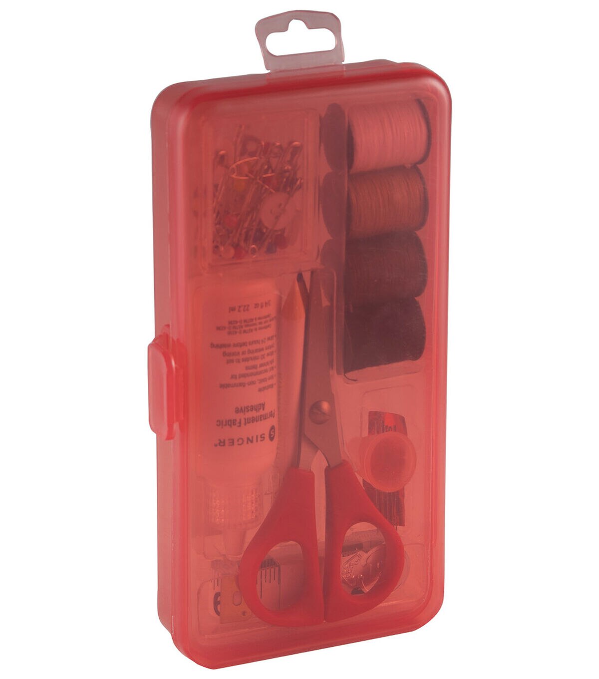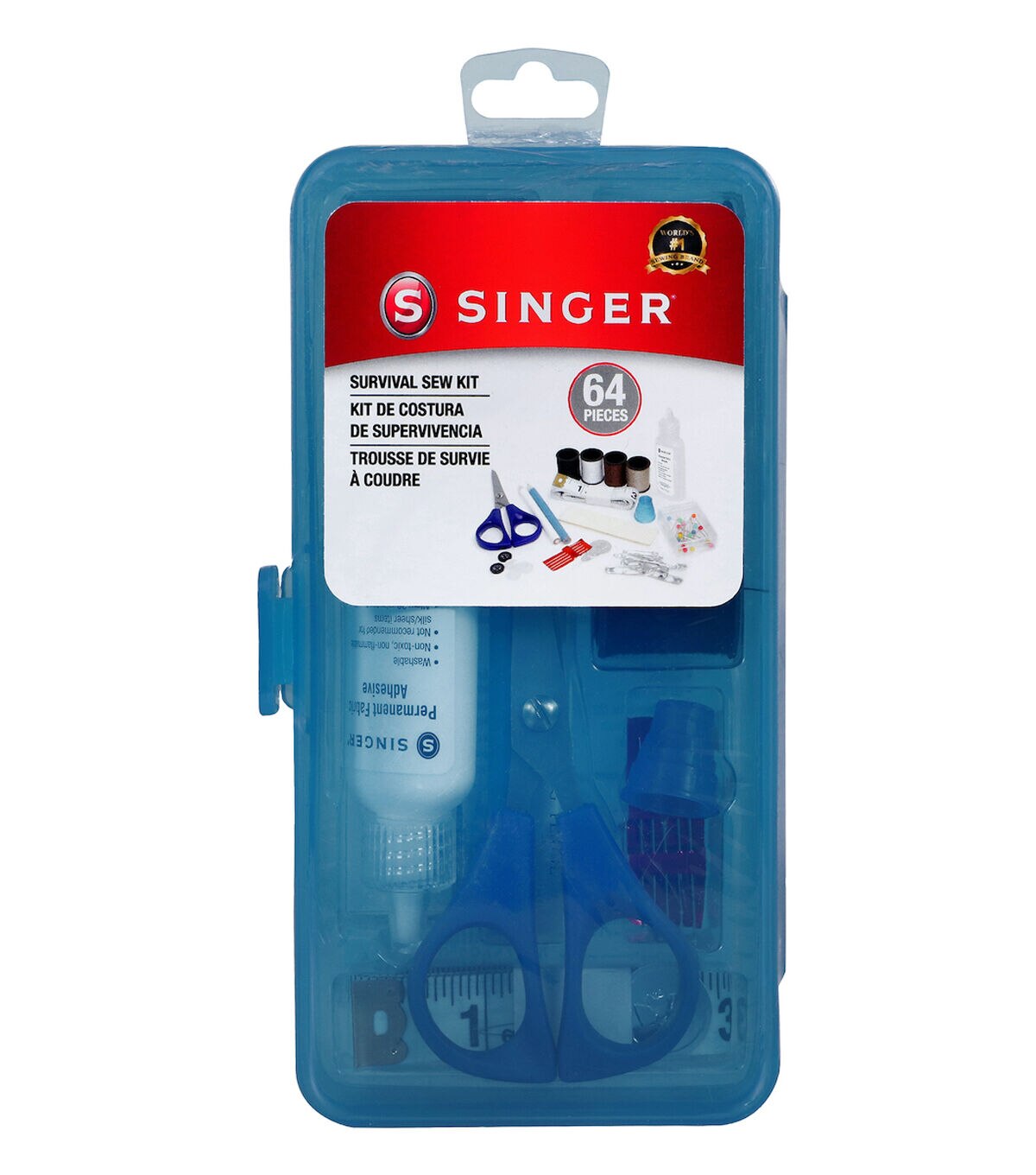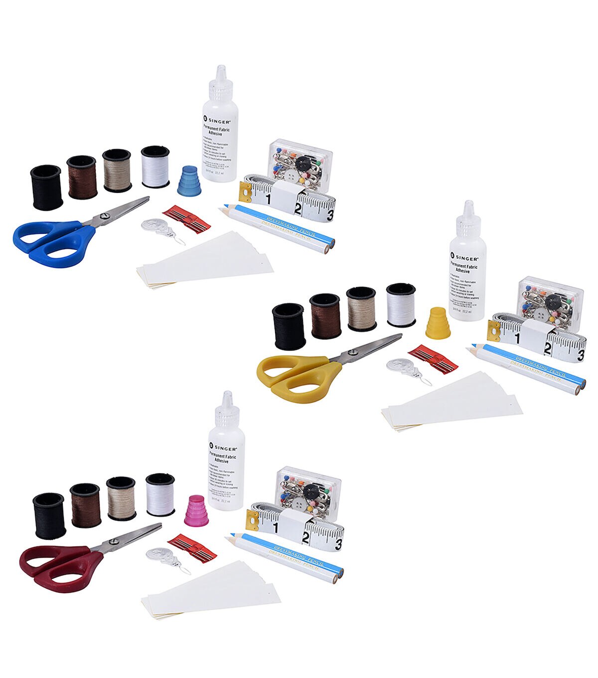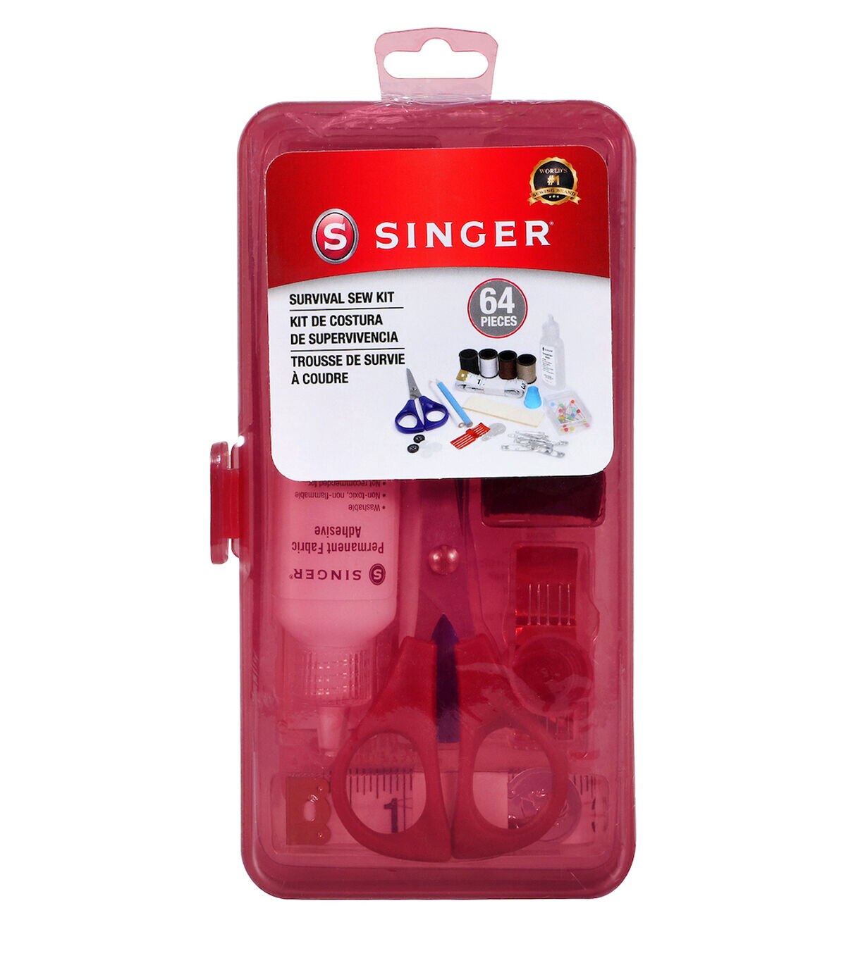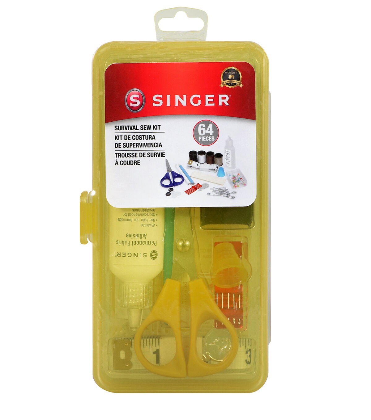 The Singer Survival Sew Kit includes all the basic notions necessary to mend small rips, tears and buttons. This small sewing kit is perfect for beginners and easy to store in tight spaces. It contains a pair of scissors, six quick-fix adhesive tape strips, fabric glue, measuring tape, two marking pencils, four mini spools of thread and five hand needles. A needle threader, thimble, 20 ball headpins, 15 safety pins and four white and 2 black shirt buttons are also included in this kit. Mini spools of thread come in different colors and offer 25 yards of thread per spool. All these sewing essentials come arranged in a durable plastic case.