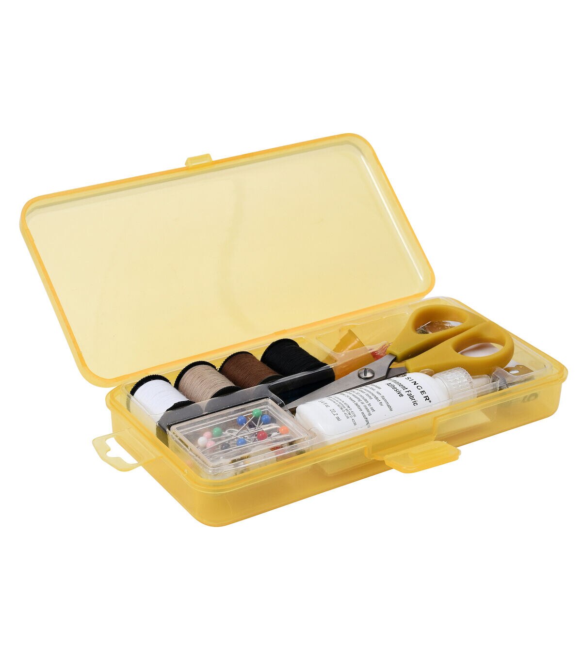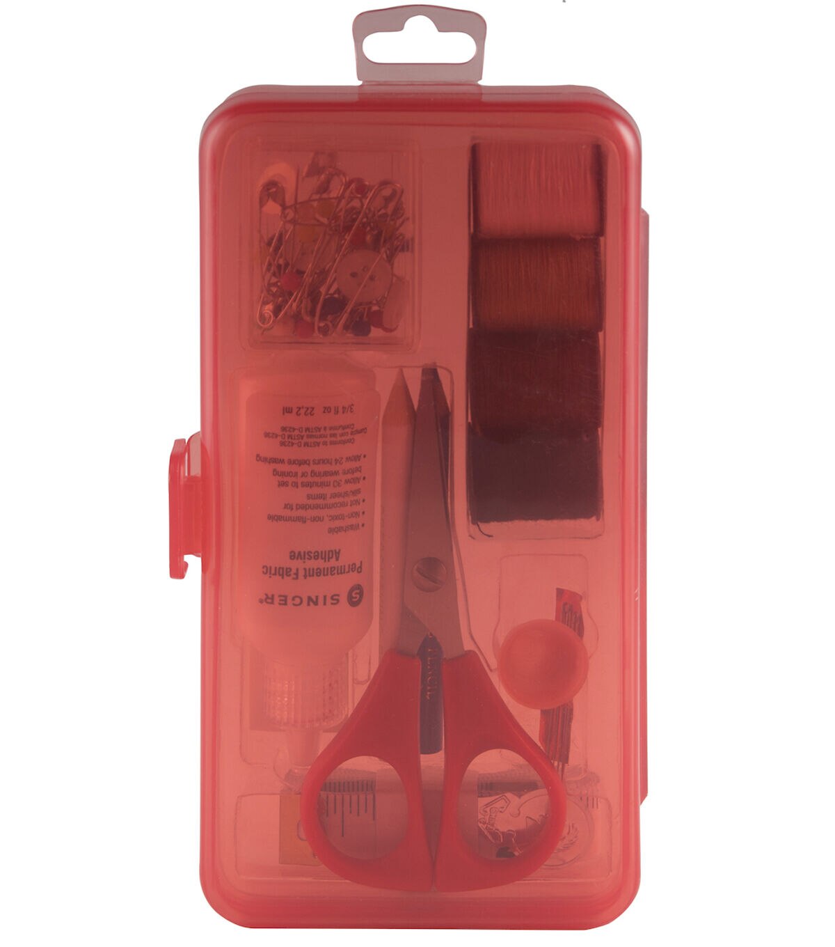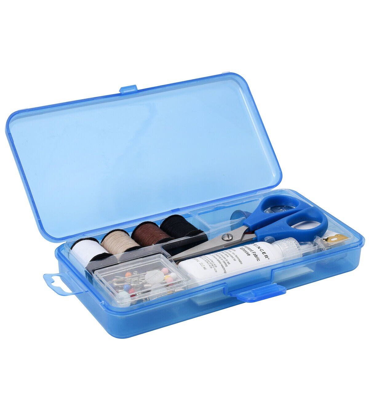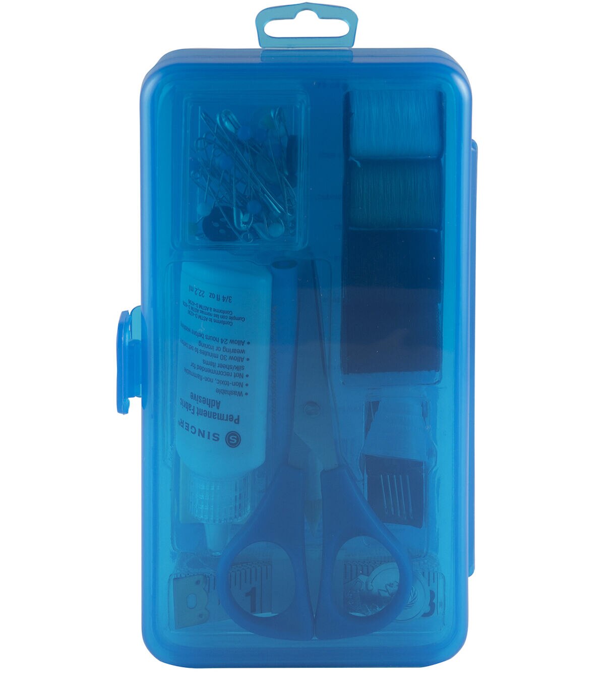 The Singer Survival Sew Kit includes all the basic notions necessary to mend small rips, tears and buttons. This small sewing kit is perfect for beginners and easy to store in tight spaces. It contains a pair of scissors, six quick-fix adhesive tape strips, fabric glue, measuring tape, two marking pencils, four mini spools of thread and five hand needles. A needle threader, thimble, 20 ball headpins, 15 safety pins and four white and 2 black shirt buttons are also included in this kit. Mini spools of thread come in different colors and offer 25 yards of thread per spool. All these sewing essentials come arranged in a durable plastic case.