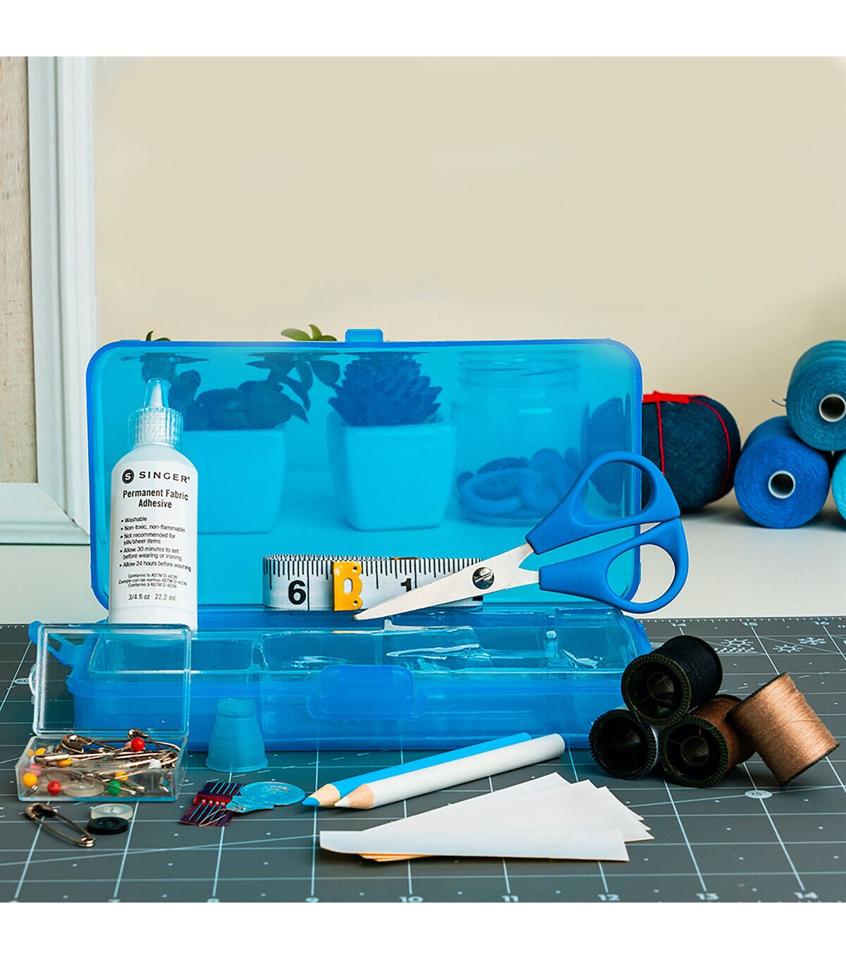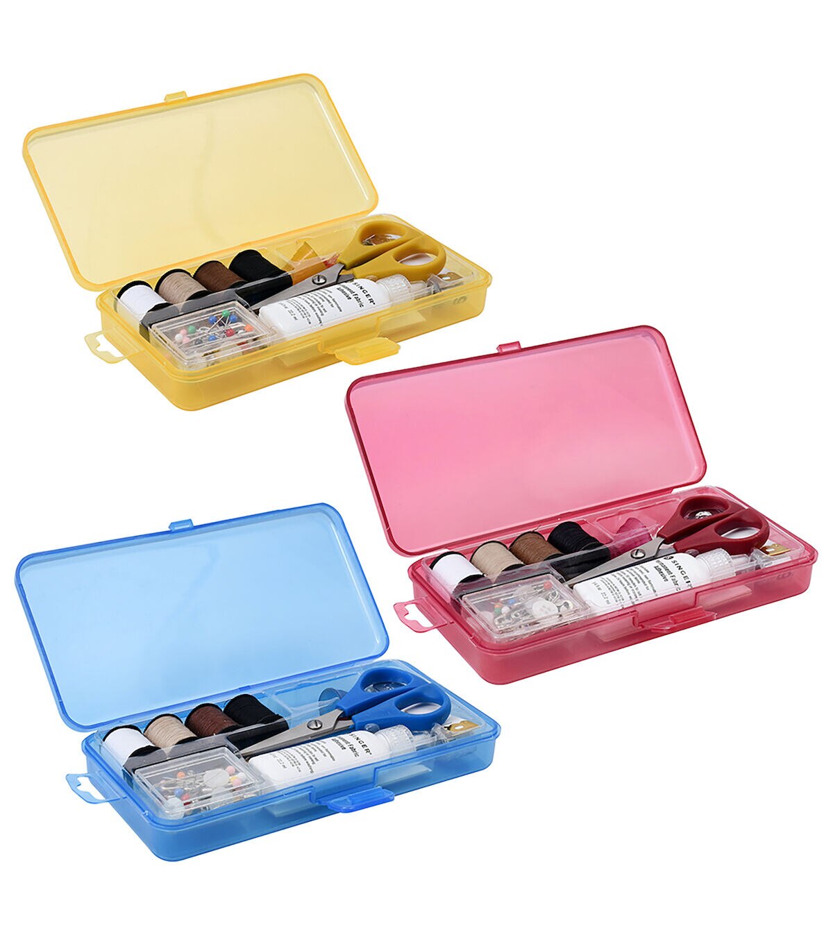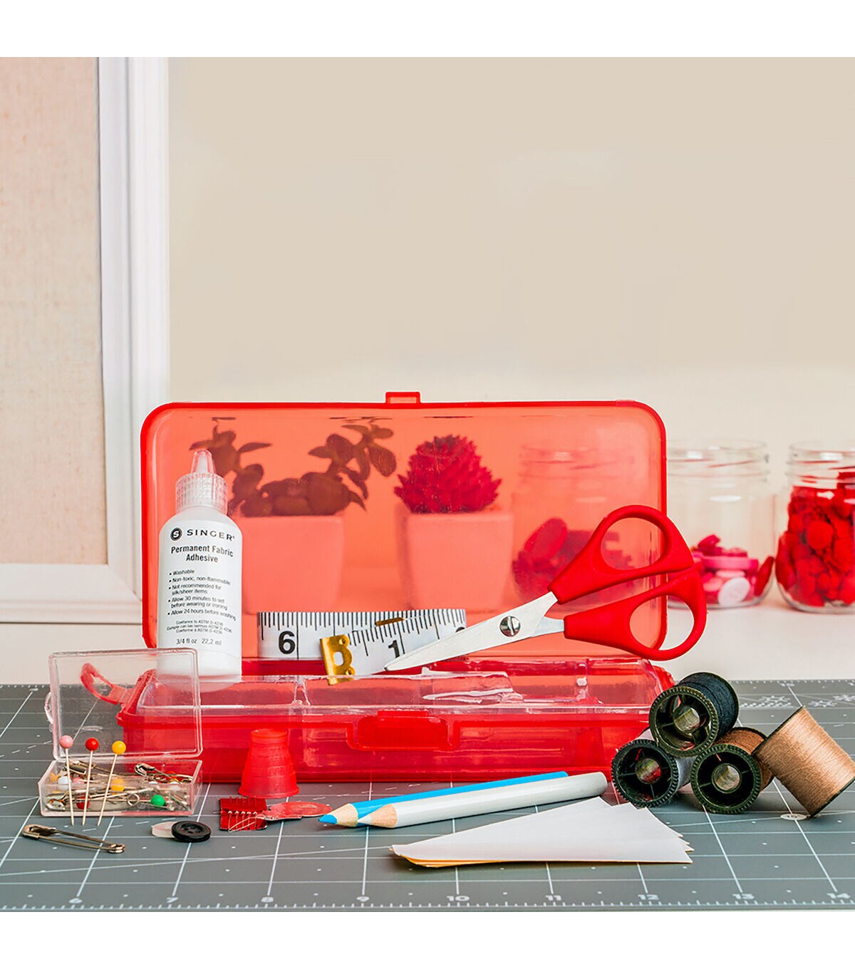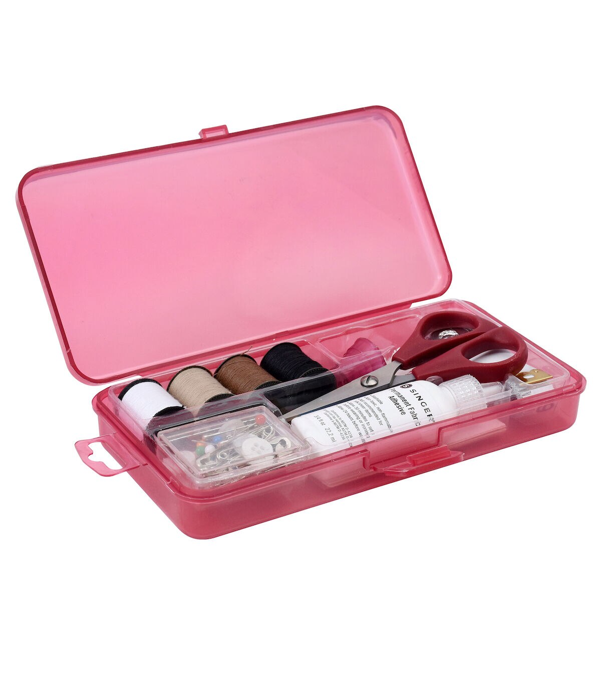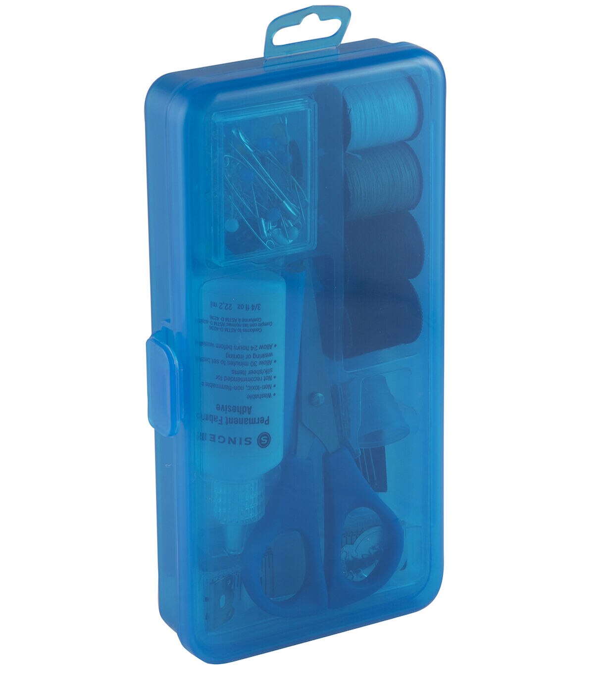 The Singer Survival Sew Kit includes all the basic notions necessary to mend small rips, tears and buttons. This small sewing kit is perfect for beginners and easy to store in tight spaces. It contains a pair of scissors, six quick-fix adhesive tape strips, fabric glue, measuring tape, two marking pencils, four mini spools of thread and five hand needles. A needle threader, thimble, 20 ball headpins, 15 safety pins and four white and 2 black shirt buttons are also included in this kit. Mini spools of thread come in different colors and offer 25 yards of thread per spool. All these sewing essentials come arranged in a durable plastic case.