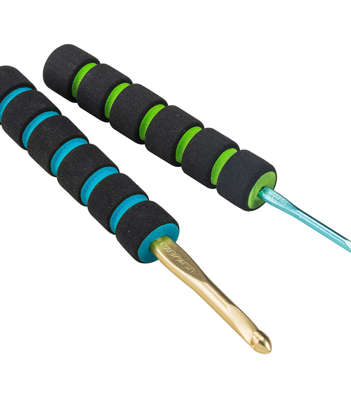 Enjoy crocheting a variety of projects, without experiencing hand strain, by using these Susan Bates Crochet Hook Cushion Grips. Simply slide one of these bright, fun striped, sponge grips over the handle of your crochet hook. This pack contains two, 0.63 x 3.5-inch, crochet hook grips which fit hook sizes F-5 to J-10.