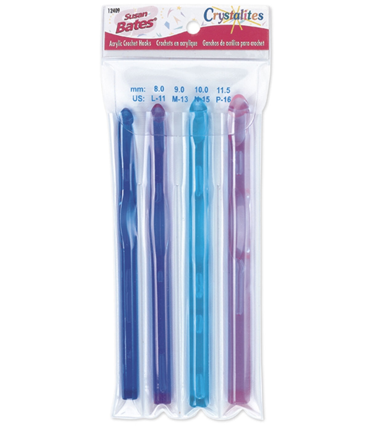 SUSAN BATES-Susan Bates Crystalites Crochet Hooks. These hooks are beautifully colored translucent plastic crochet hooks. Each fun color is a size so you can find the size you need at a glance. Our famous in line head helps reduce wrist motion for fatigue free crocheting and helps you maintain a more consistent gauge. The 8x3-3/4x1/2in vinyl case is perfect to store your hooks safely. This set includes sizes US L11; M13; N15 and P16 (8mm; 9mm; 10mm and 11.5mm). Imported.
