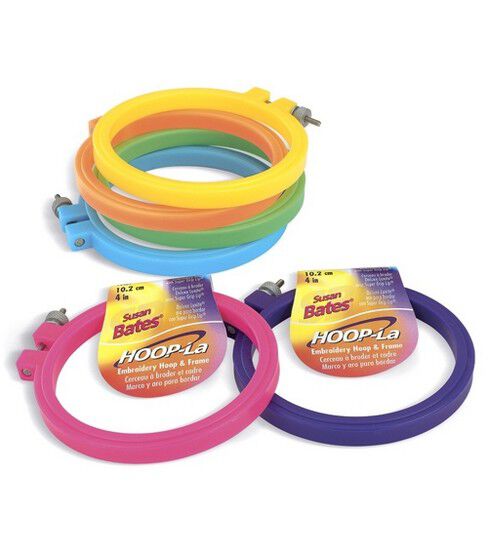 Hoop-La embroidery hoops are available in six bright colors-pink, purple, green, turquoise, orange and yellow. They feature the Super Grip Lip that always keeps your project securely in place. Add some zip to your embroidery hoop section with the colorful Hoop-La!