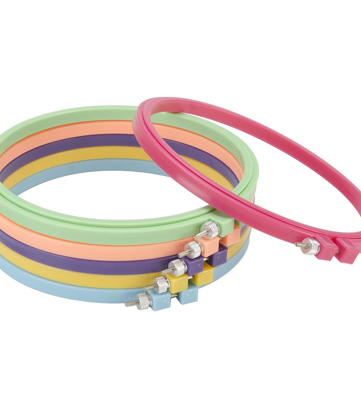 Hoop-La embroidery hoops are available in six bright colors-pink, purple, green, turquoise, orange and yellow. They feature the Super Grip Lip that always keeps your project securely in place. Add some zip to your embroidery hoop section with the colorful Hoop-La!