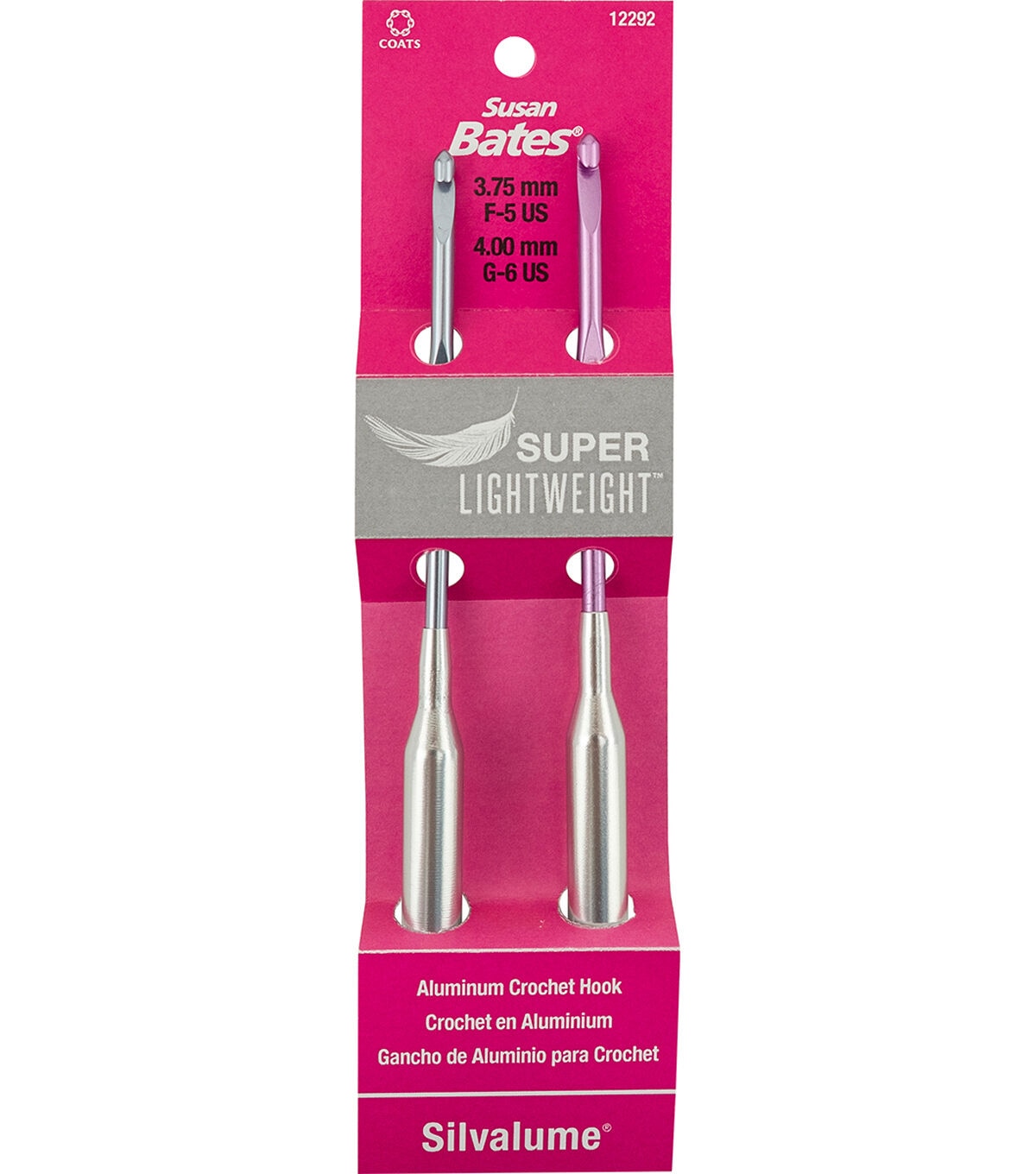 Add the Coats Susan Bates Silvalume Super Lightweight Crochet Hooks to your crocheting supplies. The in-line hook head allows for uniform stitches and reduces wrist strain. This set includes two 6.5 inch long, aluminum crochet hooks. Available in a variety of sizes, each sold separately. 6.5 inch long