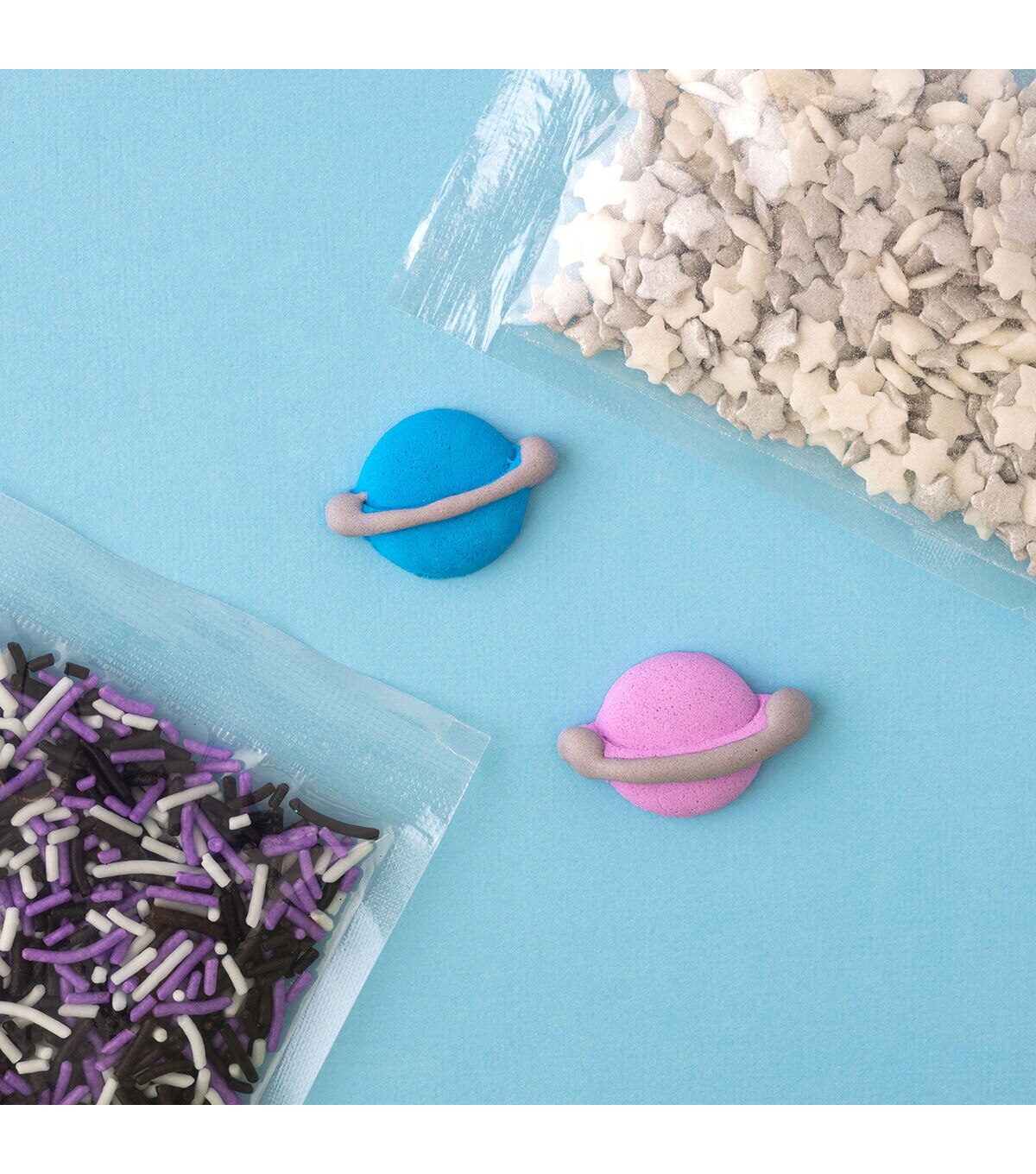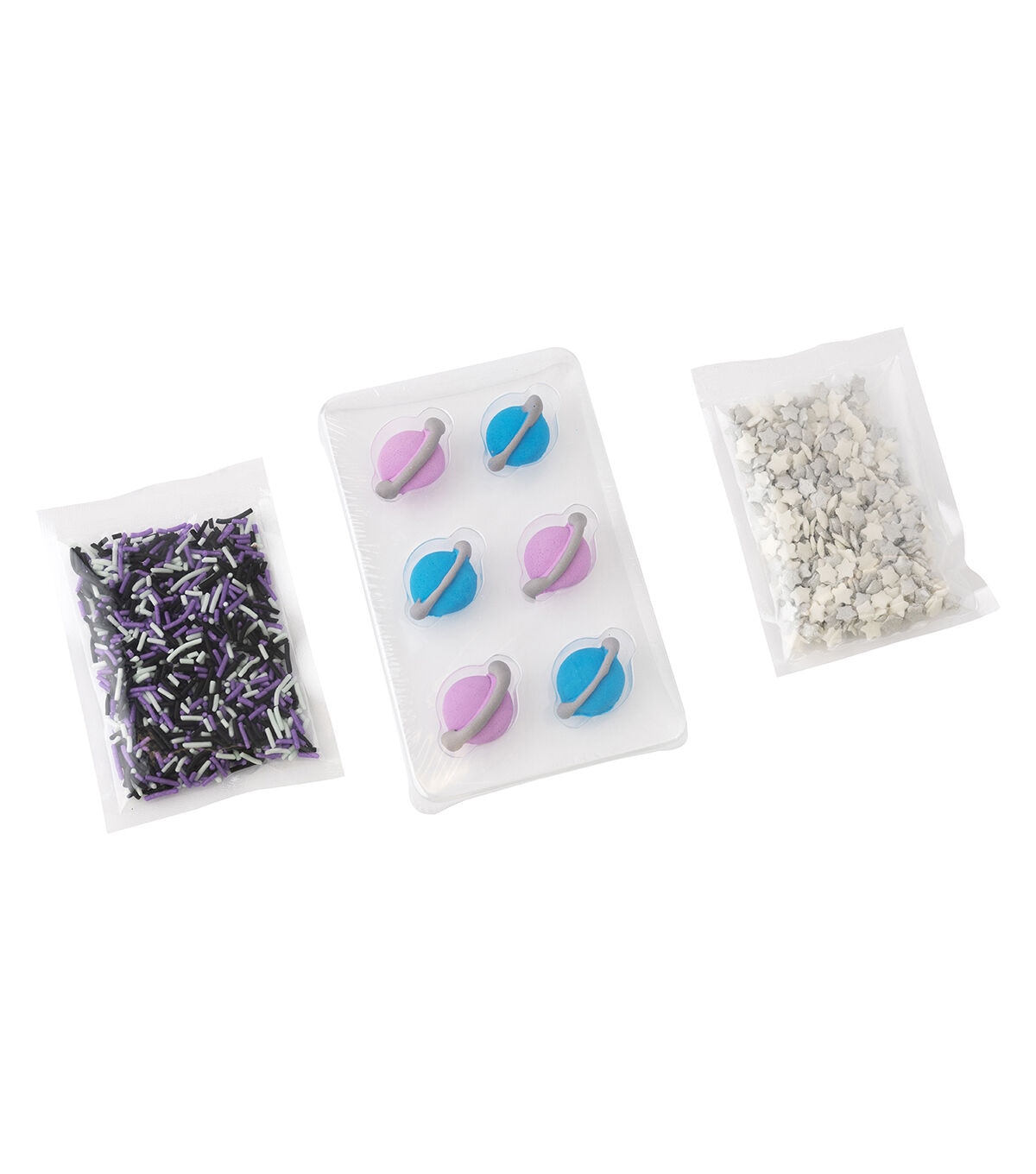 SweetShop decorating kits are great for themed parties and adding a little something extra to any treat. They are an easy way to spruce up store-bought treats too! Mix and match colors and sets for any special occasion! This package includes 6 icing decorations and 2 coordinating sprinkle mixes. Style: Galaxy