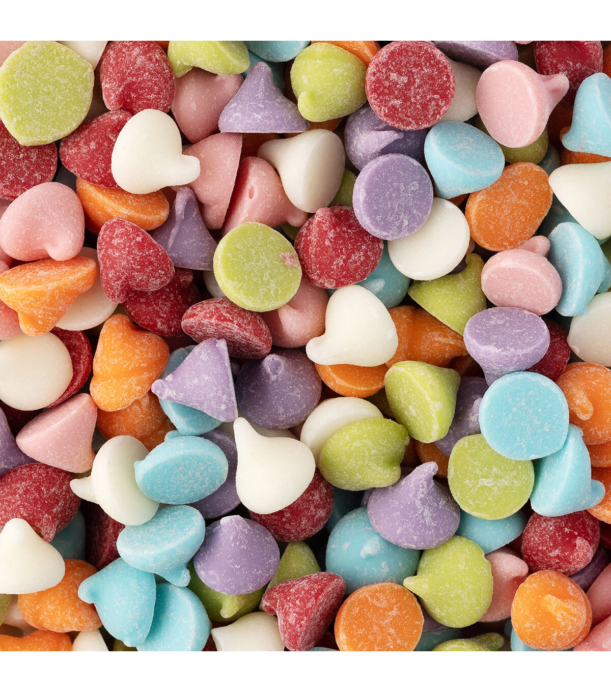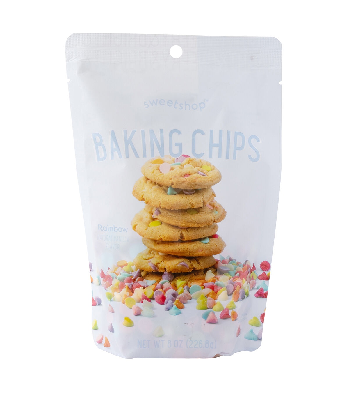 Add a sweet pop of color to your tasty treats with colored baking chips! They're just the thing for all your edible creations. This package includes 8 oz of rainbow baking chip mix, great for cookies, cupcakes, and more. Mix and match colors to create custom mixes.