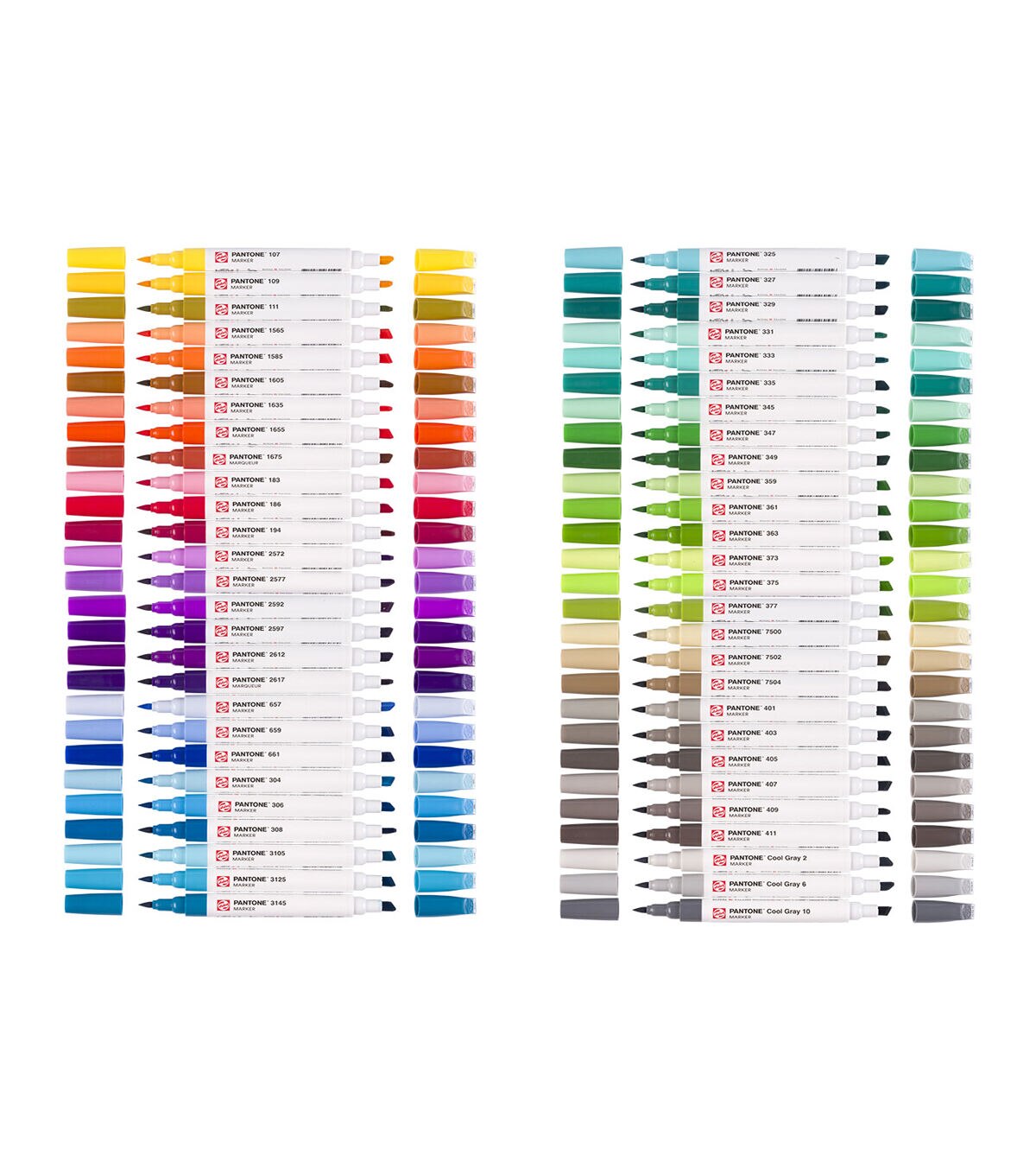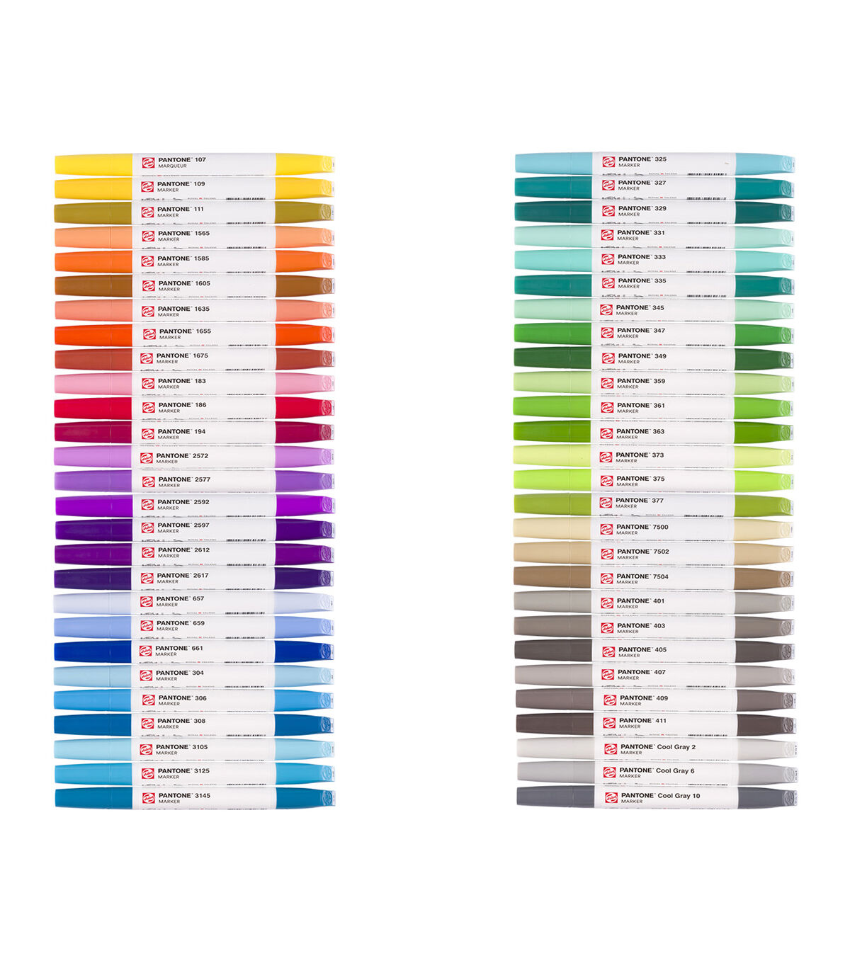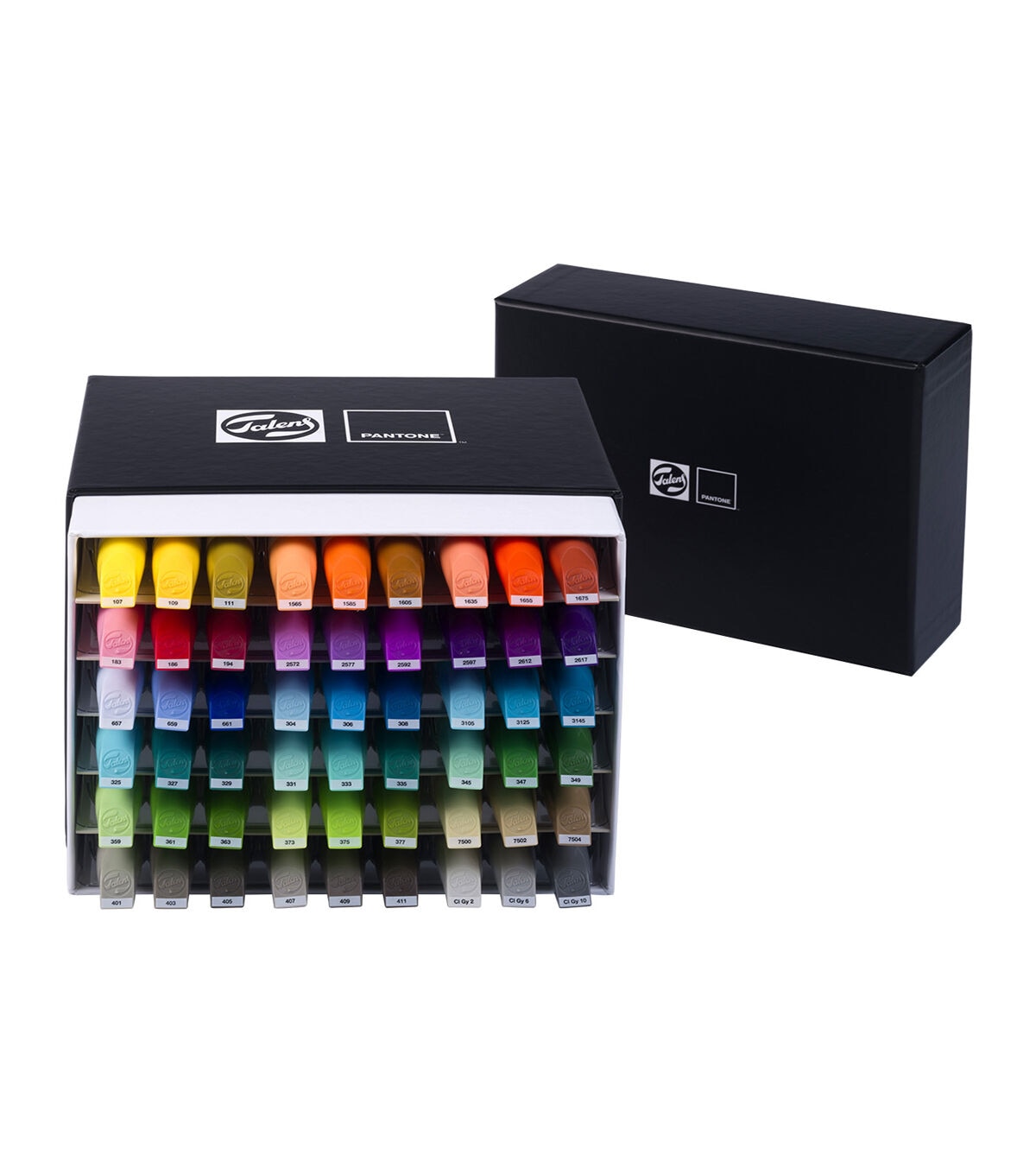 Sketch, draw and design in Pantone colors with Talens Pantone markers. These High quality markers contain pigmented, water based ink in vivid colors based on the Pantone Matching System and trade. Meticulously formulated, adjusted and tested by Talens, co designed and approved by Pantone. This set contains 54 Talens Pantone markers and comes in a sturdy box with a sleek, horizontal design, ensuring your markers are always ready to use with optimal ink flow to both nibs. Thanks to the color names and numbers on the caps, you can easily pick the right color for your work. Bring your ideas to life and discover the possibilities. Each marker features two nibs, offering the ultimate flexibility, a brush tip for details and fine lines, and a chisel tip for broad strokes and bold color blocks. The ink dries quickly and is waterproof when dry, which makes it perfect for layering. Use the markers with our unique Talens Pantone paper for optimal results with the Pantone colors. When your marker runs out of ink, refill it using Talens Pantone marker ink in the same color. Both are available in an extensive range of 108 colors, allowing you to create freely. , Contents, 54 Talens Pantone markers (107 and ndash, 109 and ndash, 111 and ndash, 1565 and ndash, 1585 and ndash, 1605 and ndash, 1635 and ndash, 1655 and ndash, 1675 and ndash, 183 and ndash, 186 and ndash, 194 and ndash, 2572 and ndash, 2577 and ndash, 2592 and ndash, 2597 and ndash, 2612 and ndash, 2617 and ndash, 657 and ndash, 659 and ndash, 661 and ndash, 304 and ndash, 306 and ndash, 308 and ndash, 3105 and ndash, 3125 and ndash, 3145 and ndash, 325 and ndash, 327 and ndash, 329 and ndash, 331 and ndash, 333 and ndash, 335 and ndash, 345 and ndash, 347 and ndash, 349 and ndash, 359 and ndash, 361 and ndash, 363 and ndash, 373 and ndash, 375 and ndash, 377 and ndash, 7500 and ndash, 7502 and ndash, 7504 and ndash, 401 and ndash, 403 and ndash, 405 and ndash, 407 and ndash, 409 and ndash, 411 and ndash, Cool Gray 2 and ndash, Cool Gray 6 and ndash, Cool Gray 10). , strong Talens Pantone markers. Approved color simulation to the Pantone Matching System and trade. High quality markers with two nibs, chisel and brush. Fast drying water based ink, waterproof when dry. Lightfast thanks to pigment based formula. Use with Talens Pantone paper for optimal color results. No paper damage with repeated layering. Large, refillable reservoir (refill with Talens Pantone marker inks). Available in 108 colors and various sets. Store horizontally to guarantee optimal ink flow in both nibs. Proudly designed and produced in Europe.