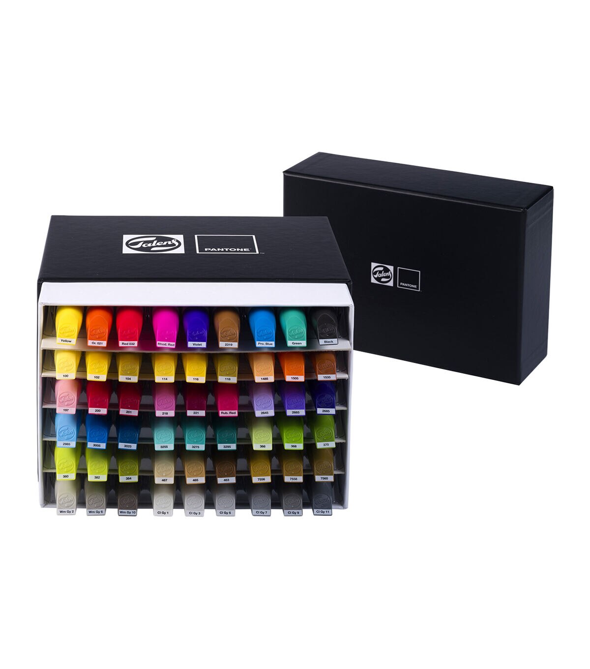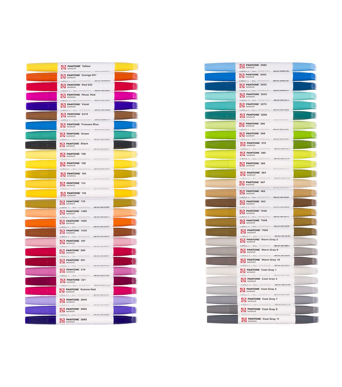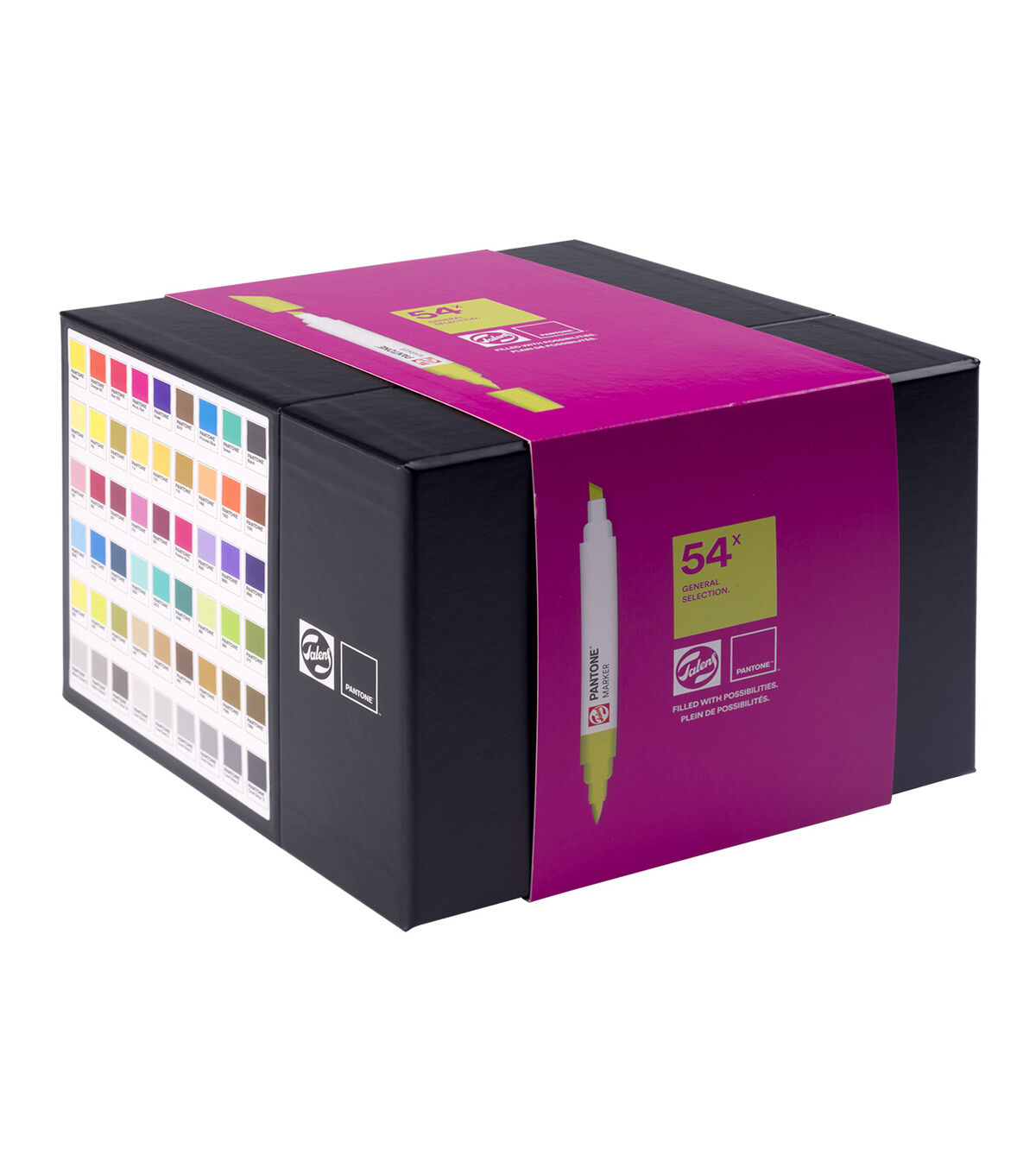 Sketch, draw and design in Pantone colors with Talens Pantone markers. These High quality markers contain pigmented, water based ink in vivid colors based on the Pantone Matching System and trade. Meticulously formulated, adjusted and tested by Talens, co designed and approved by Pantone. This set contains 54 Talens Pantone markers and comes in a sturdy box with a sleek, horizontal design, ensuring your markers are always ready to use with optimal ink flow to both nibs. Thanks to the color names and numbers on the caps, you can easily pick the right color for your work. Bring your ideas to life and discover the possibilities. Each marker features two nibs, offering the ultimate flexibility, a brush tip for details and fine lines, and a chisel tip for broad strokes and bold color blocks. The ink dries quickly and is waterproof when dry, which makes it perfect for layering. Use the markers with our unique Talens Pantone paper for optimal results with the Pantone colors. When your marker runs out of ink, refill it using Talens Pantone marker ink in the same color. Both are available in an extensive range of 108 colors, allowing you to create freely. , Contents, 54 Talens Pantone markers (Yellow and ndash, Orange 021 and ndash, Red 032 and ndash, Rhod. Red and ndash, Violet and ndash, 2319 and ndash, Process Blue and ndash, Green and ndash, Black and ndash, 100 and ndash, 102 and ndash, 104 and ndash, 114 and ndash, 116 and ndash, 118 and ndash, 1485 and ndash, 1505 and ndash, 1535 and ndash, 197 and ndash, 200 and ndash, 201 and ndash, 218 and ndash, 221 and ndash, Rubine Red and ndash, 2645 and ndash, 2665 and ndash, 2685 and ndash, 2985 and ndash, 3005 and ndash, 3025 and ndash, 3255 and ndash, 3275 and ndash, 3295 and ndash, 366 and ndash, 368 and ndash, 370 and ndash, 380 and ndash, 382 and ndash, 384 and ndash, 467 and ndash, 465 and ndash, 463 and ndash, 7556 and ndash, 7558 and ndash, 7560 and ndash, Warm Gray 2 and ndash, Warm Gray 6 and ndash, Warm Gray 10 and ndash, Cool Gray 1 and ndash, Cool Gray 3 and ndash, Cool Gray 5 and ndash, Cool Gray 7 and ndash, Cool Gray 9 and ndash, Cool Gray 11). , strong Talens Pantone markers. Approved color simulation to the Pantone Matching System and trade. High quality markers with two nibs, chisel and brush. Fast drying water based ink, waterproof when dry. Lightfast thanks to pigment based formula. Use with Talens Pantone paper for optimal color results. No paper damage with repeated layering. Large, refillable reservoir (refill with Talens Pantone marker inks). Available in 108 colors and various sets. Store horizontally to guarantee optimal ink flow in both nibs. Proudly designed and produced in Europe.