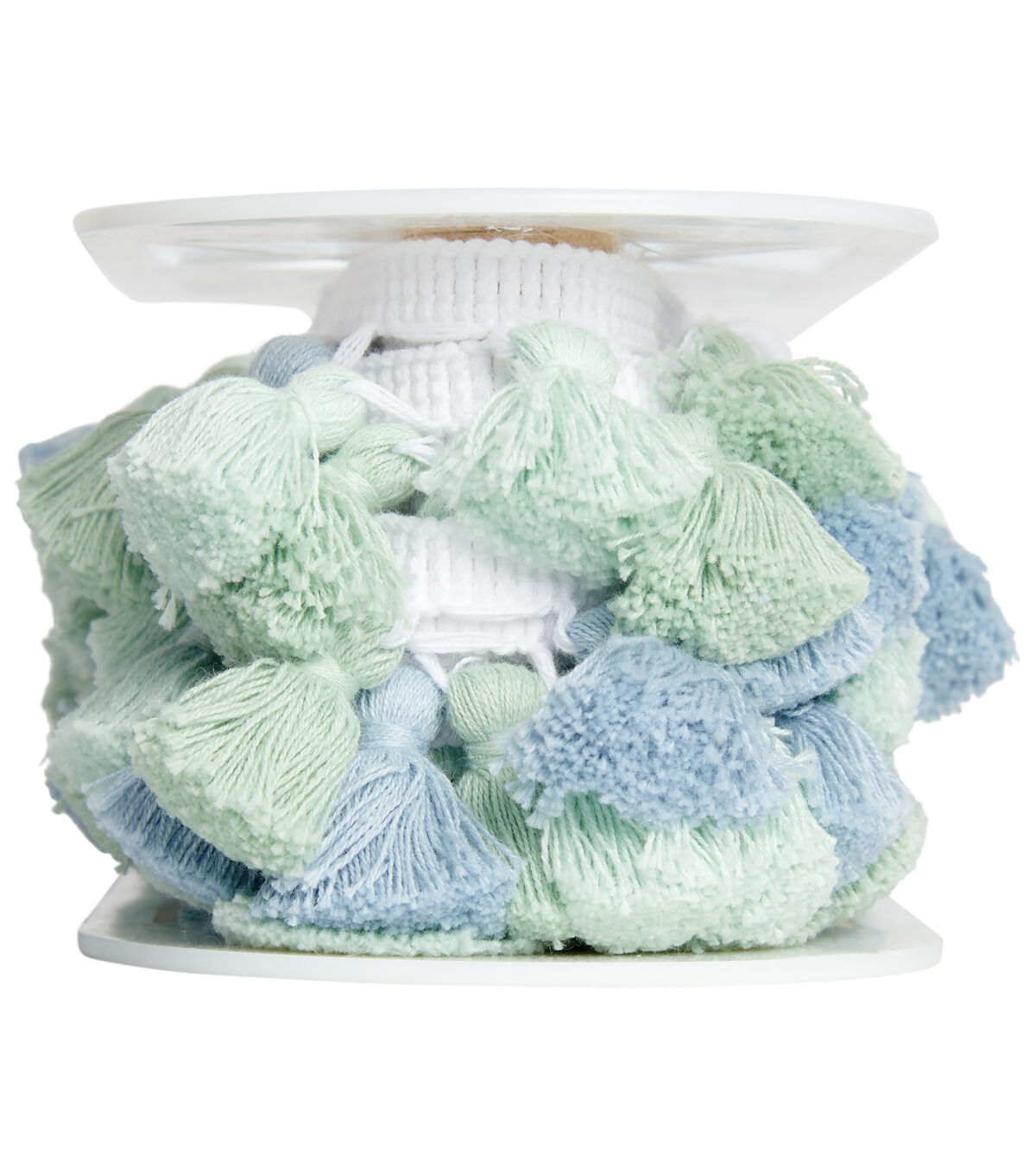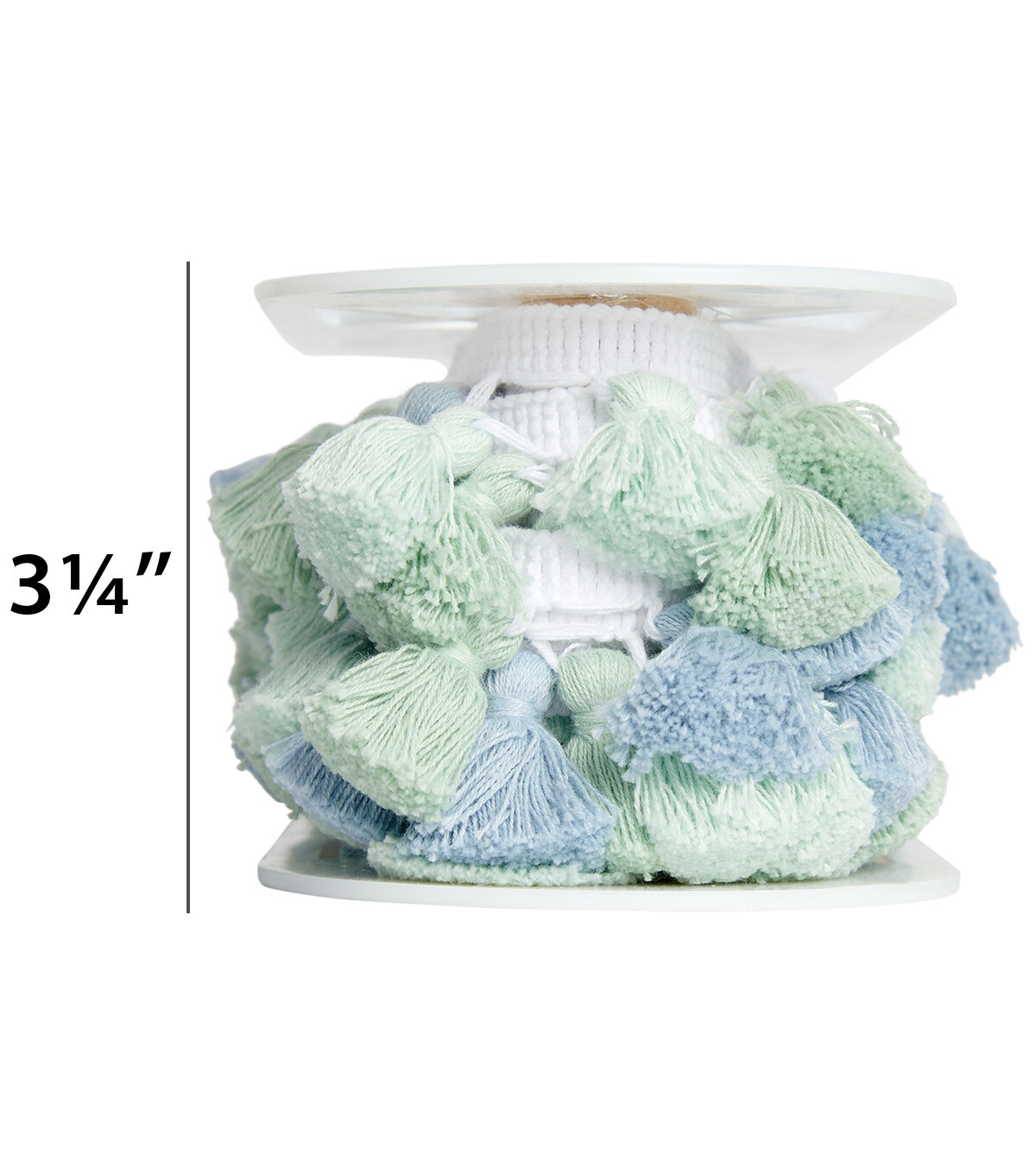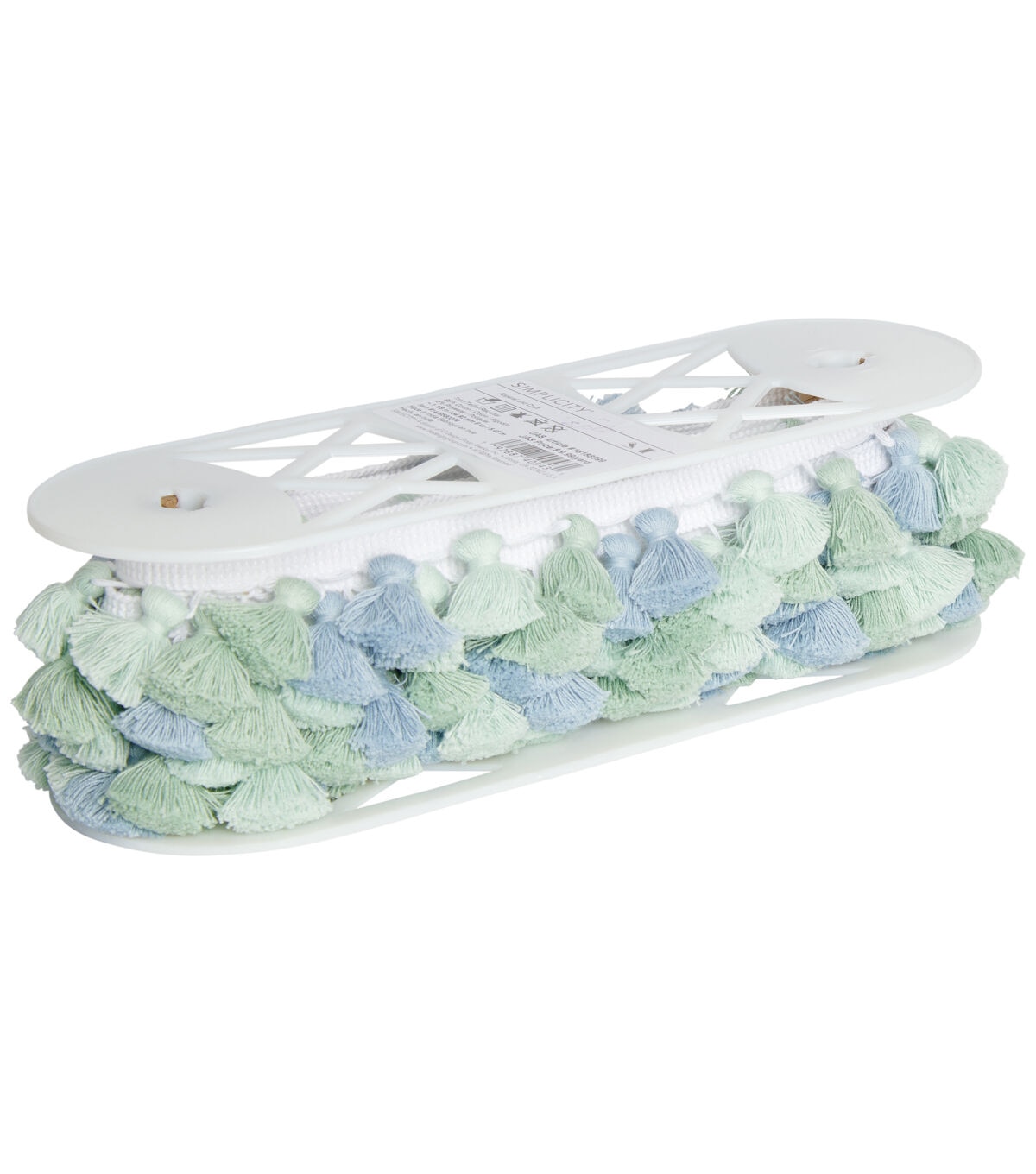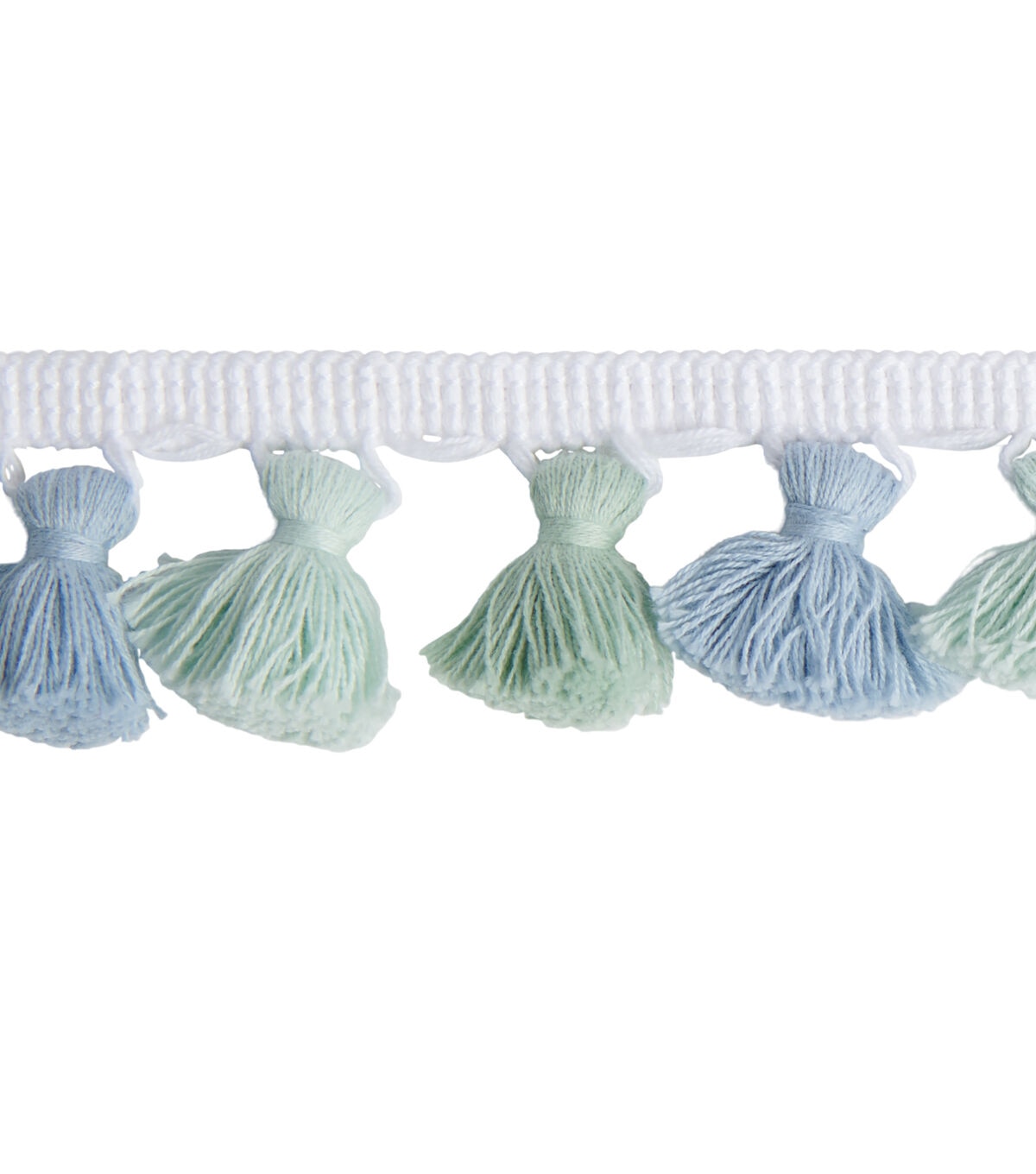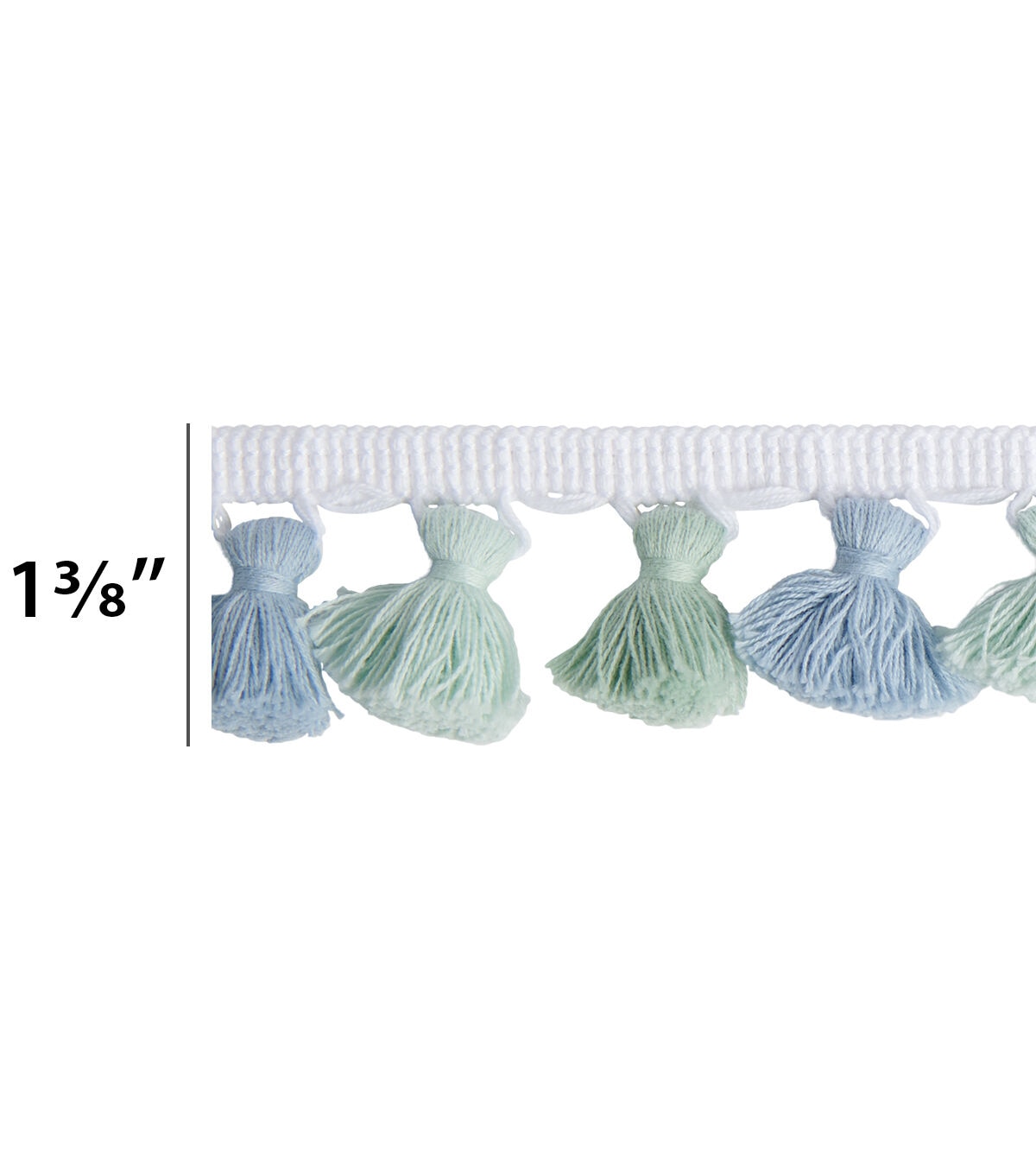 A multi blue and green tassel trim is 1 1/2 inches and cotton/polyester blend. This fringe is perfect for home décor or any DIY creation.