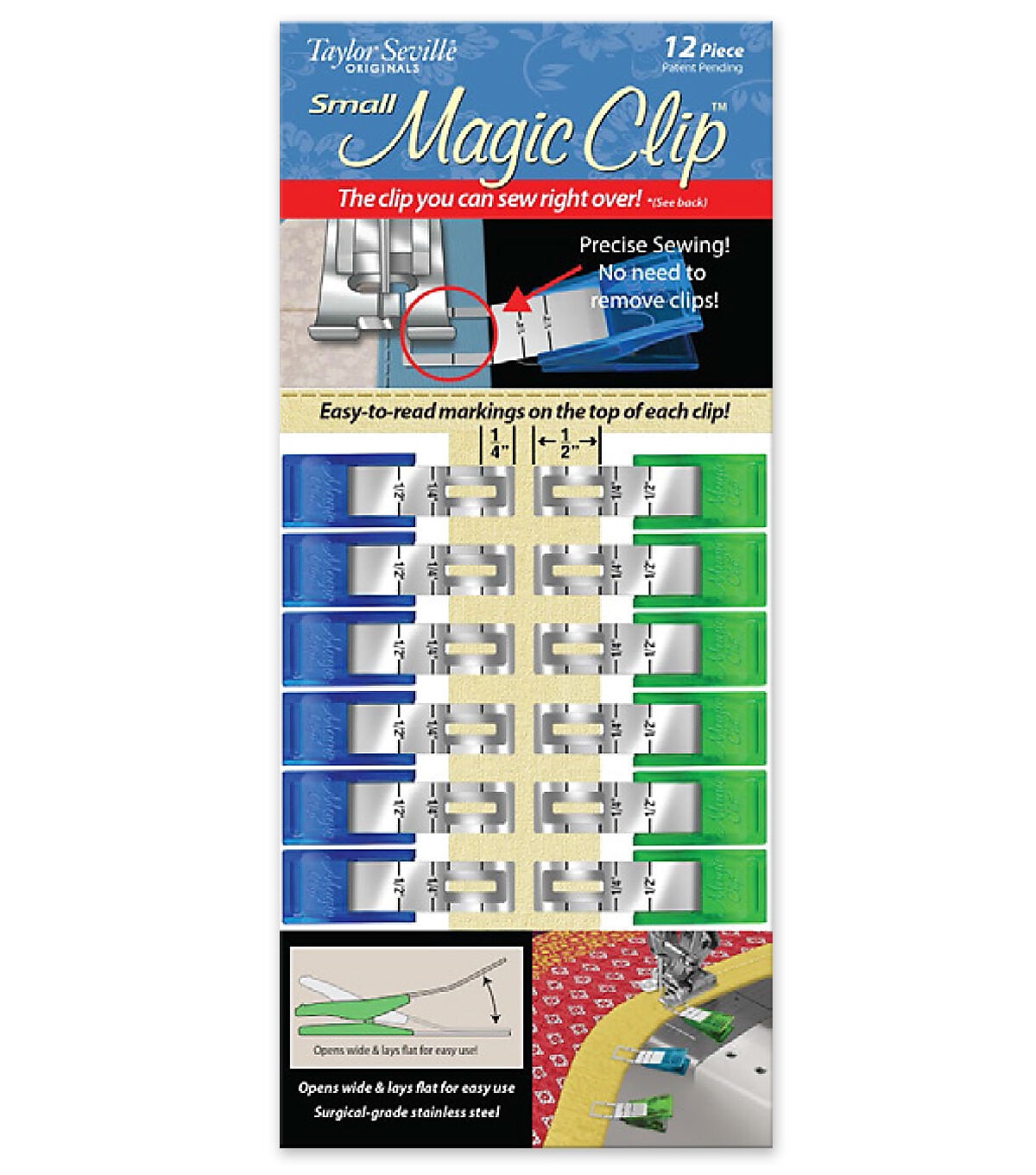 The Taylor Seville Small Stainless Steel Magic Clips ensure precise sewing every time. You can use these clips for marking 0.25-inch increments. These clips open wide and lay flat for convenience. They need not be removed while sewing. This pack contains 12 magic clips made of surgical-grade stainless steel.