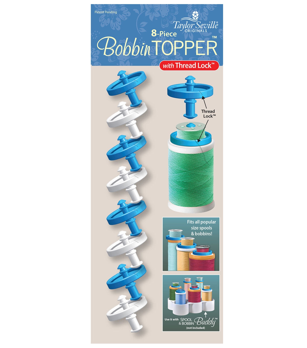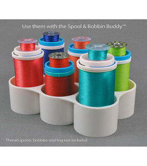 Sewing machine projects will be easier and more fun with the Taylor Seville Originals Bobbin Toppers with Thread Lock. These bobbin toppers snap into place and are designed with a thread lock to eliminate tangles. This eight-piece set fits all popular sizes of thread spools. You can use it with the Taylor Seville Originals Spool and Bobbin Buddy, sold separately.