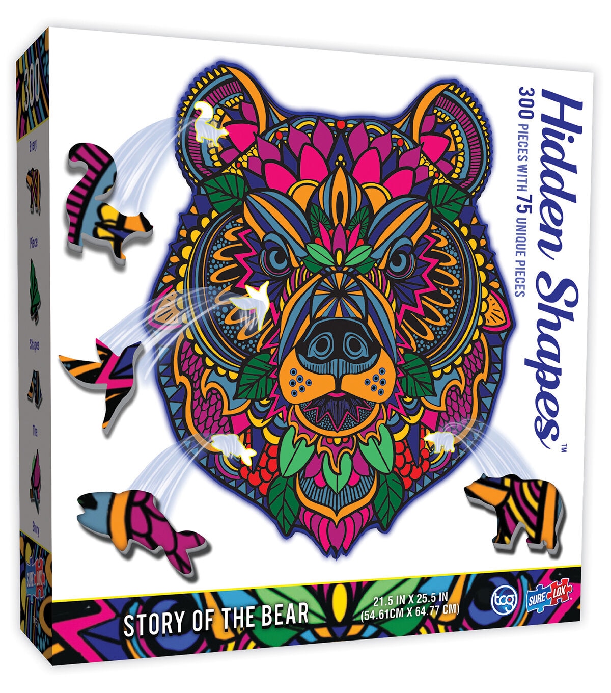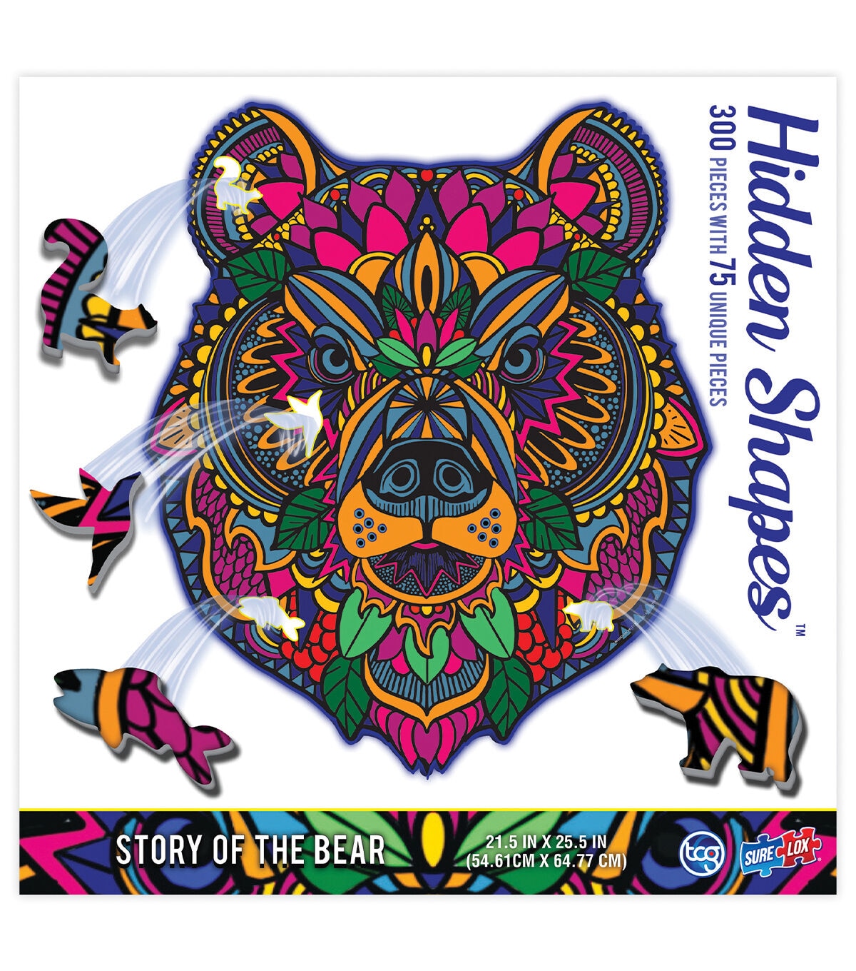 Join in the adventure in the mountains and discover the 75 hand drawn specialty shaped pieces that shape the story of the Bear in this Hidden Shapes 300 piece puzzle! Every piece fits together to tell the tale hidden amongst the puzzle. This 300 piece puzzle has 75 unique shaped hand drawn pieces and is crafted to be an excitingly new puzzle experience. The completed size is an impressive 21.5” wide x 25.5” long and features vibrant patterns in the image to enhance your experience. Comes in a beautiful, colorful box measuring 7.875” wide x 7.875 high x 2” deep which you can display and use to store your puzzle when not in use. Recommended for ages 14+