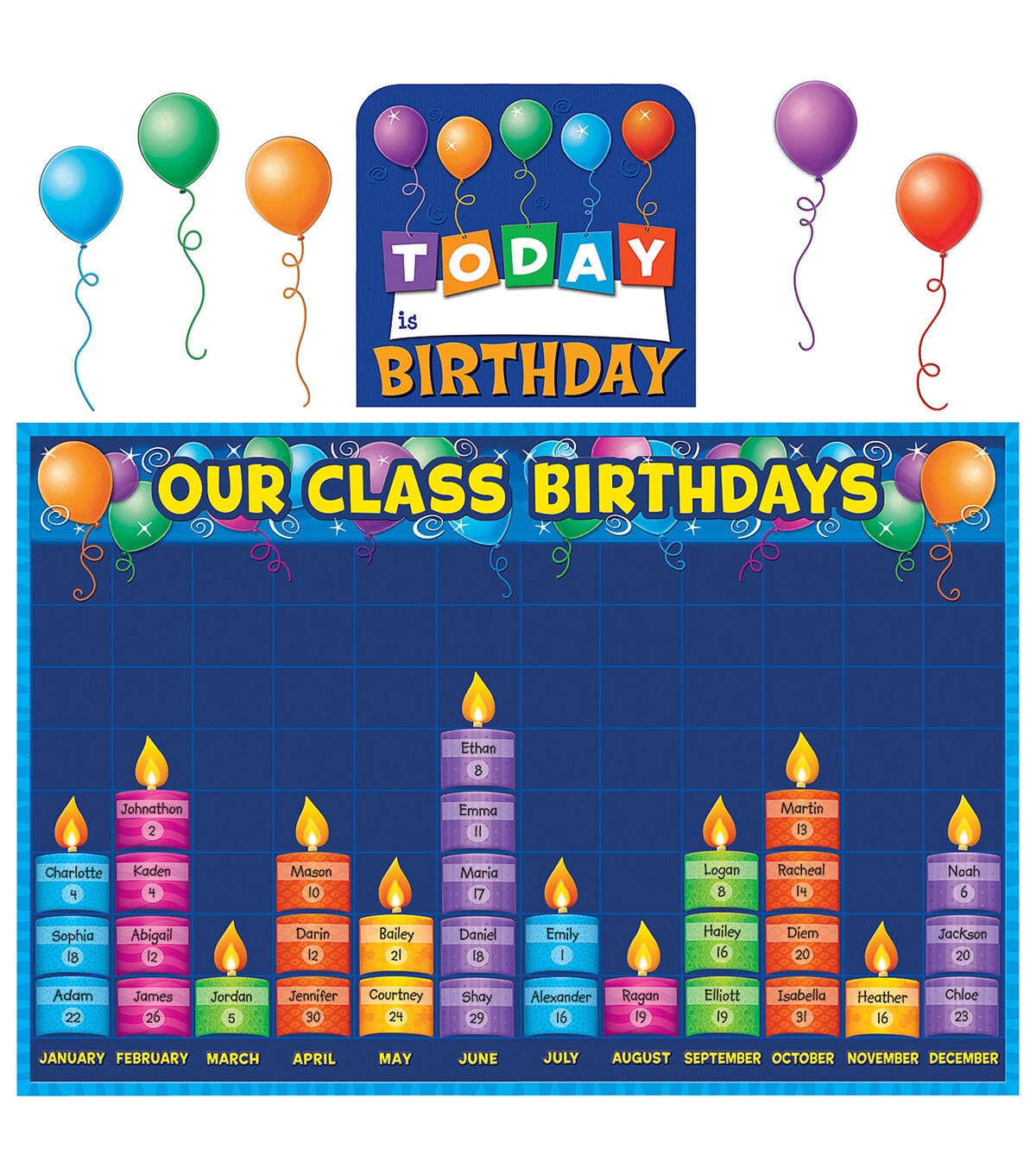 Celebrate class birthdays with this graph chart. Add a candle for each student’s birthday to build the graph. Each bulletin board set includes 80 pieces: 1 birthday graph (2 pieces), 60 candle, 12 flames, 1 birthday sign, 5 balloons, plus a Bulletin Board Guide with set-up instructions and activity suggestions. Birthday Graph is 2 pieces and measures 36" x 24" when assembled. Sold as a pack of 2 complete bulletin board sets.