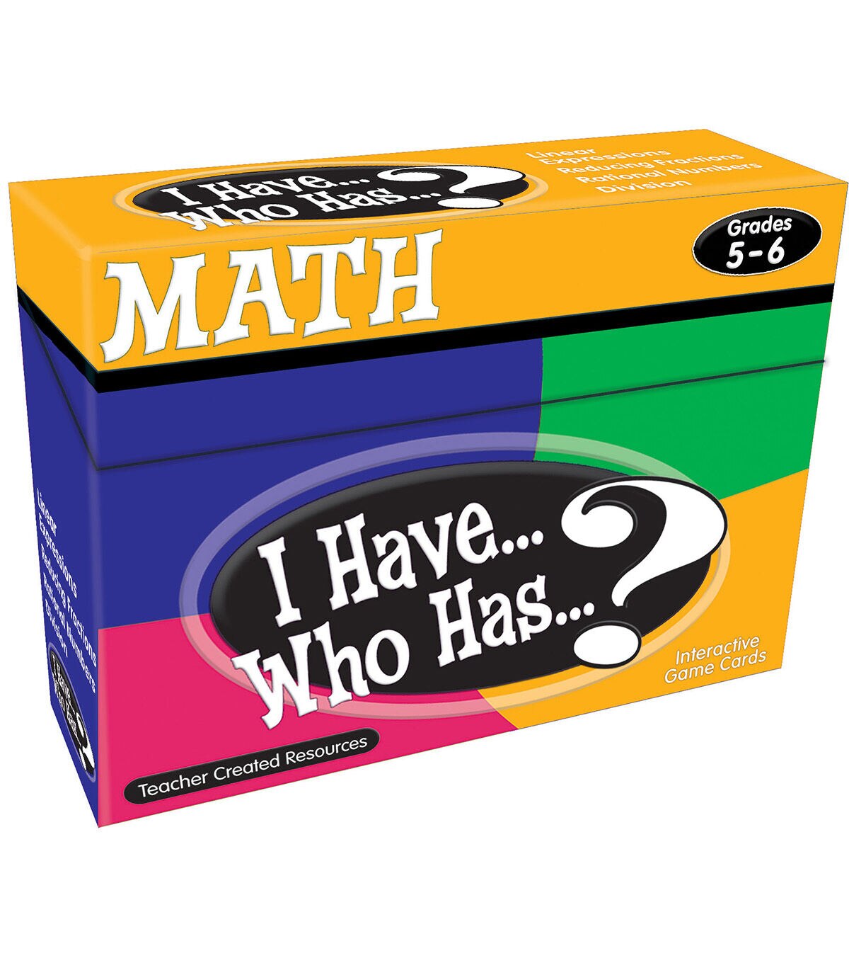 The entire class can have fun while practicing skills in language arts and math. Hand out all 37 cards. (Some players may get more than one card.) The student whose card reads, "I have the first card. Who has...?" begins. The student whose card has the answer to that question responds and then asks a different question. This continues until the person with the last card gives the final answer and then reads, "This is the end of the game!" Each box provides 4 sets of cards for 4 different games. Game Titles: Expressions, Division, Rational Numbers, Reducing Fractions.