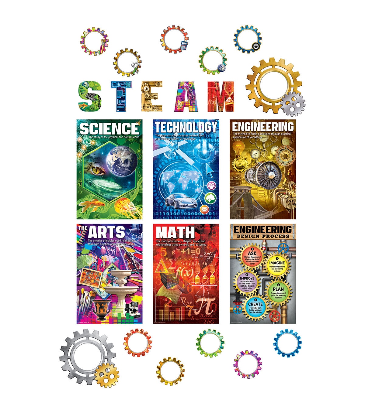 Encourage inquiry, innovation, development, and design with this colorful and informative STEAM bulletin board set. The posters highlight each academic discipline that combine to make up the STEAM curriculum. Each large STEAM letter is about 5.75" tall. Includes six posters each measuring 12" x 18" and 14 geared accent pieces. Includes a teacher's guide. 25 total pieces.