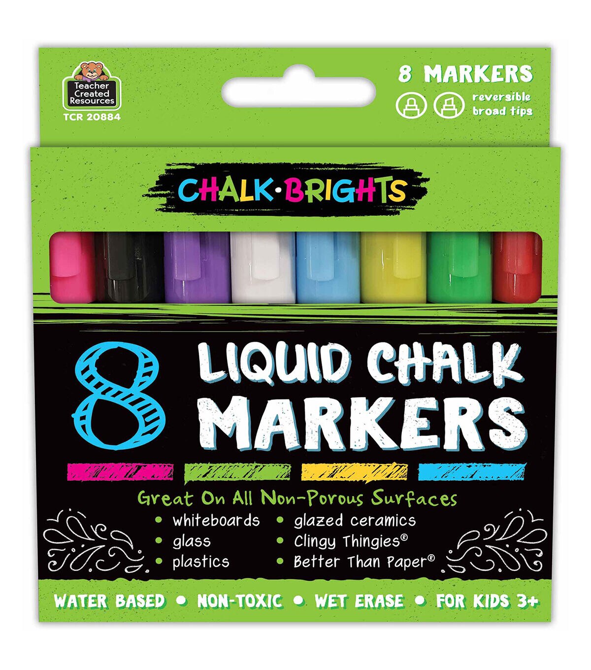 Chalk Brights Liquid Chalk Markers are broadline markers with reversible tips for either thick or thin lines. They are water based, non-toxic, and wet erase. Clean with water to easily change up your art! Great on all non-porous surfaces. Includes 8 markers. For ages 3+. Conforms to ASTM-D4236 &EN-71. Contains water, resin, and titanium dioxide (TiO2).