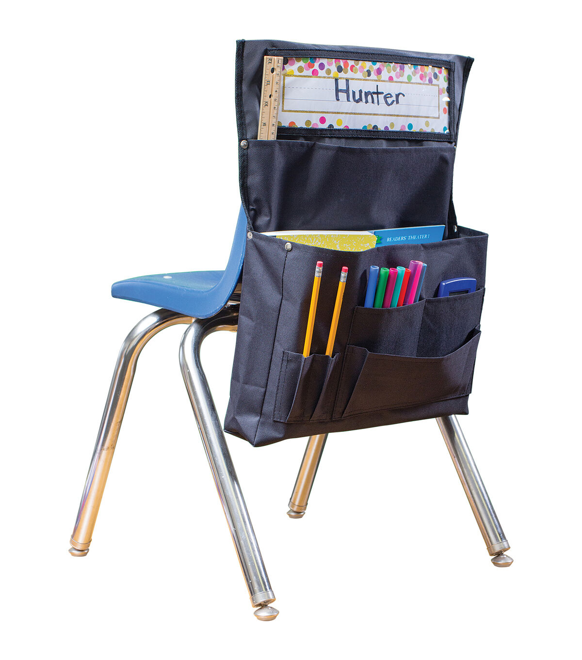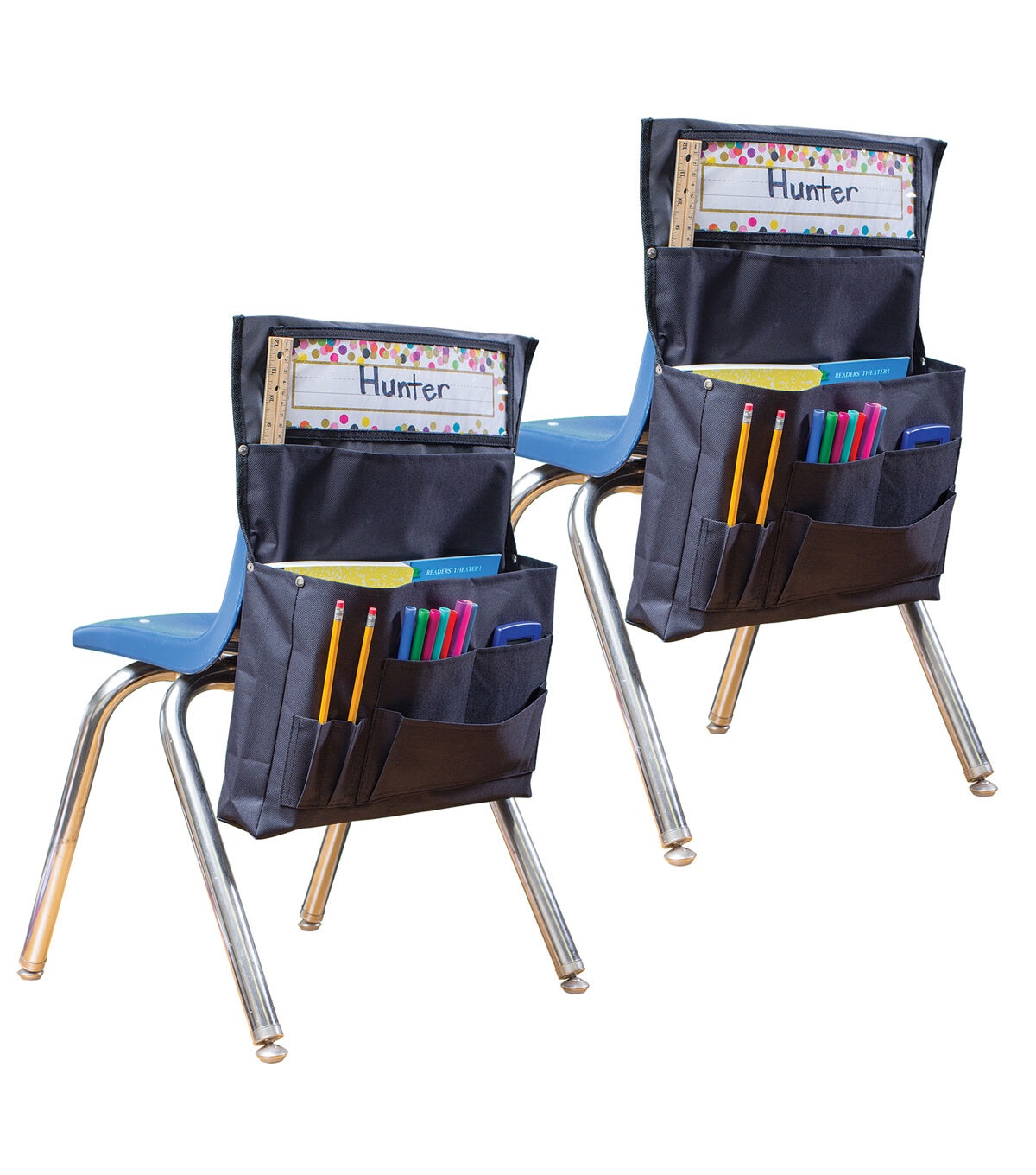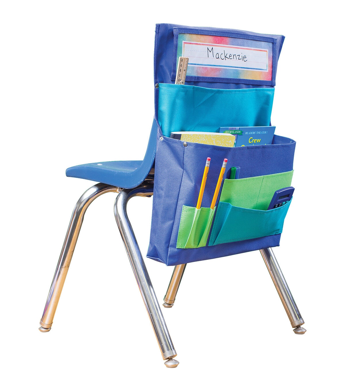 Organize supplies with this convenient storage solution. Clear pocket holds name plate up to 3.5" x 11.5". 7 storage areas: Large pockets are ideal for workbooks, folders, etc. and small pockets are ideal for supplies. Made with durable canvas. Metal rivets provide extra strength at stress points. Easily slides over back of chair up to 15" wide, 5" from top. Measures 15.5" x 18". Sold as a pack of 2 chair pockets.