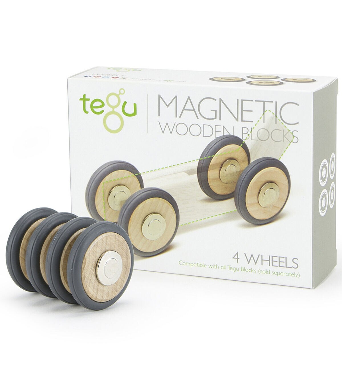 The perfect companion for any Tegu Block set! Four Magnetic Wooden Wheels integrate seamlessly with an existing set of Tegu Blocks to mobilize any creation for hours of fun. Buy 1 4-pack for some rolling fun. Buy 3 4-packs to turn any Tegu Block set into a vehicular masterpiece. Includes 4 Magnetic Wooden Wheels. For ages 1+. Warning: This product contains small magnets. Swallowed magnets can cause complications leading to serious infections and death. Seek immediate medical attention if magnets are swallowed or inhaled.