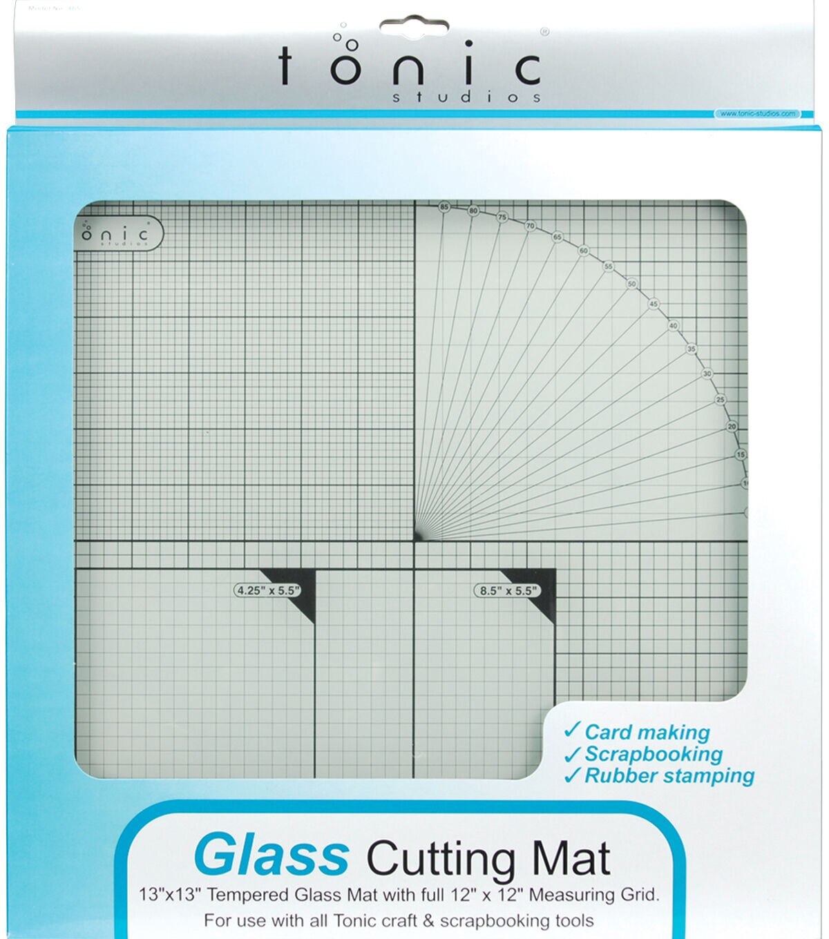 TONIC STUDIOS-Tempered Glass Cutting Mat. Use this 13x13in glass cutting mat with your Tonic and other scrapbook, card making and paper craft cutting tools. This mat will protect your surfaces and give you a clean durable surface to cut on. This mat features an overall 12x12in grid with a 4-1/4x5-1/2in, 8-1/2x5-1/2in grids and a 6x6in diagram for ever angle from 0 to 90 in 5 degree increments. Imported.